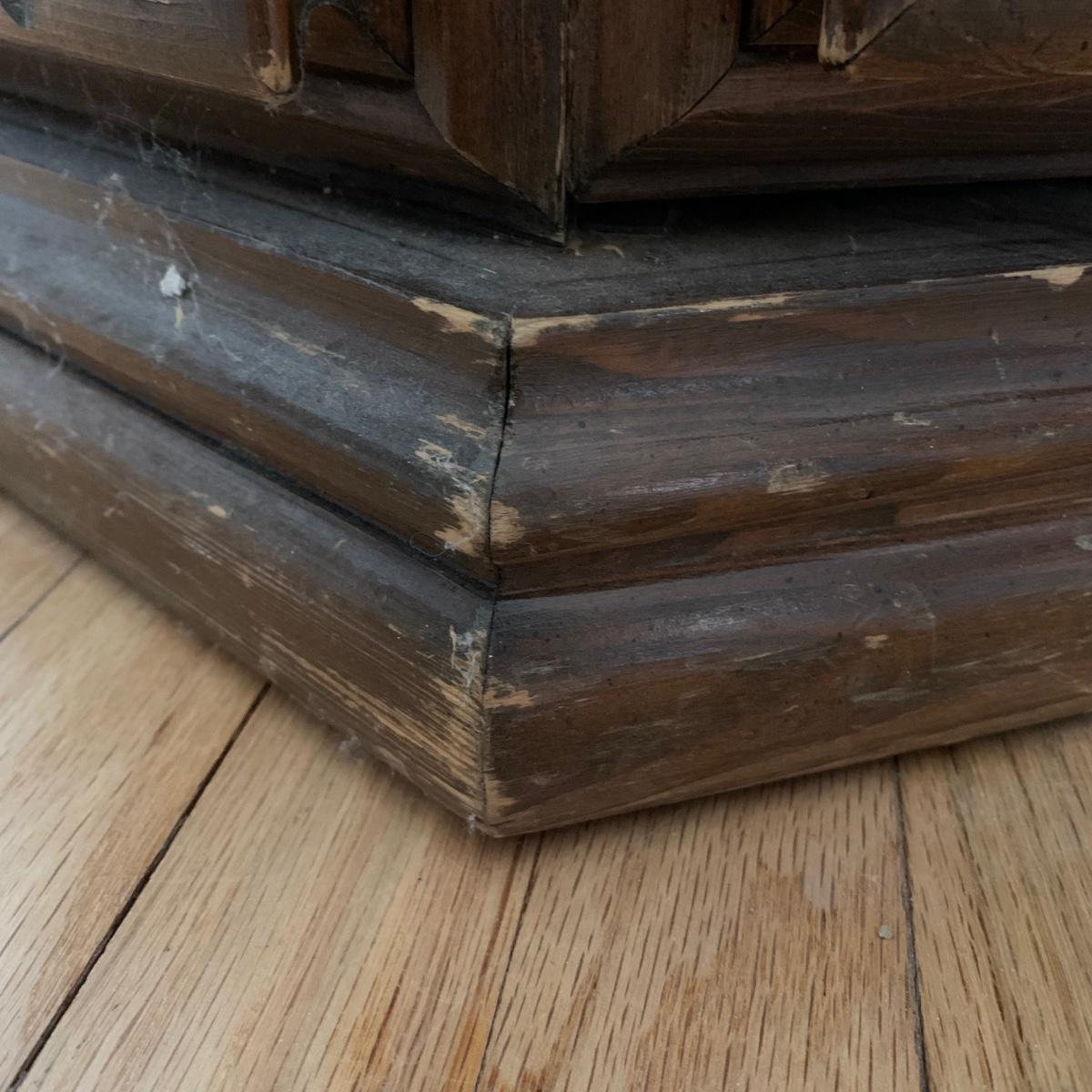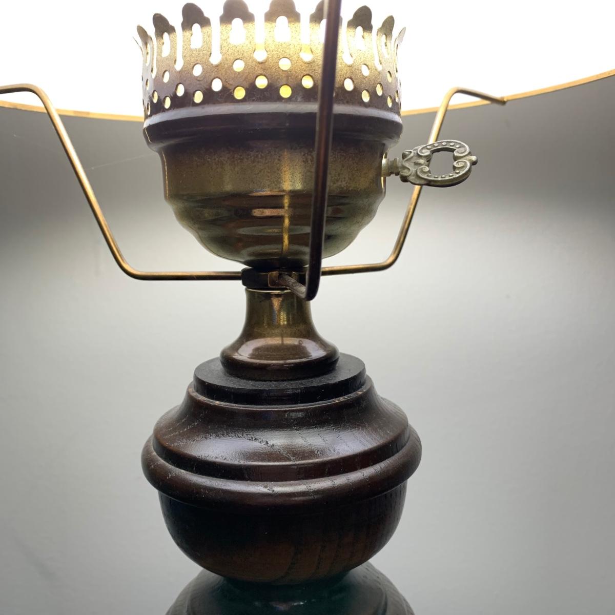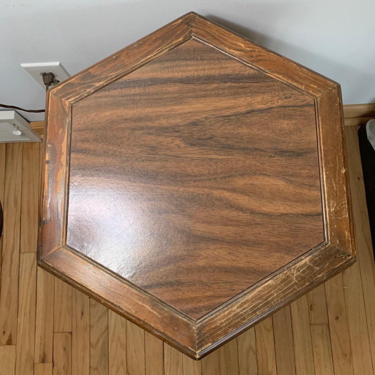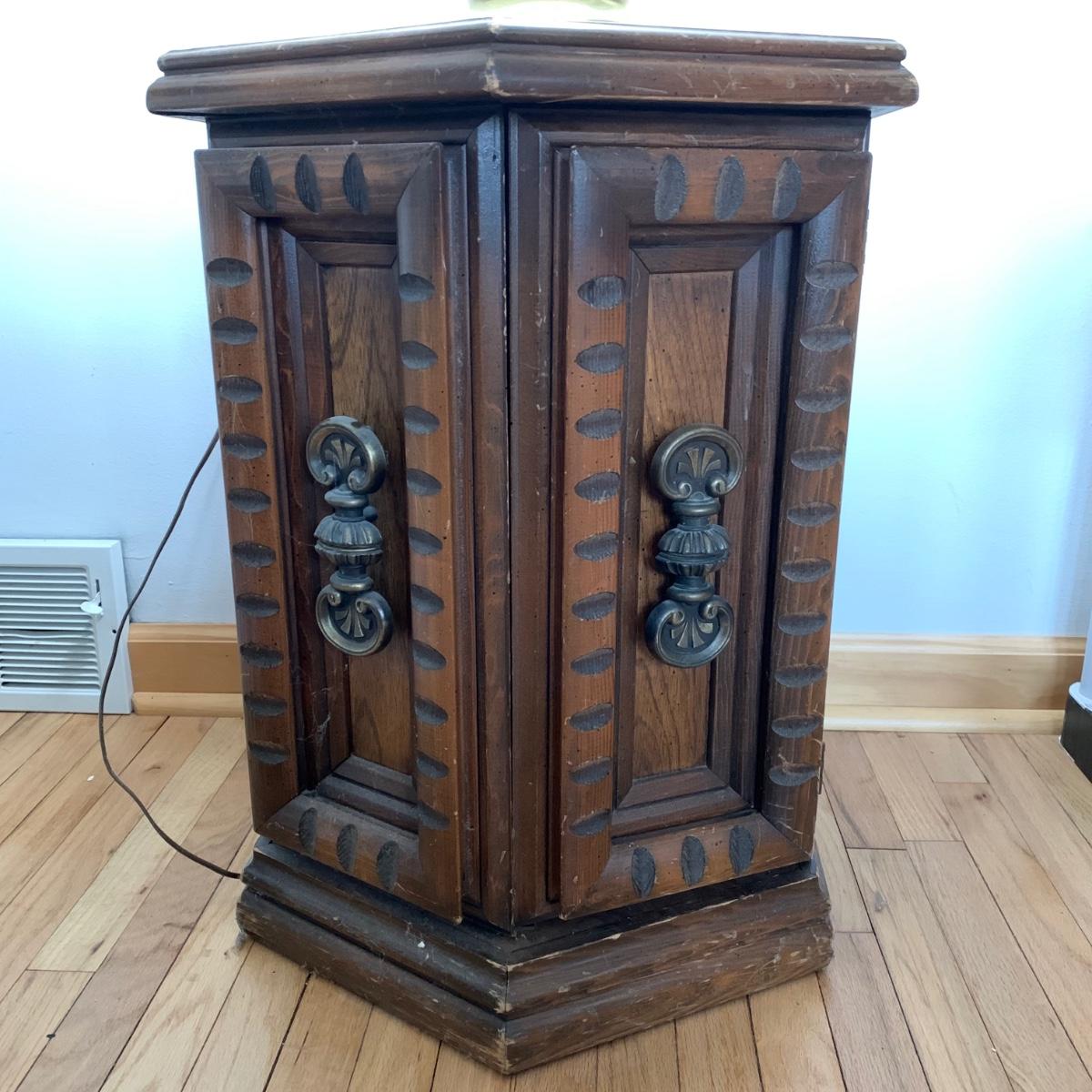 LOT 18 A: Vintage Lamp W/ Milk Glass Swirl Shade, Clear Glass Chimney, Wood, & Brass Base W/ A Hexagon Cupboard End Table