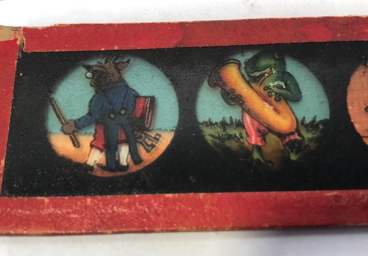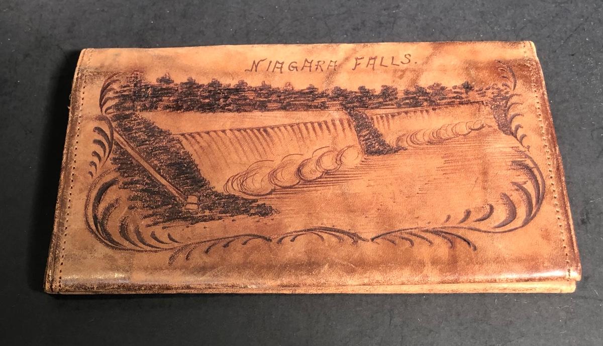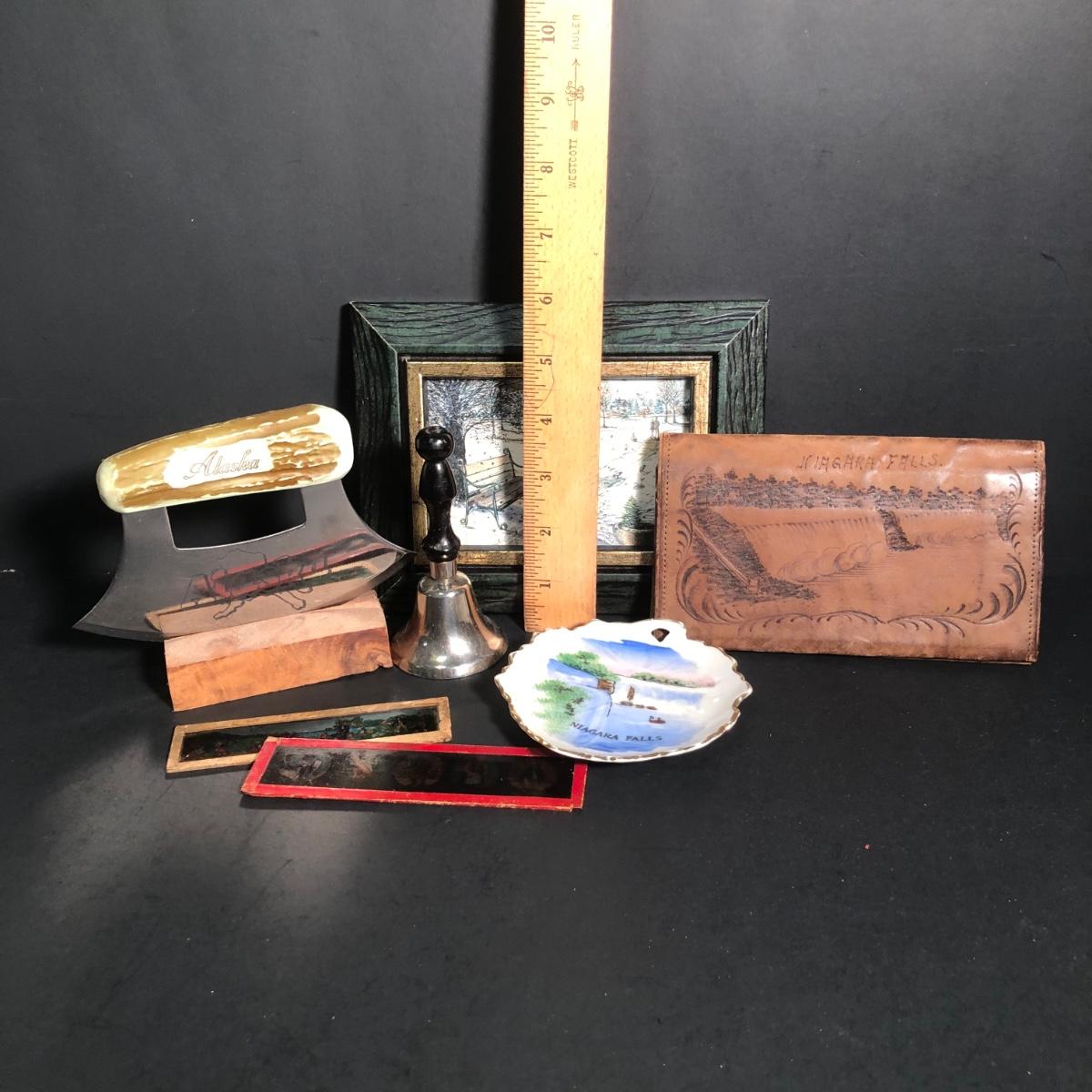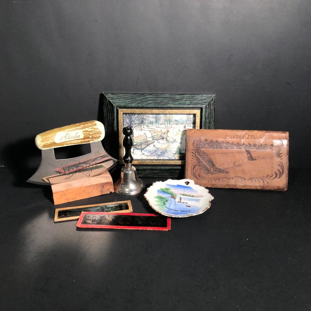 LOT 50B: Antique / Vintage Magic Lantern Glass Slides, Niagara Falls Wallet & Trinket Dish, Alaska Souvenir, Bell & Framed Print