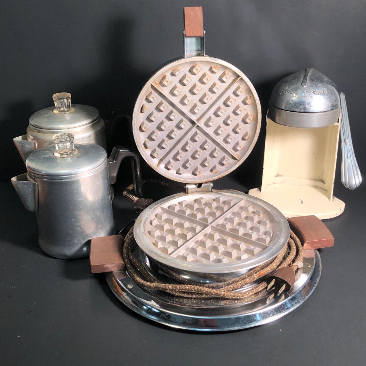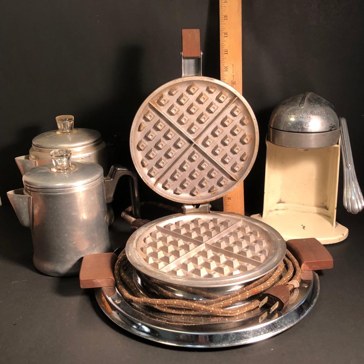 LOT 67B: Vintage Breakfast Collection - Rival Juice-O-Mat, Manning Bowman Bake Waffle Iron & Coffee Percolators