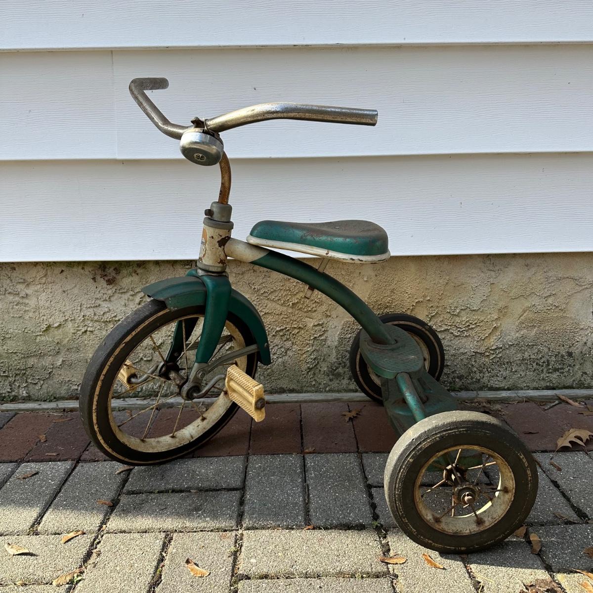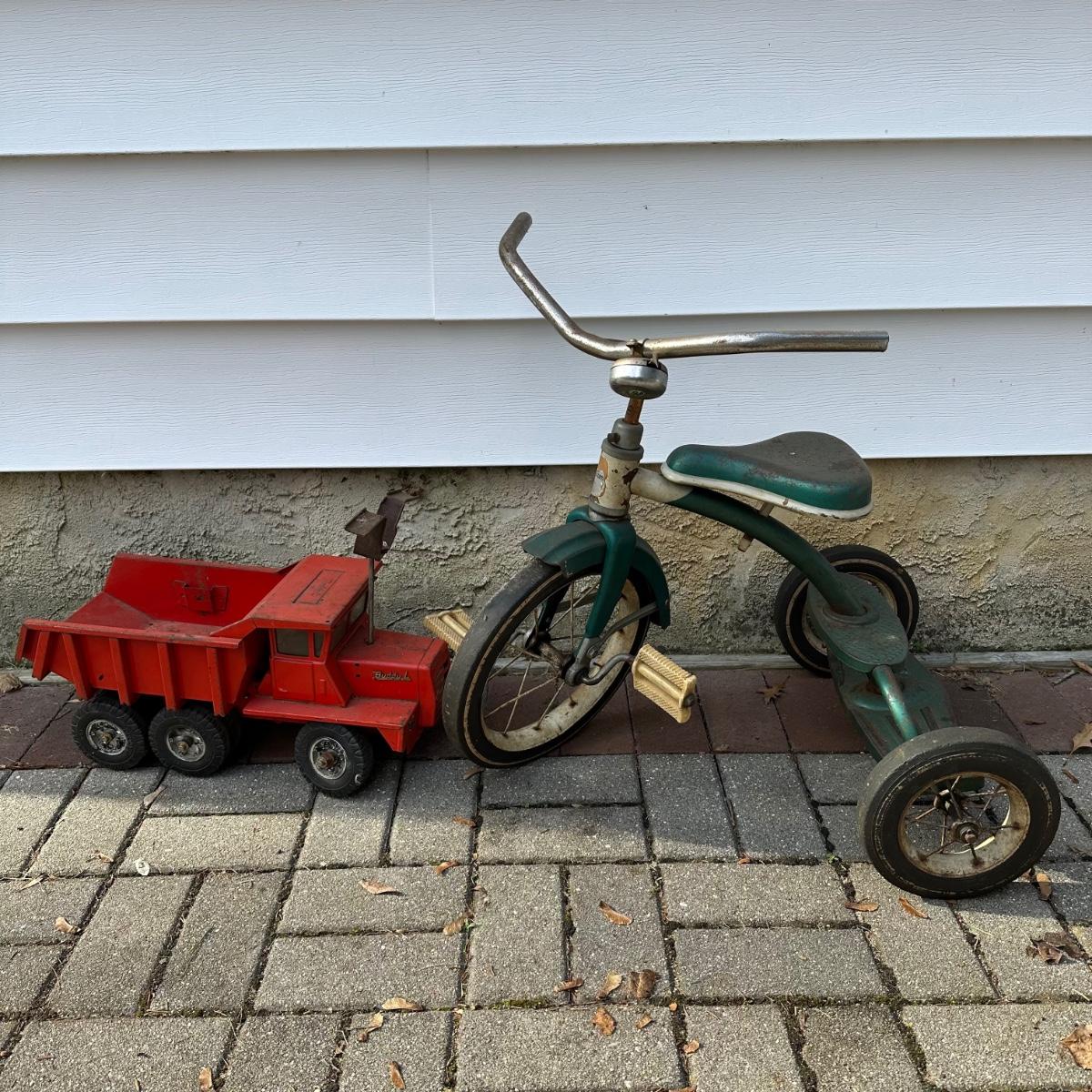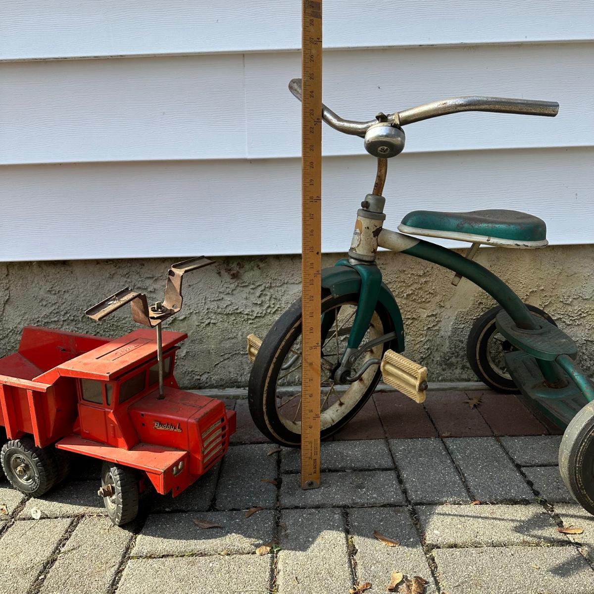 LOT 98S: Vintage Buddy L Hydraulic Dump Truck & Headstrom Tricycle