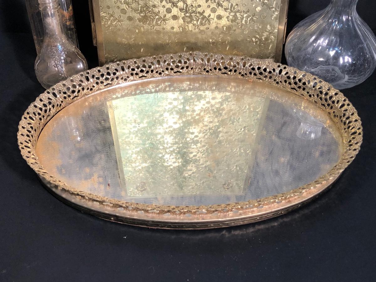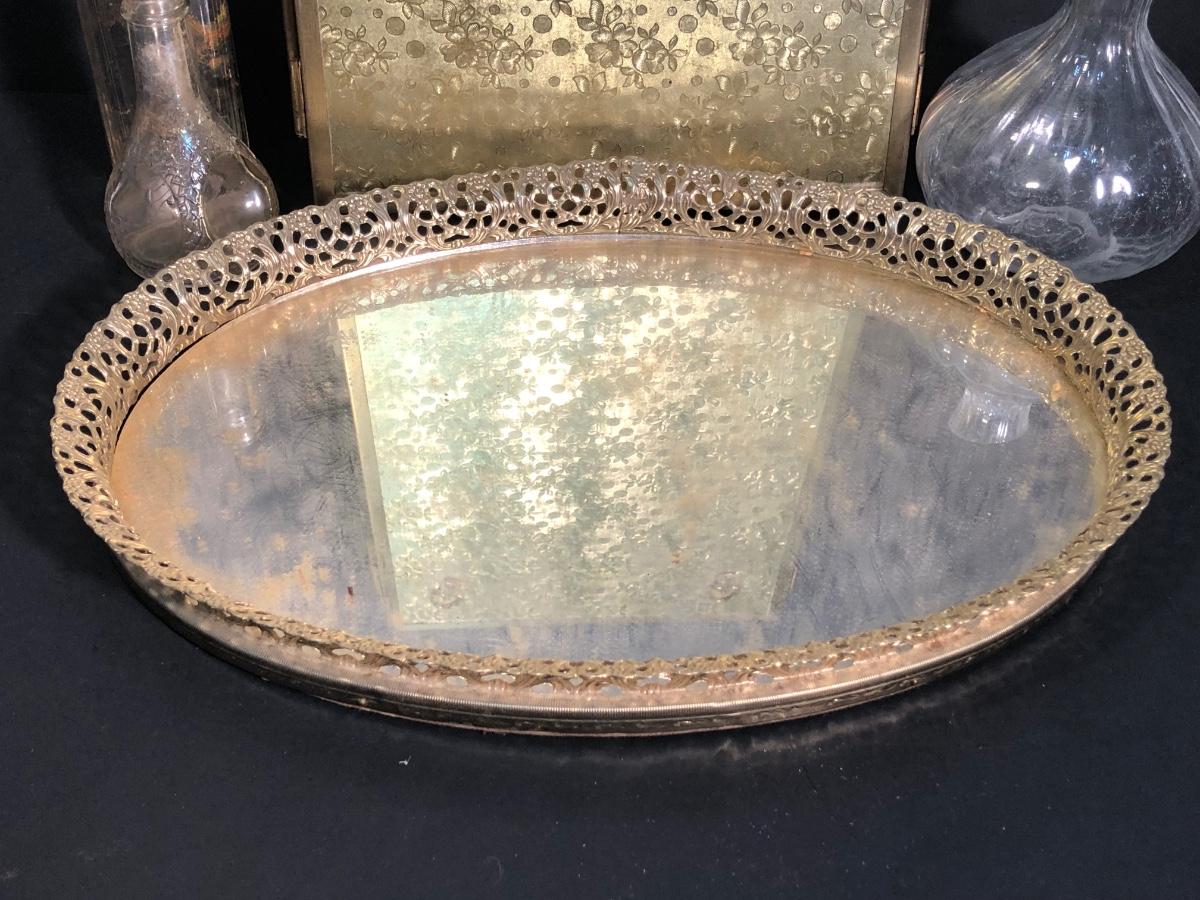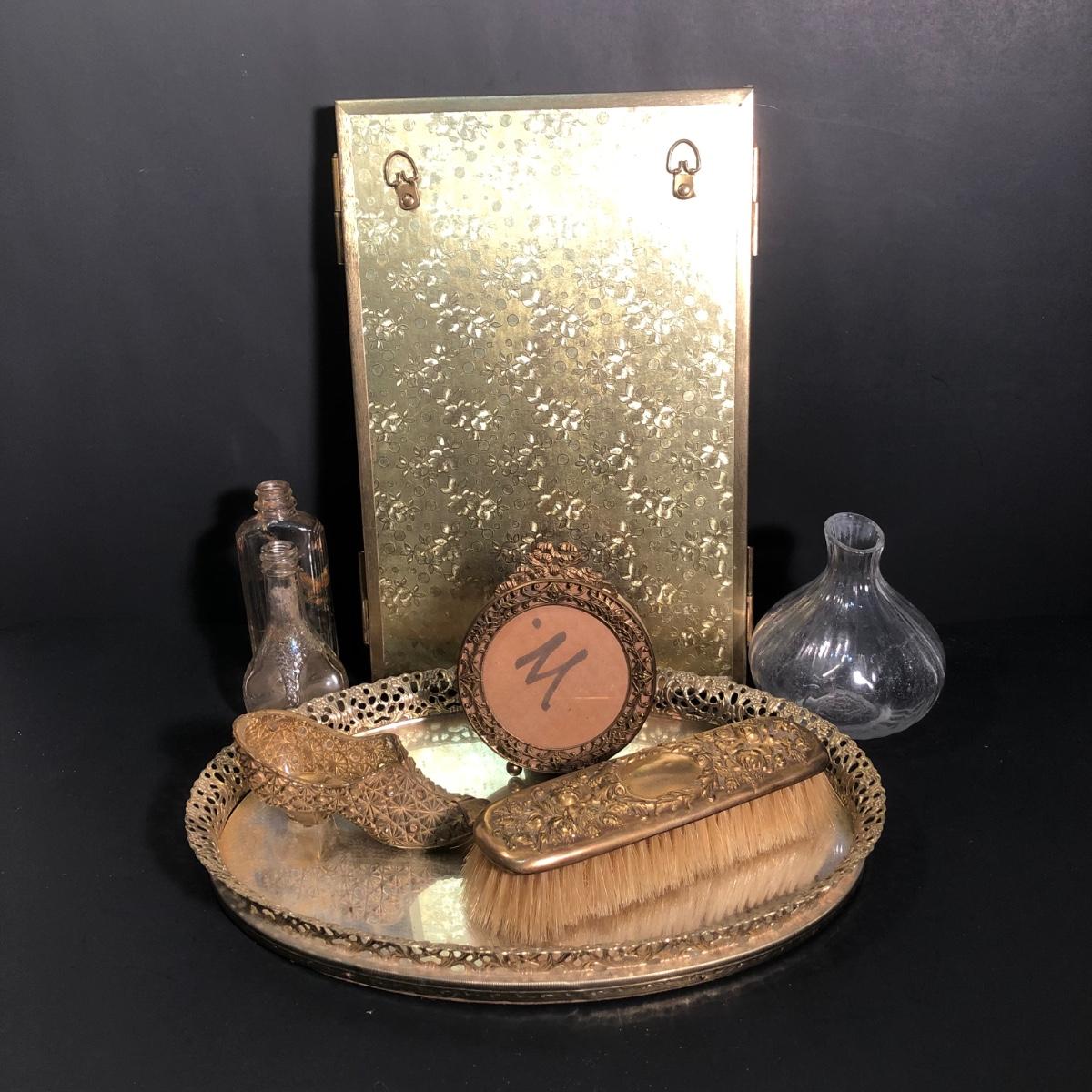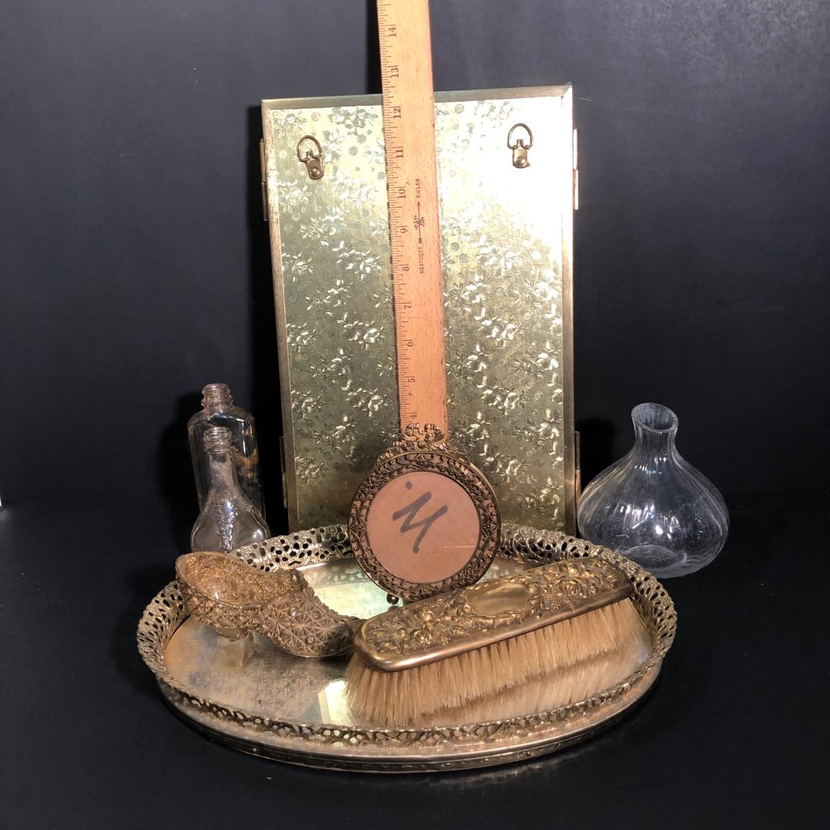 LOT 127A: Vintage Vanity Collection - Filigree Mirrored Tray, Tri-Folding Mirror, Small Frame, Ornate Brush & More
