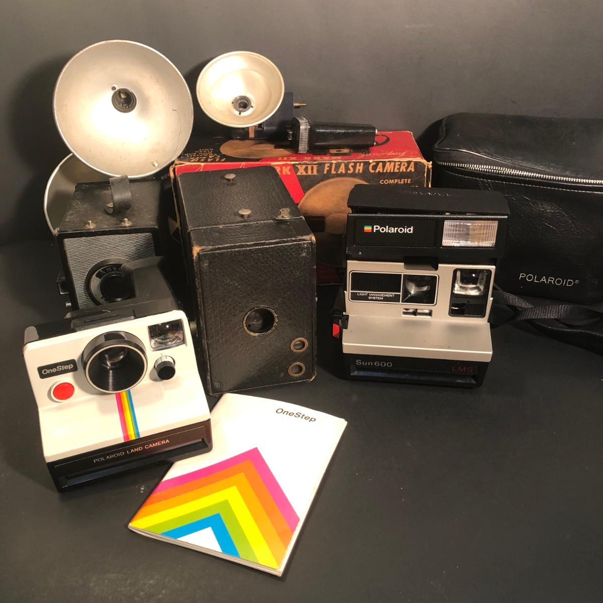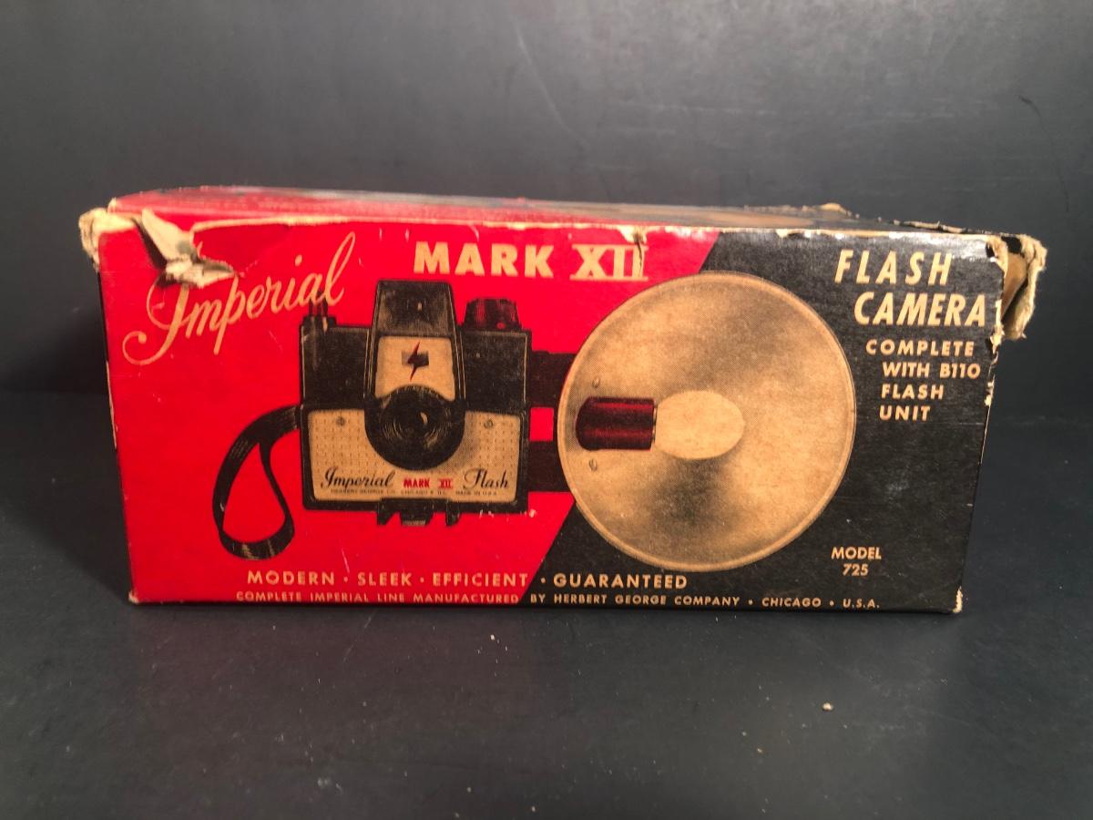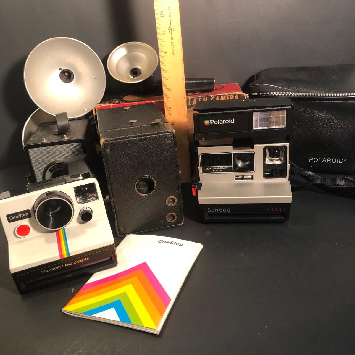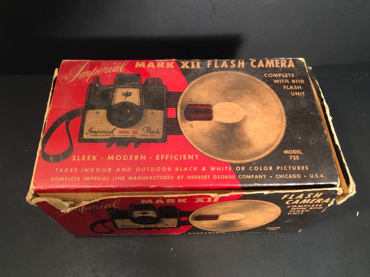 LOT 130A: Vintage Cameras & Flashes - Imperial Mark XII Flash Camera w/ Original Box, Ansco Shur-Flash Box Camera, Polaroids & More