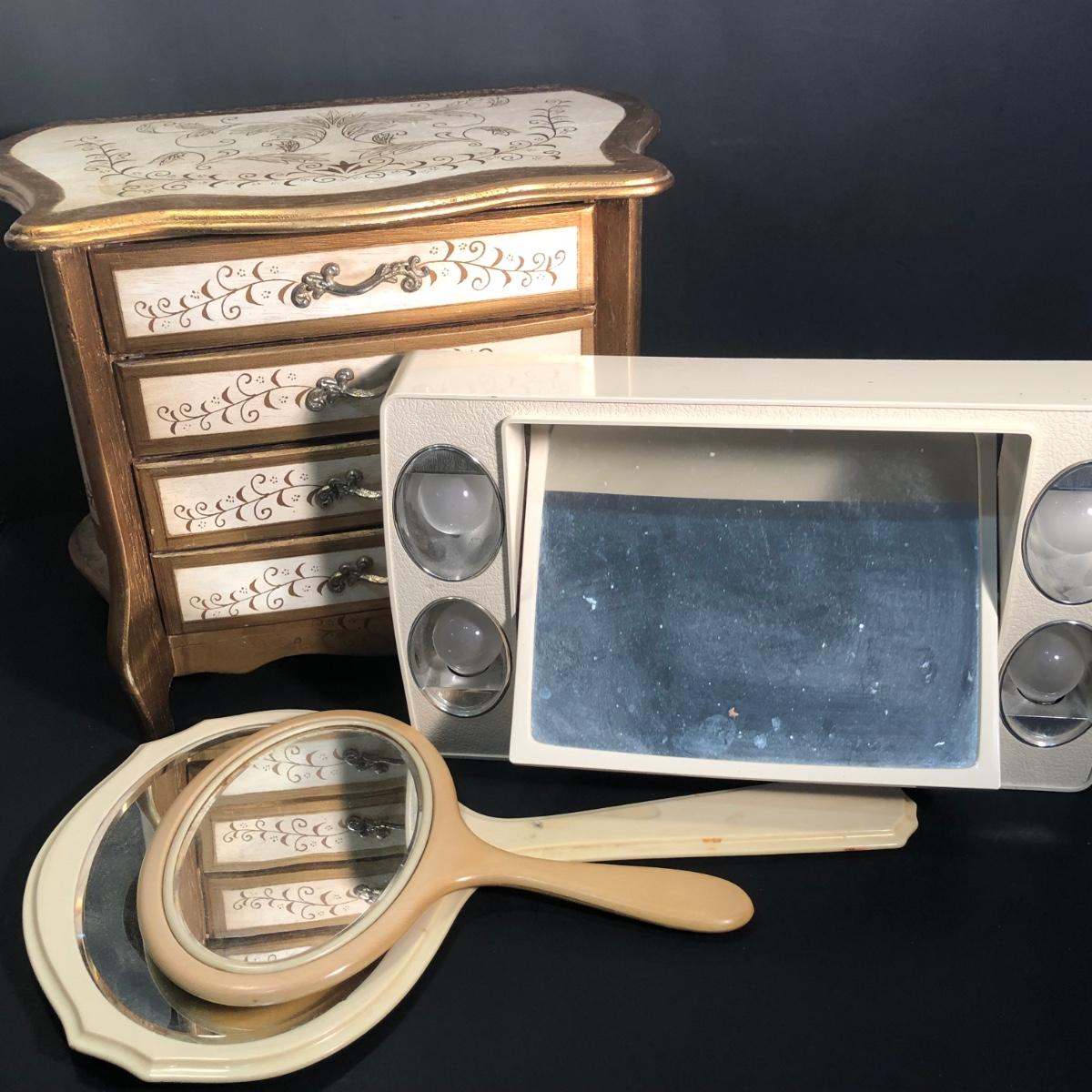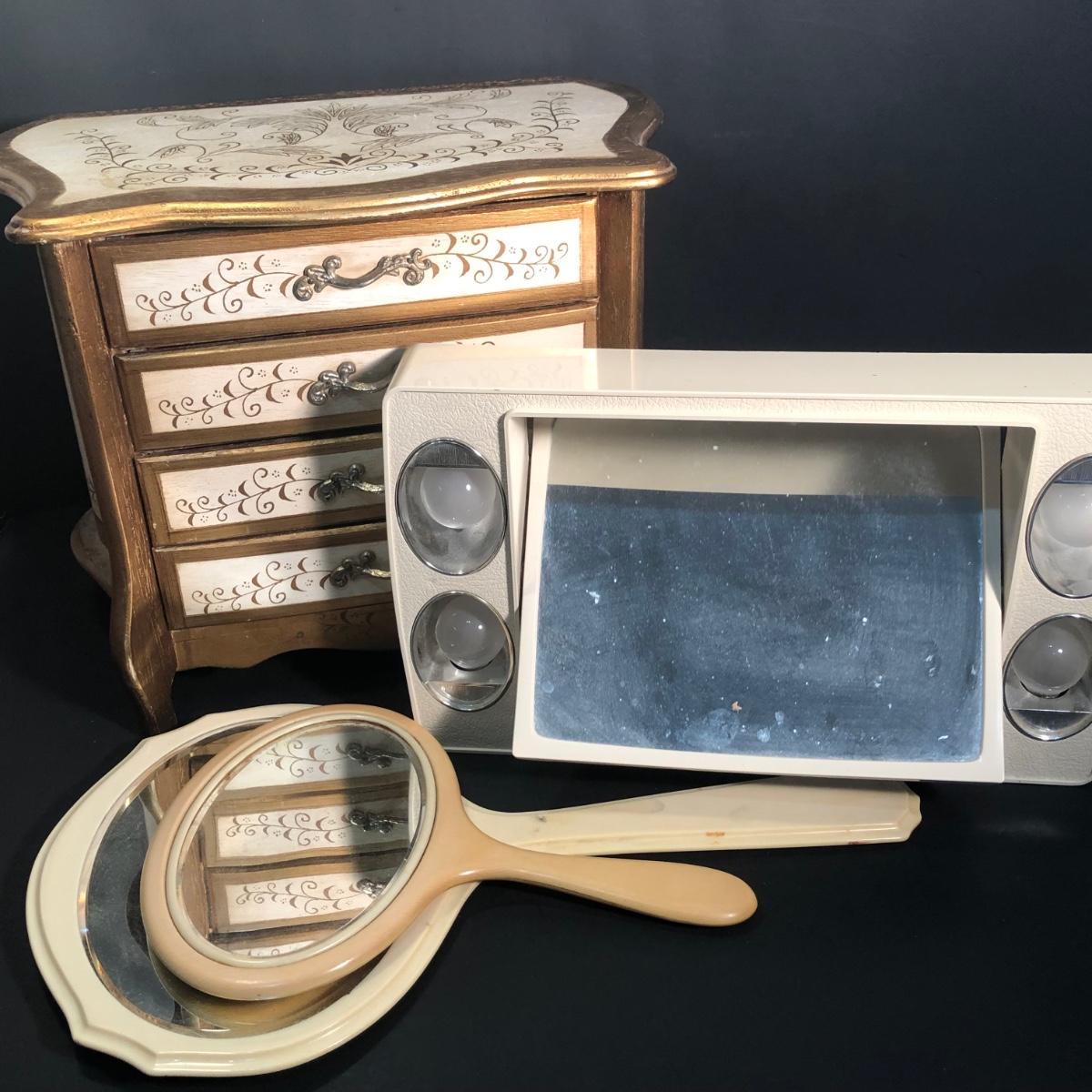 LOT 131C: Vintage Apco Musical Jewelry Box, Underwriters Laboratories, Inc. Portable Lamp Mirror & Hand Mirrors