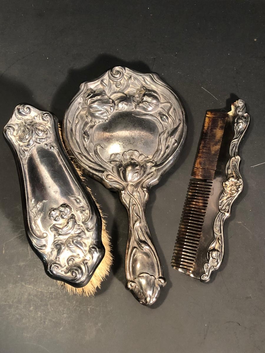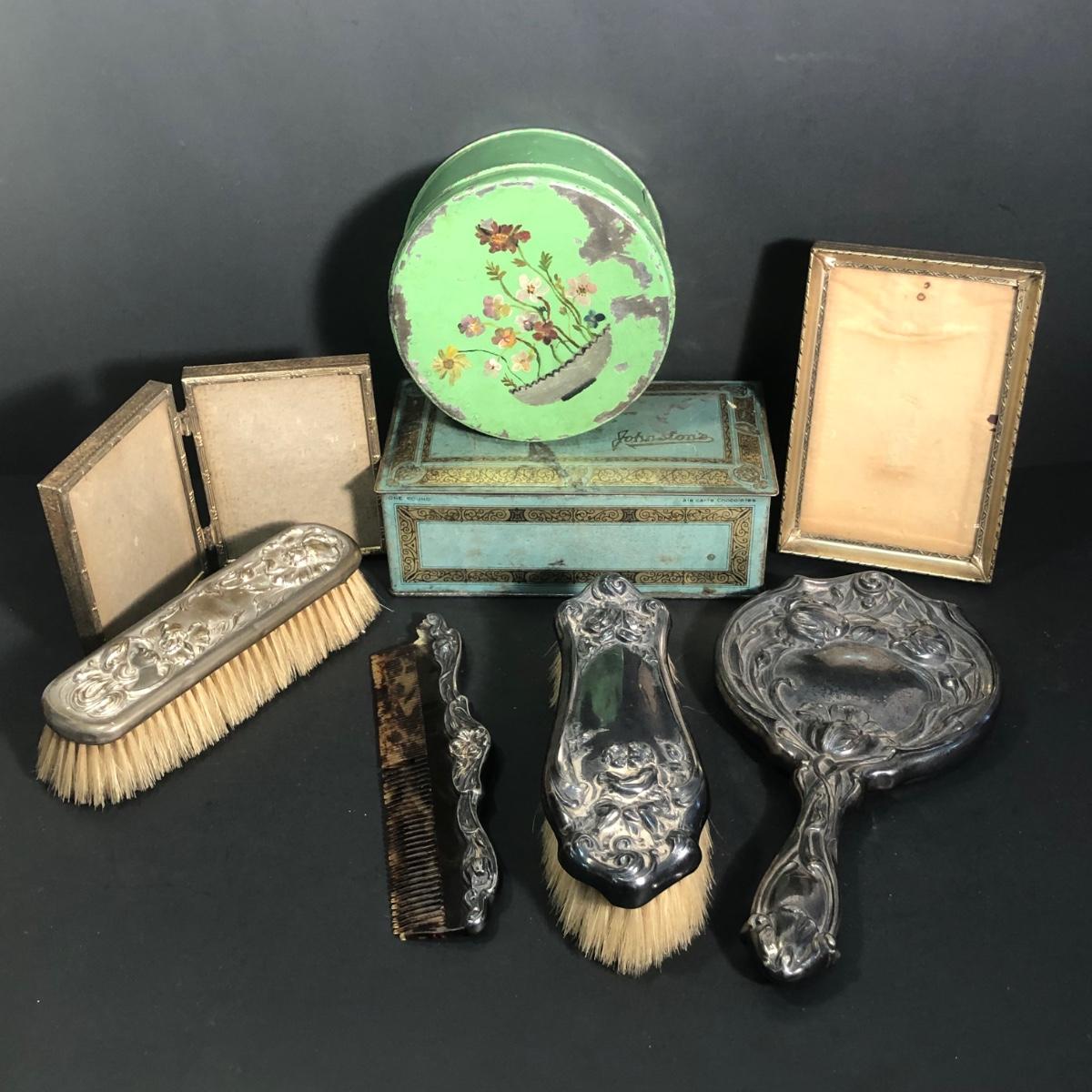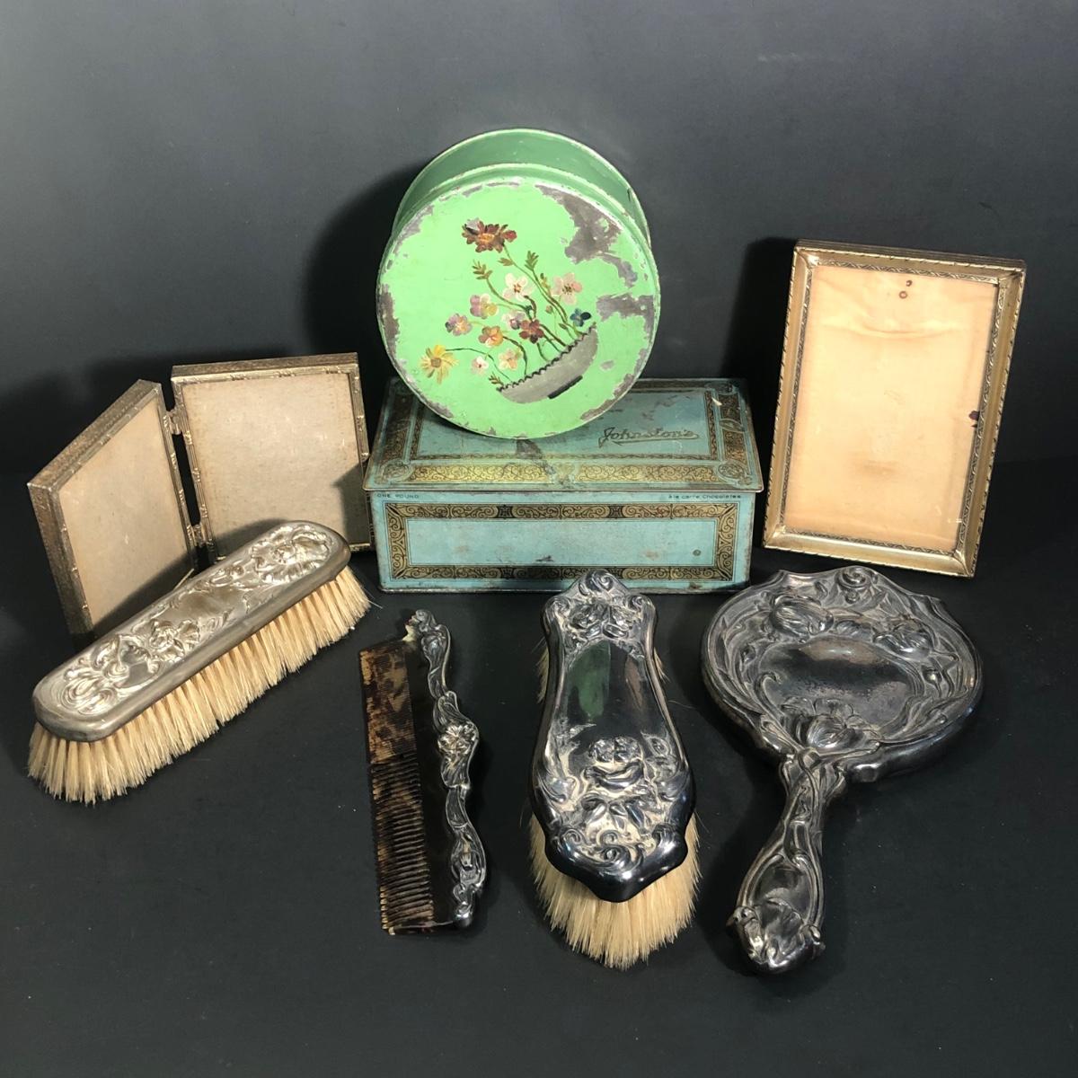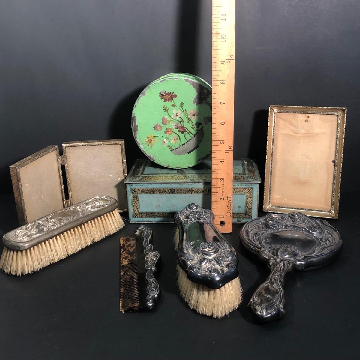LOT 134A: Vintage / Antique Ornate 3-Piece Vanity Set, Vintage Tins & Frames