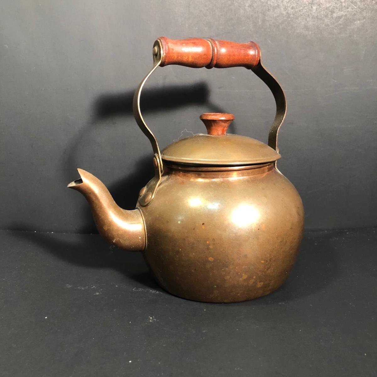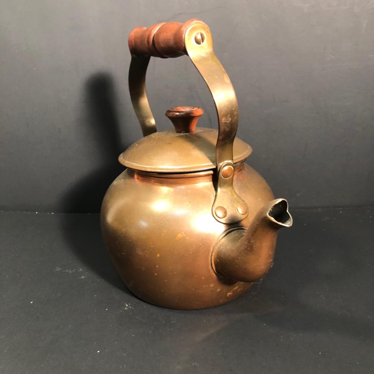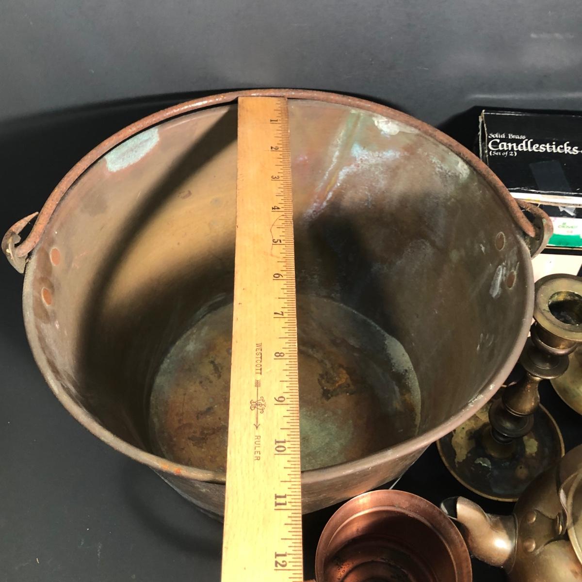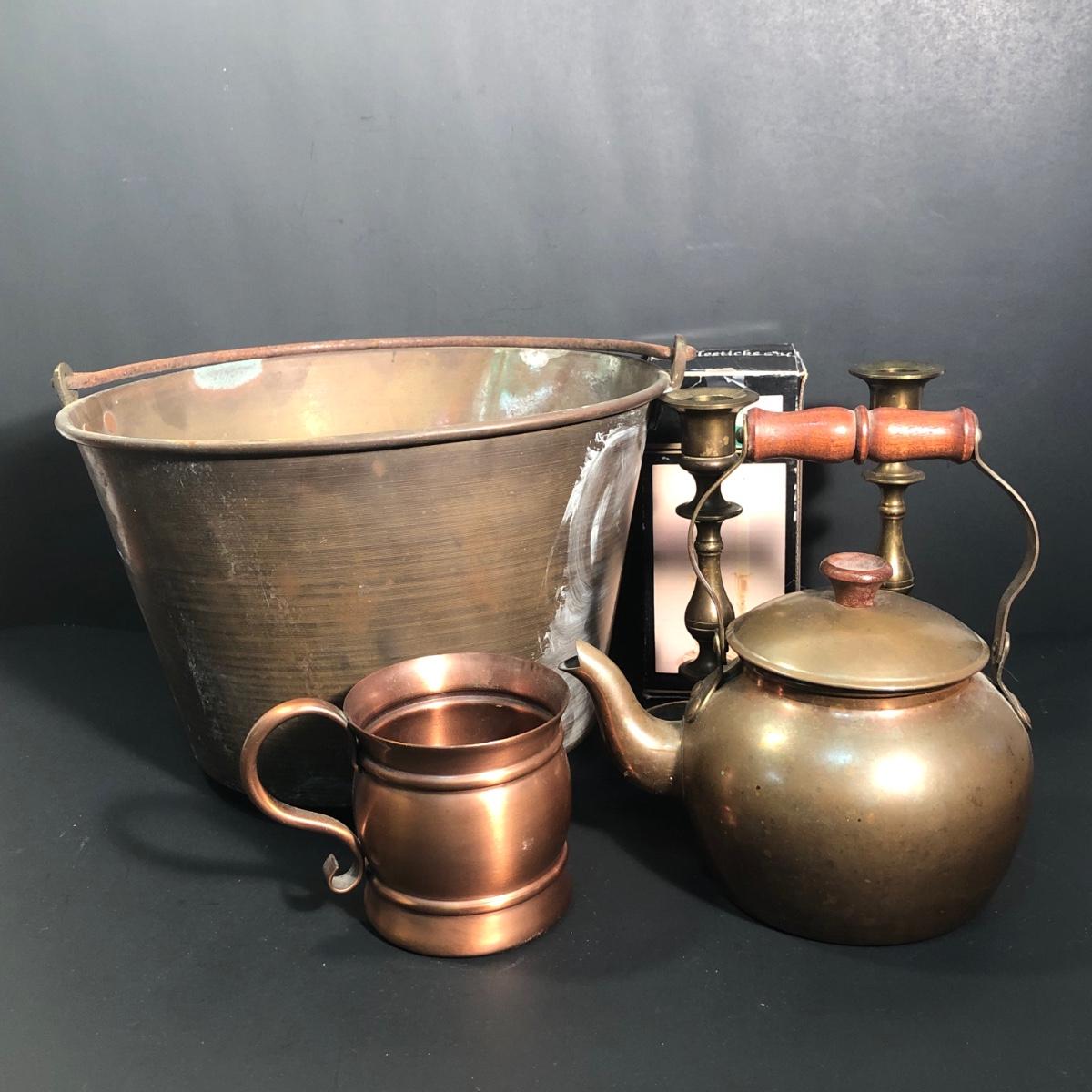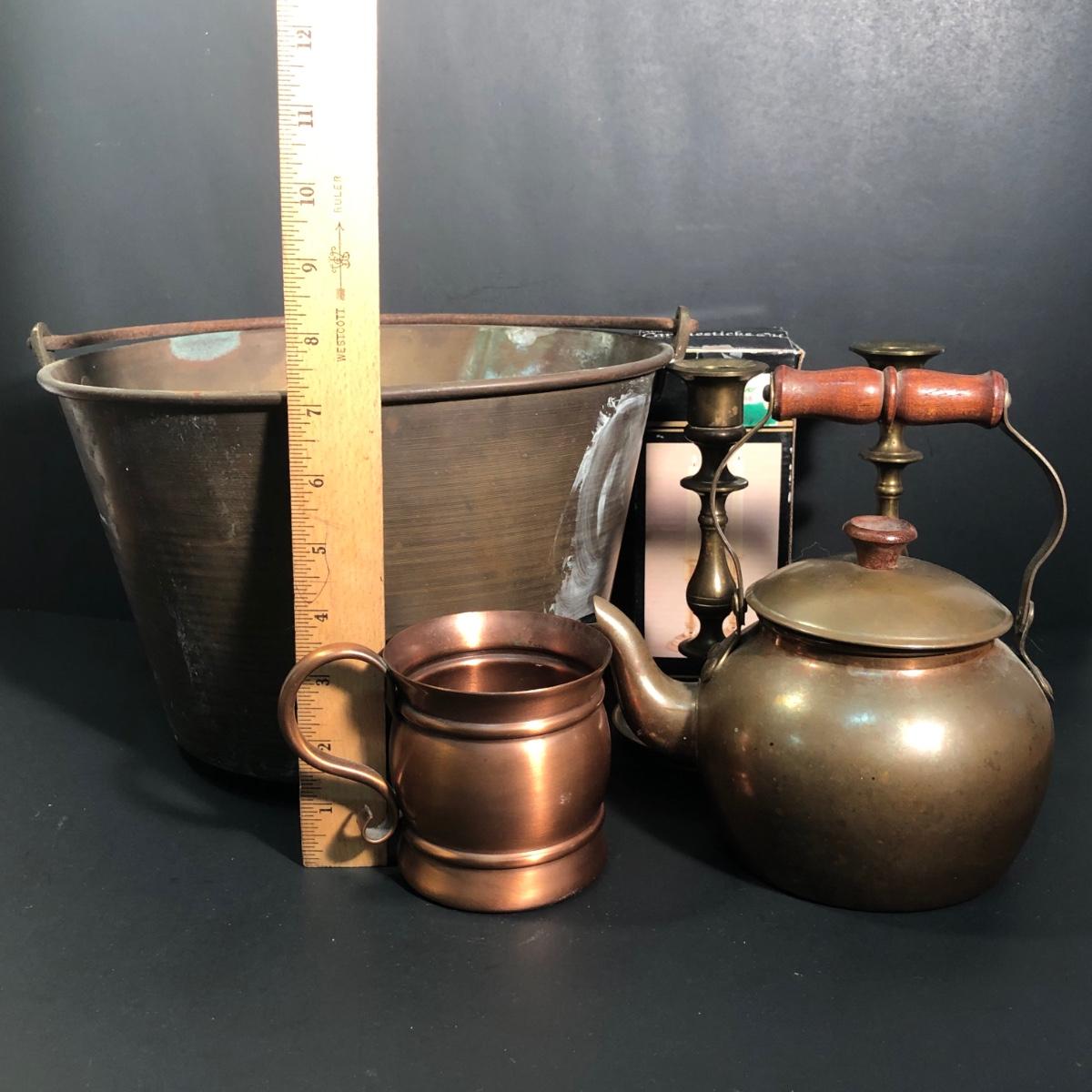 LOT 148C: Vintage Copper & Brass Collection - Bucket, Tea Kettle, Candlestick Holders & Mug