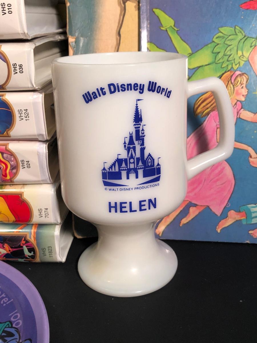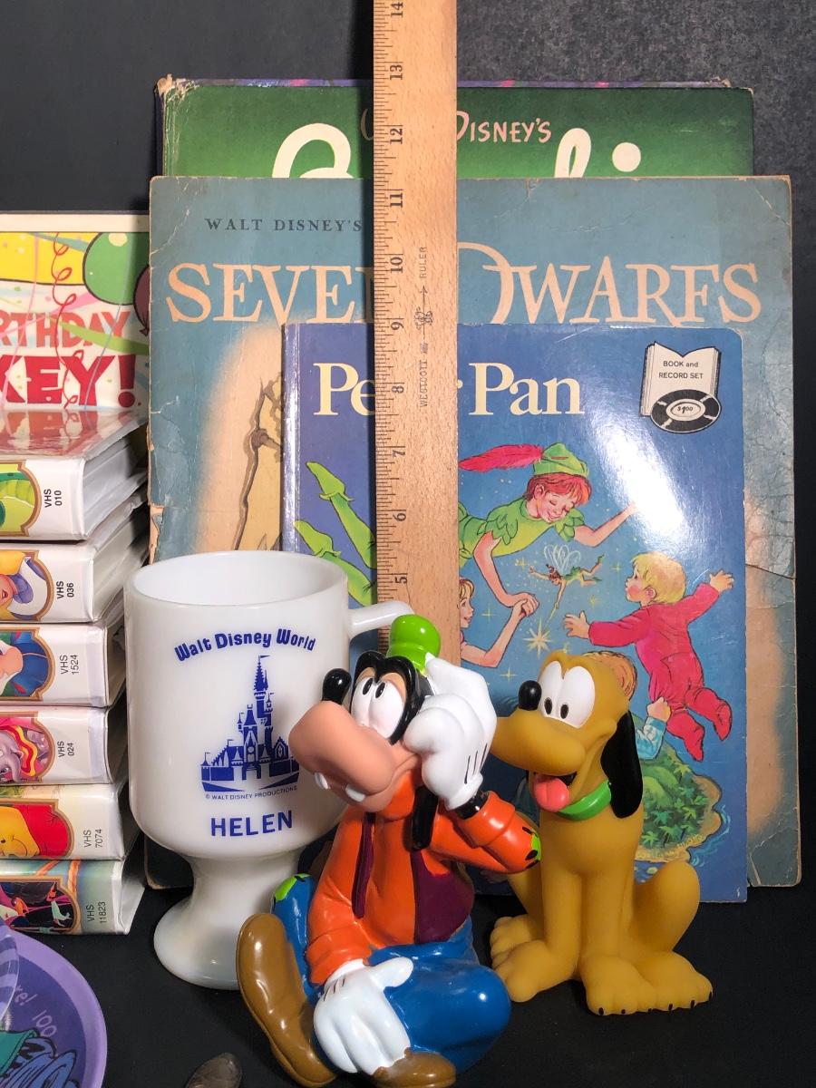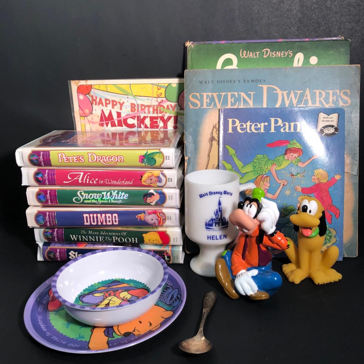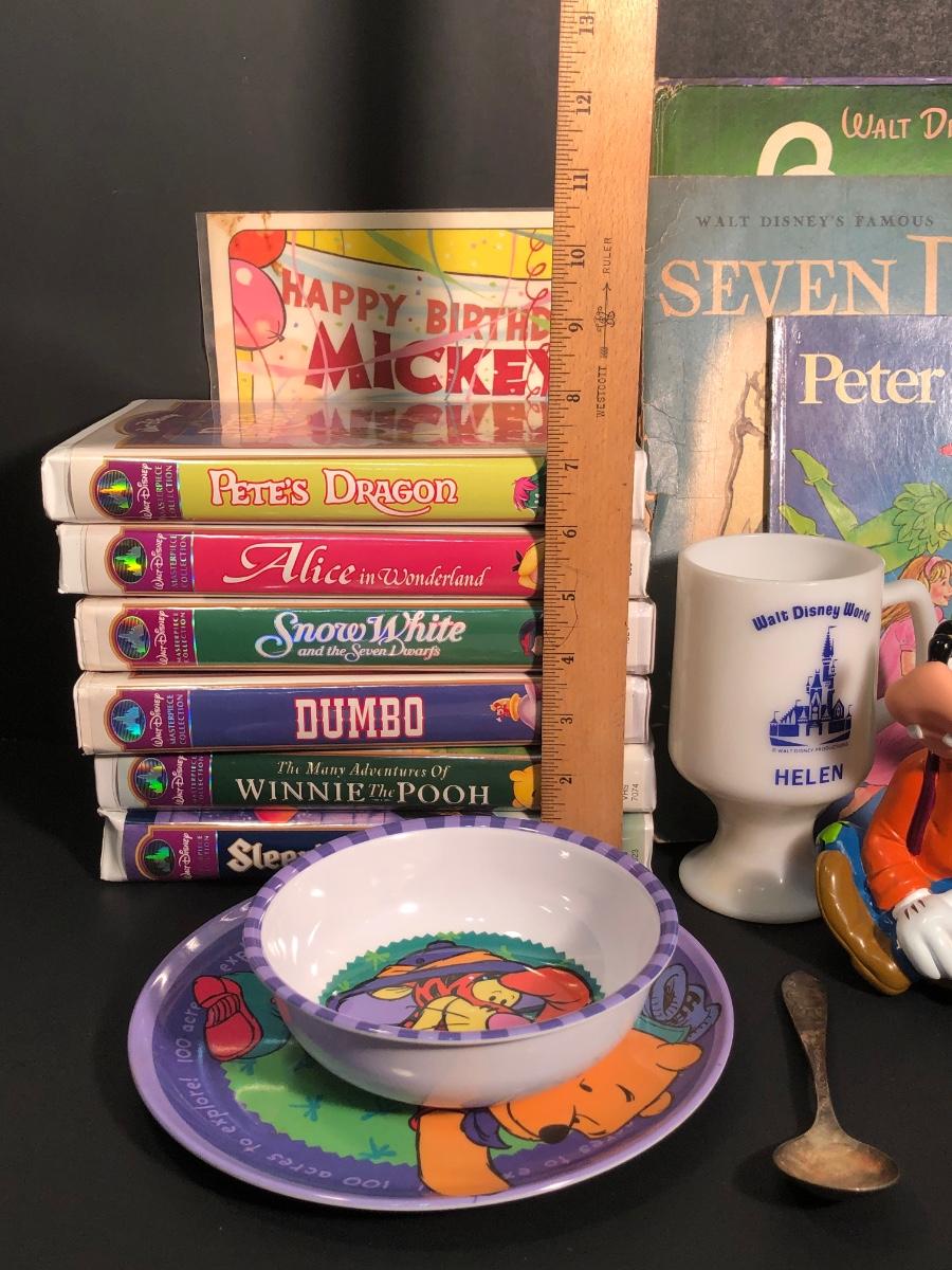 LOT 152B: Vintage Disney - Wm Rogers Mickey Mouse Spoon, Books, VHS, Winnie the Pooh Bowl, Tigger Plate, Birthday Placemat, Vinyl Figures & Milk Glass WDW "Helen" Mug