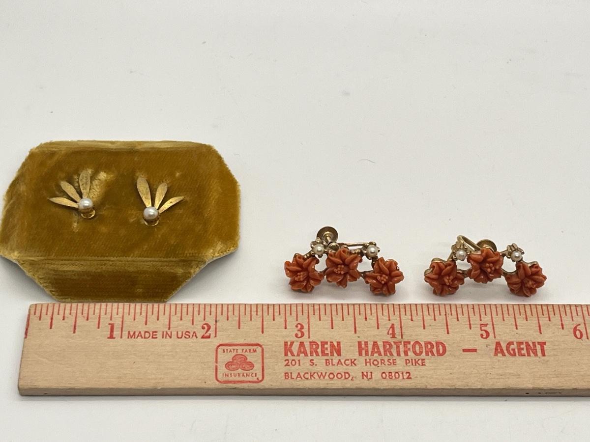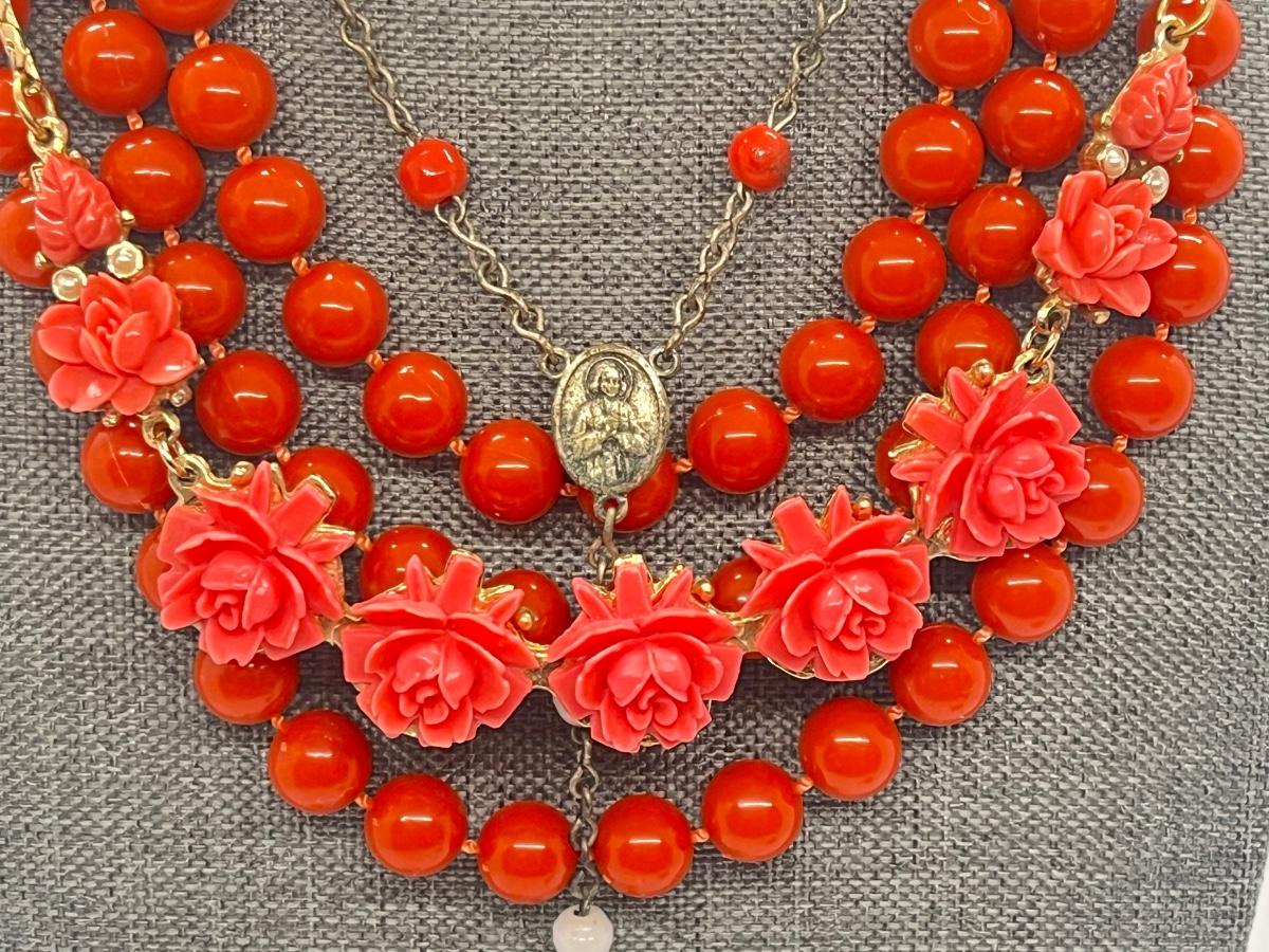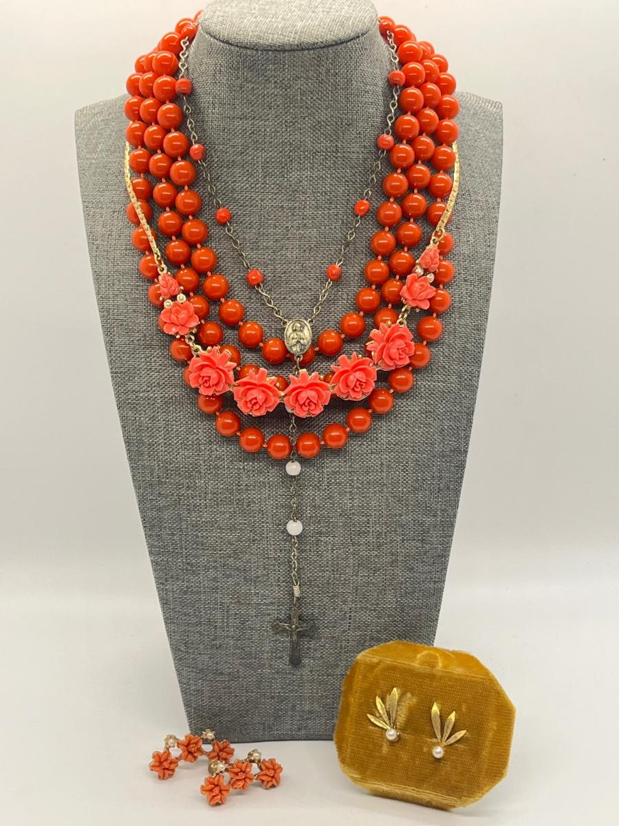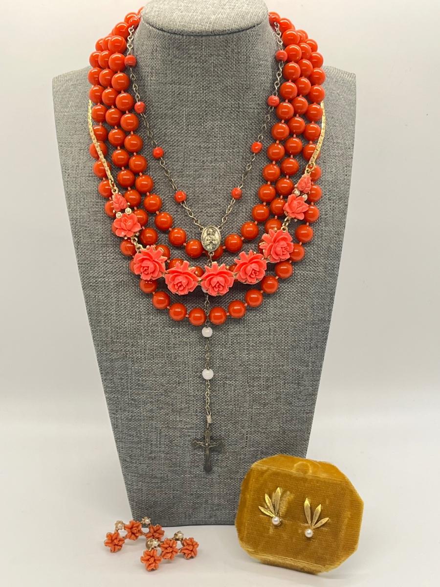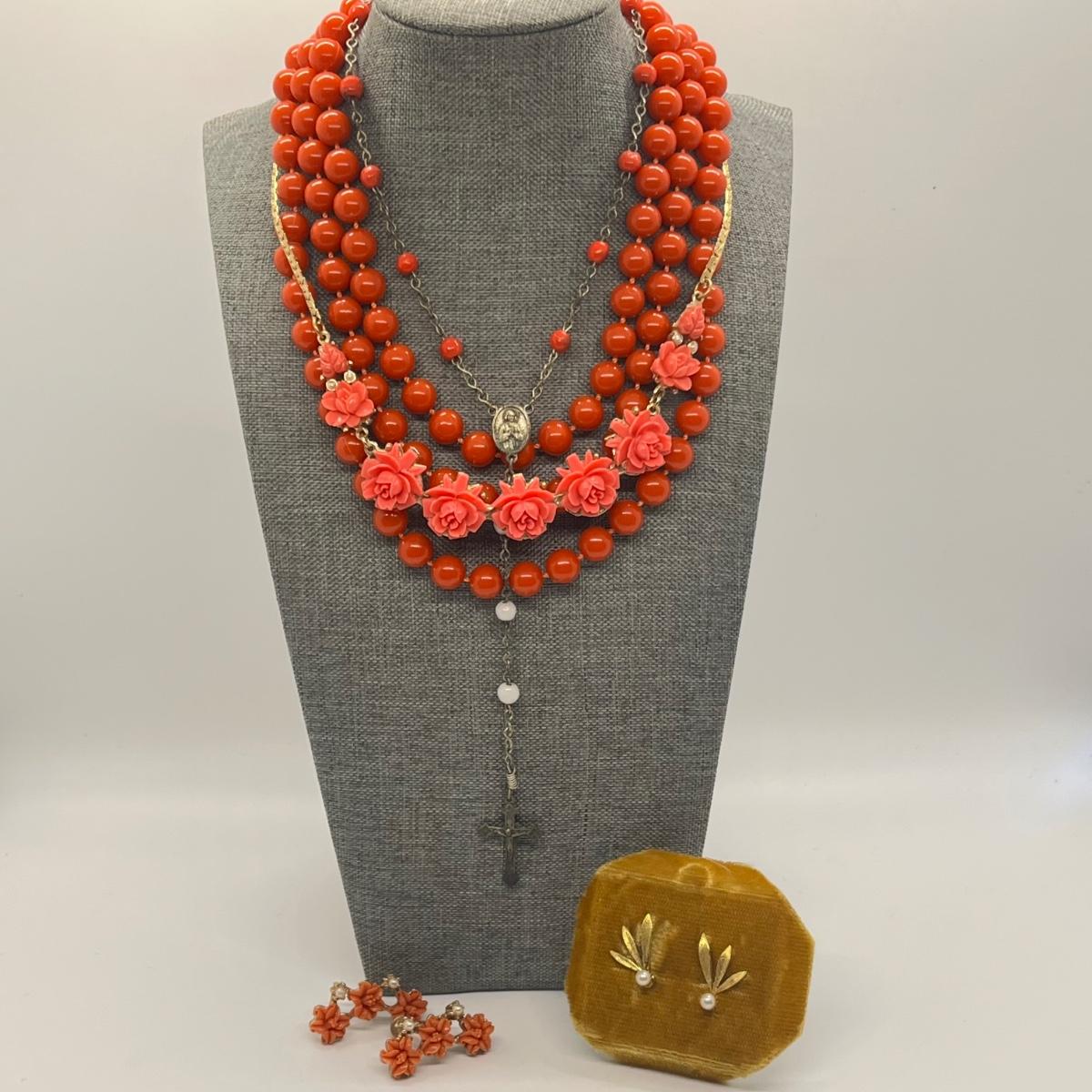 LOT 251J: 50" Coral Colored Beads, Vintage Prayer Beads with Cross, 17" Choker and Screwback Earring Set, Pair of Goldtone and Faux Pearl Clip On Earrings