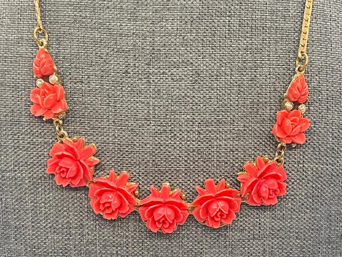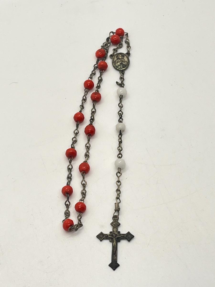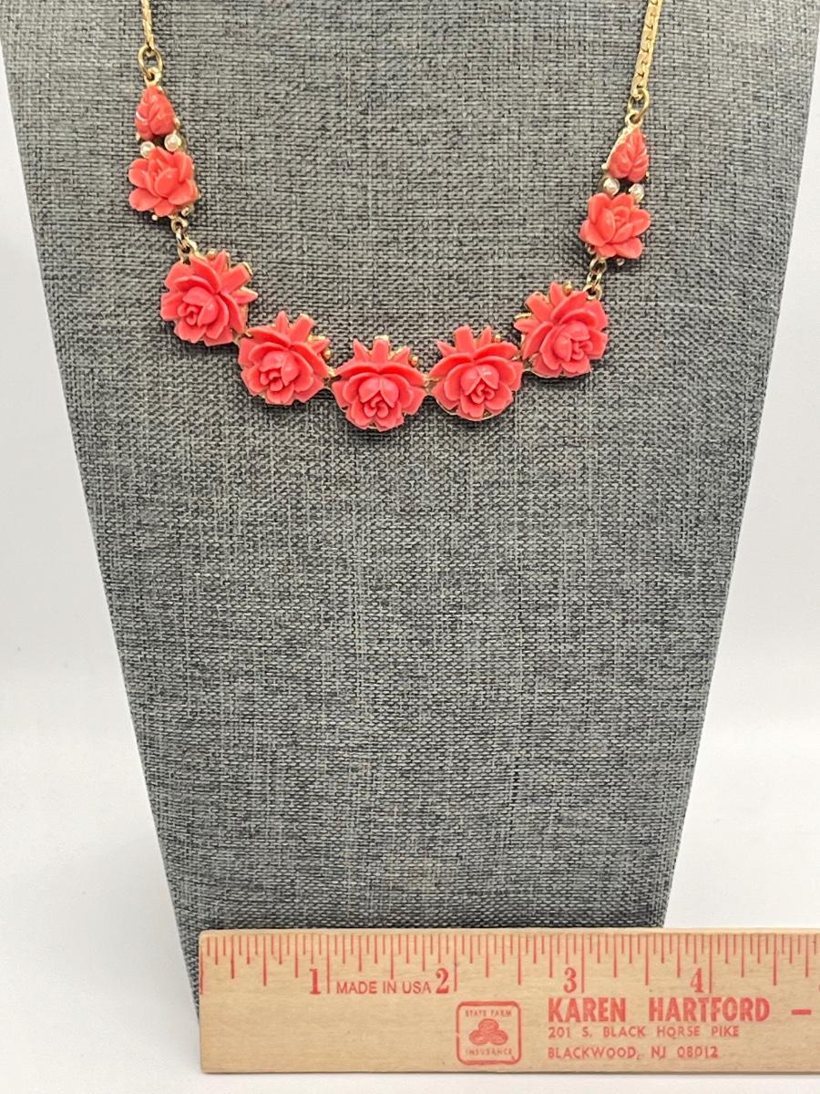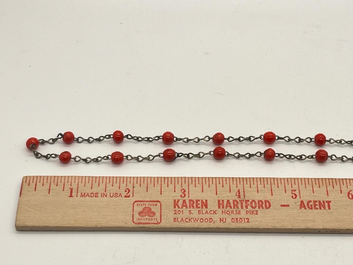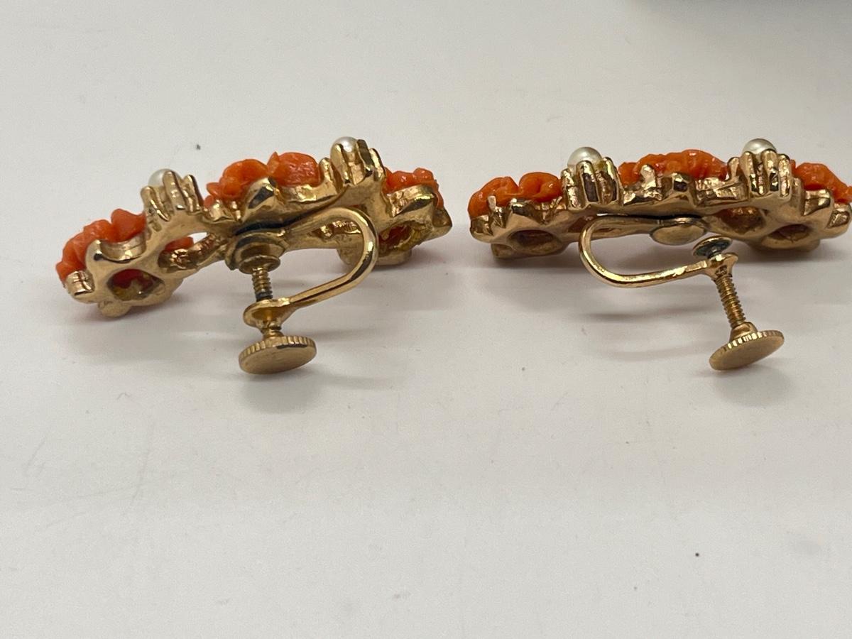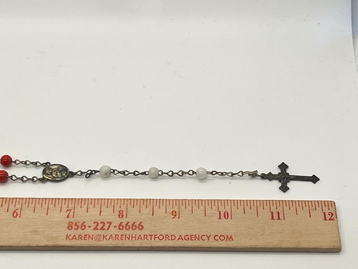 LOT 251J: 50" Coral Colored Beads, Vintage Prayer Beads with Cross, 17" Choker and Screwback Earring Set, Pair of Goldtone and Faux Pearl Clip On Earrings