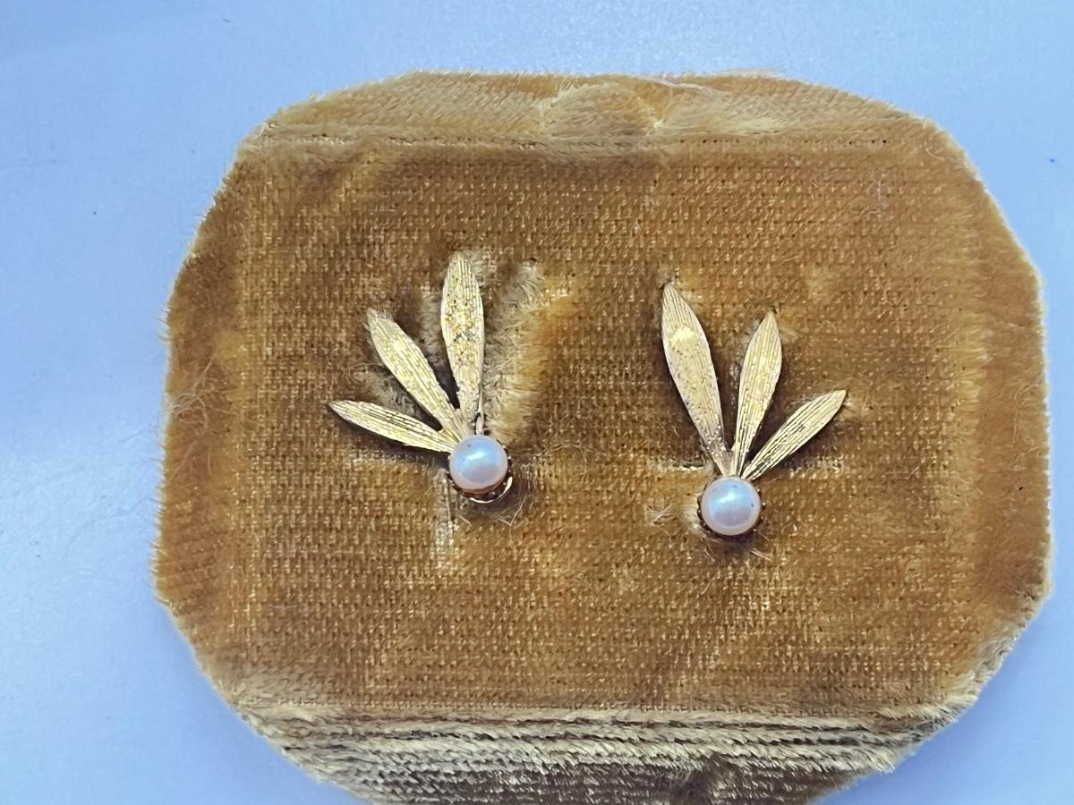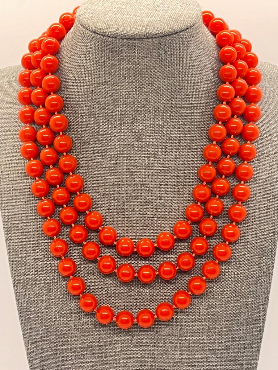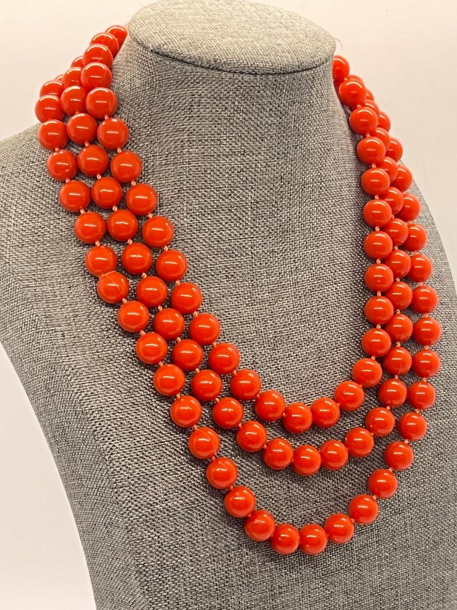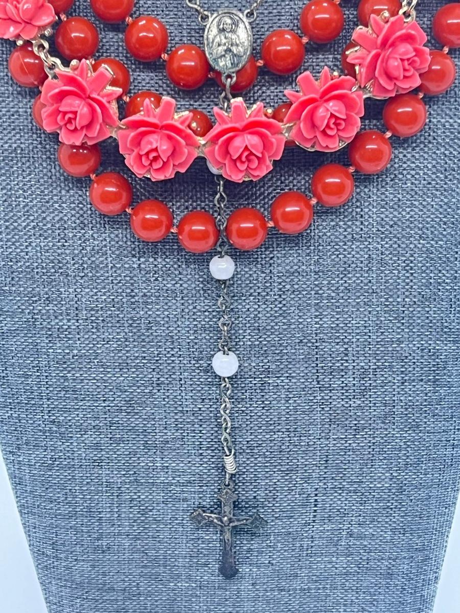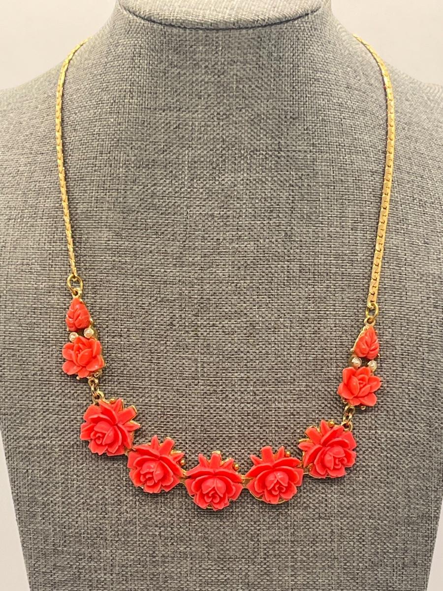 LOT 251J: 50" Coral Colored Beads, Vintage Prayer Beads with Cross, 17" Choker and Screwback Earring Set, Pair of Goldtone and Faux Pearl Clip On Earrings