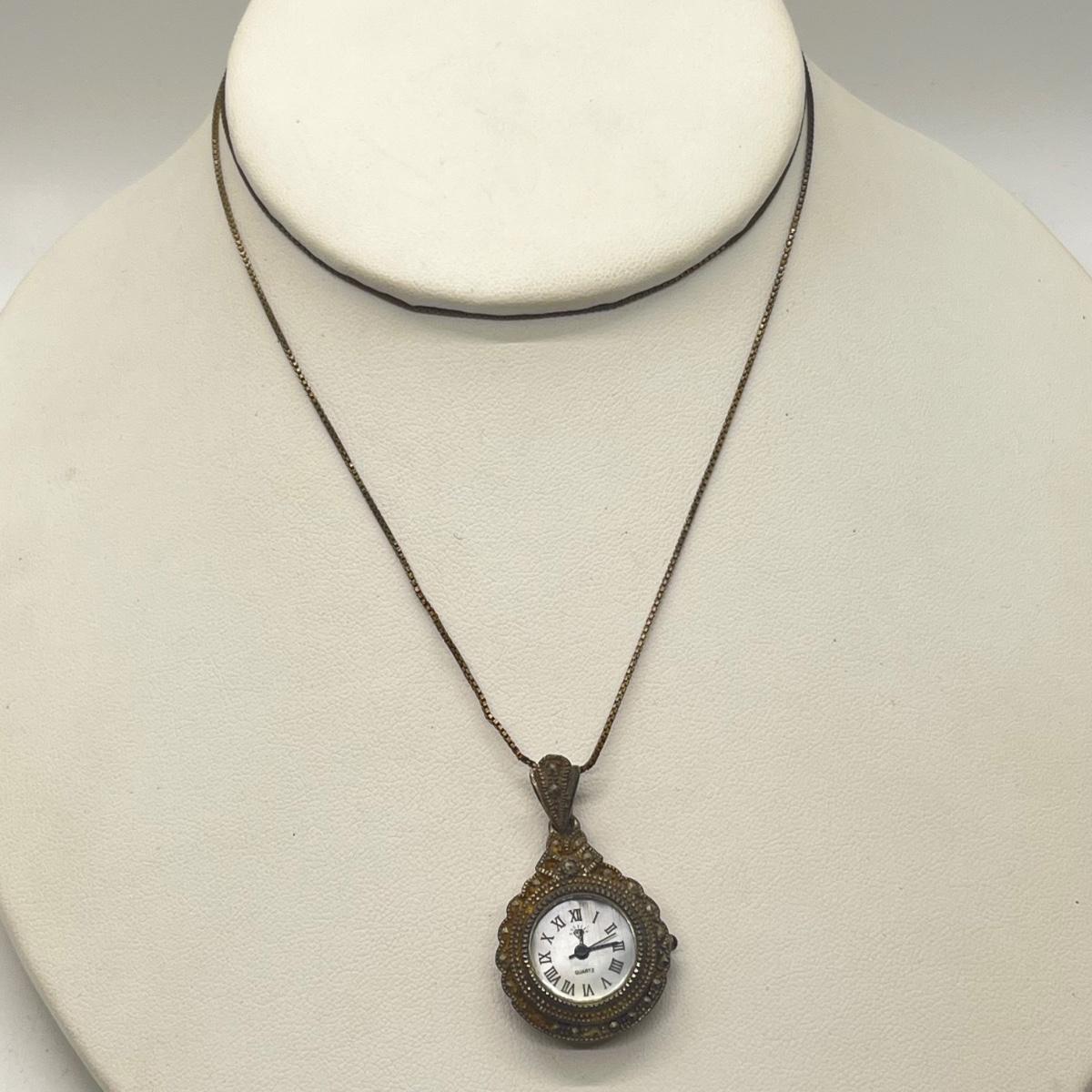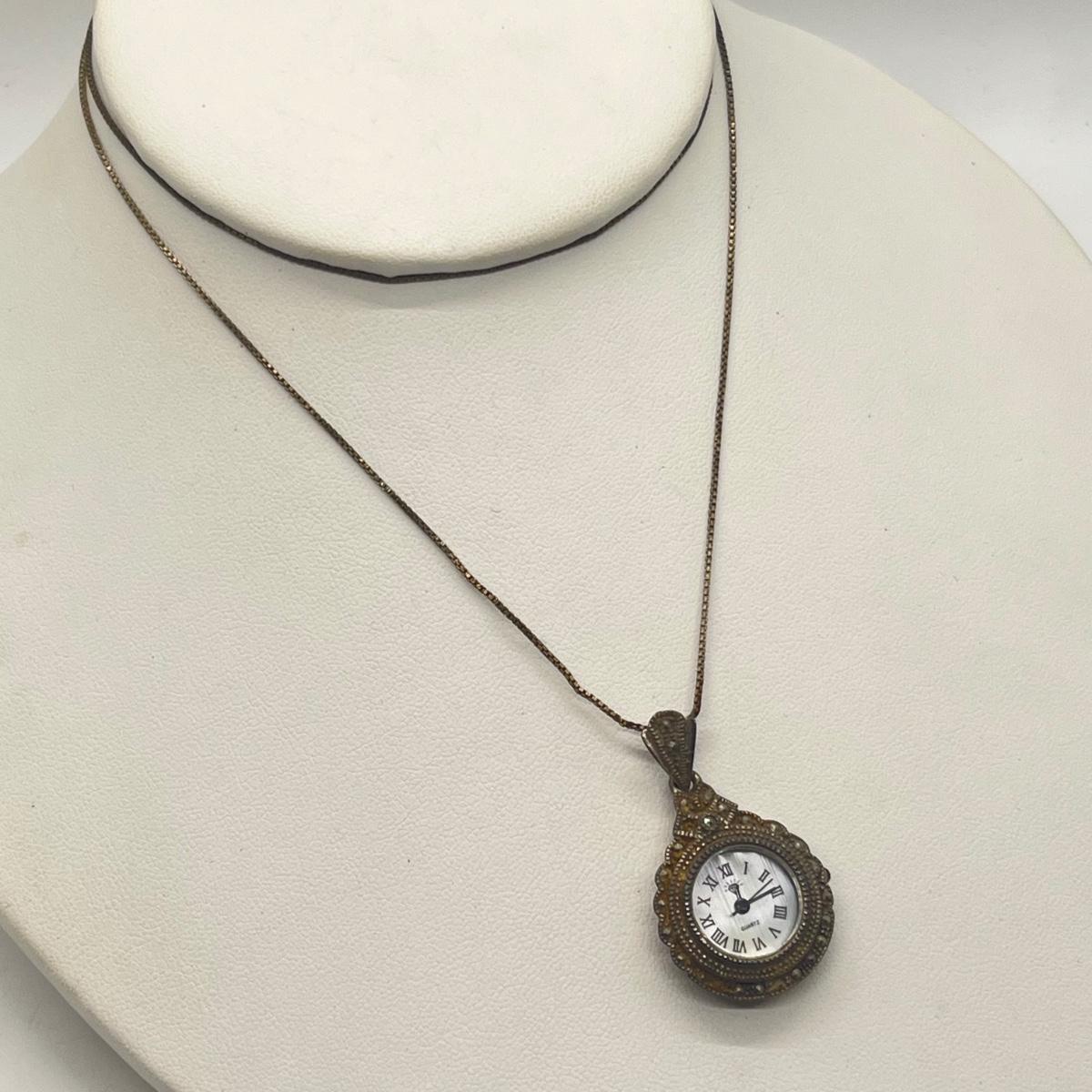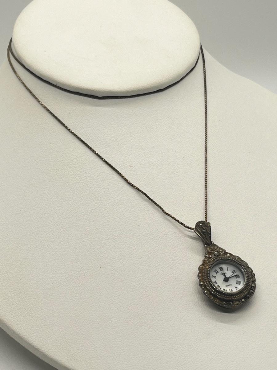 LOT 254J: Marcasite Watch Pendant Necklace-26" Chain-Marked 925