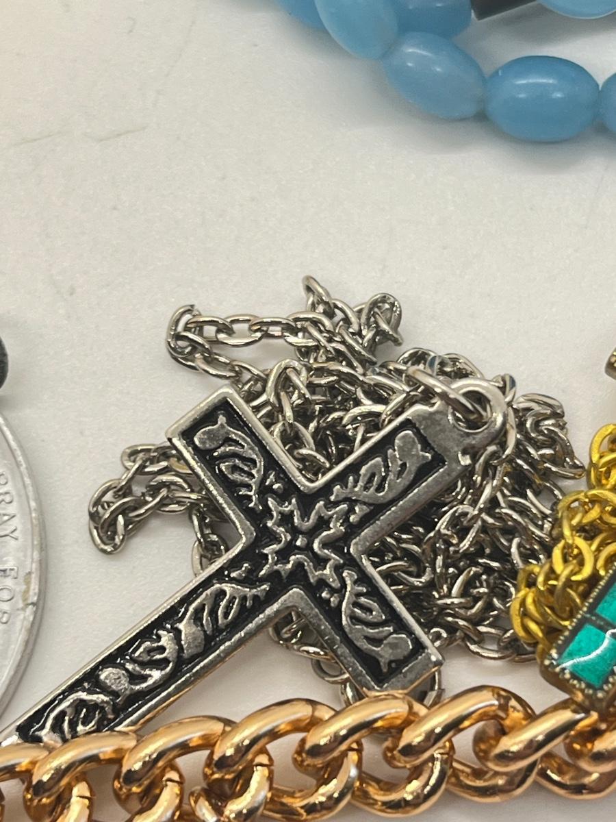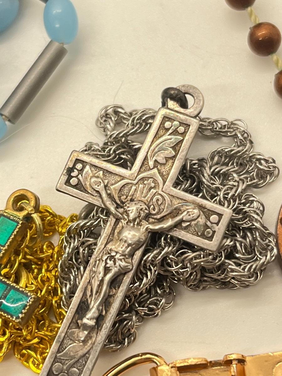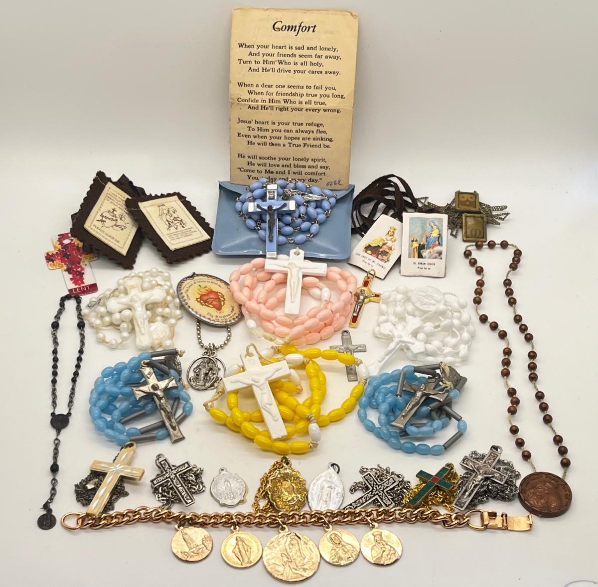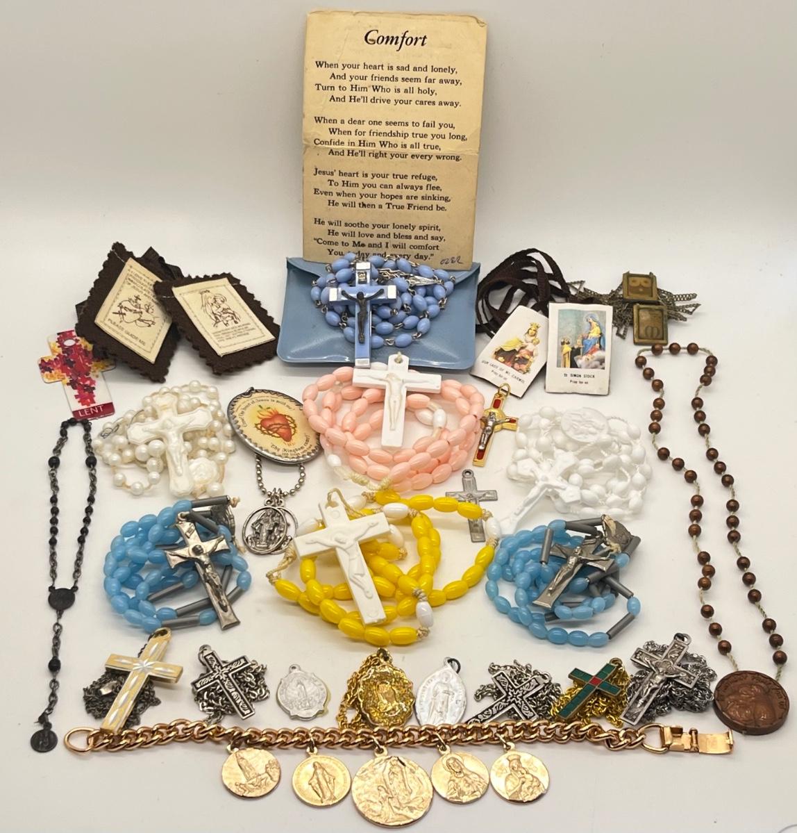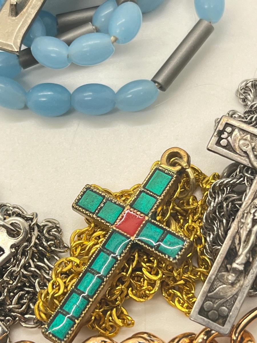 LOT 260J: Large Religious Lot: Rosaries, Chains with Crosses, Charm Bracelet and More