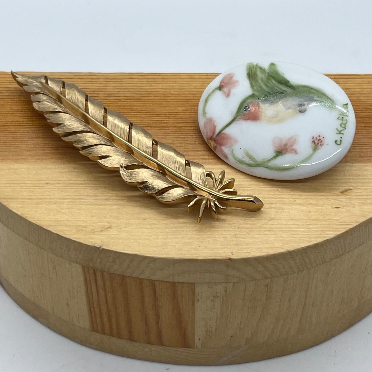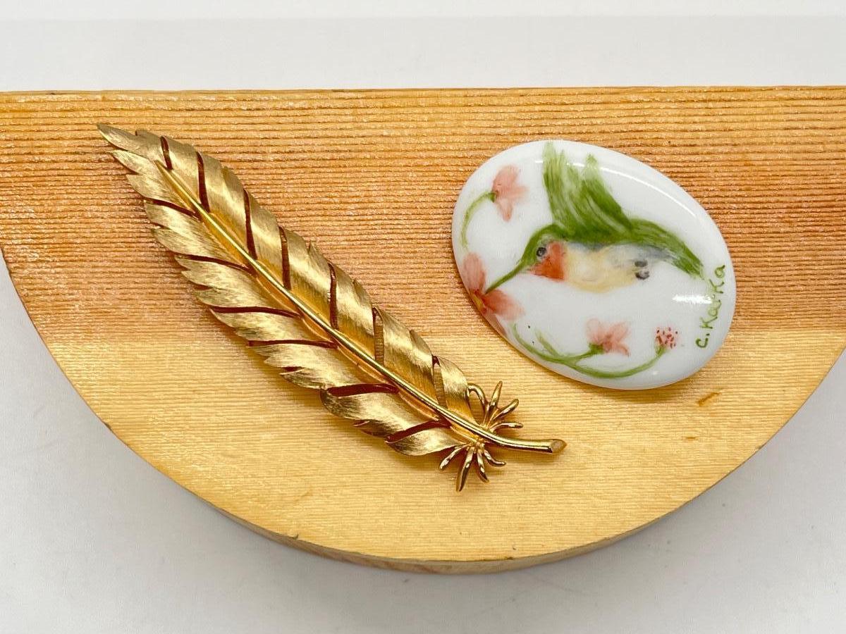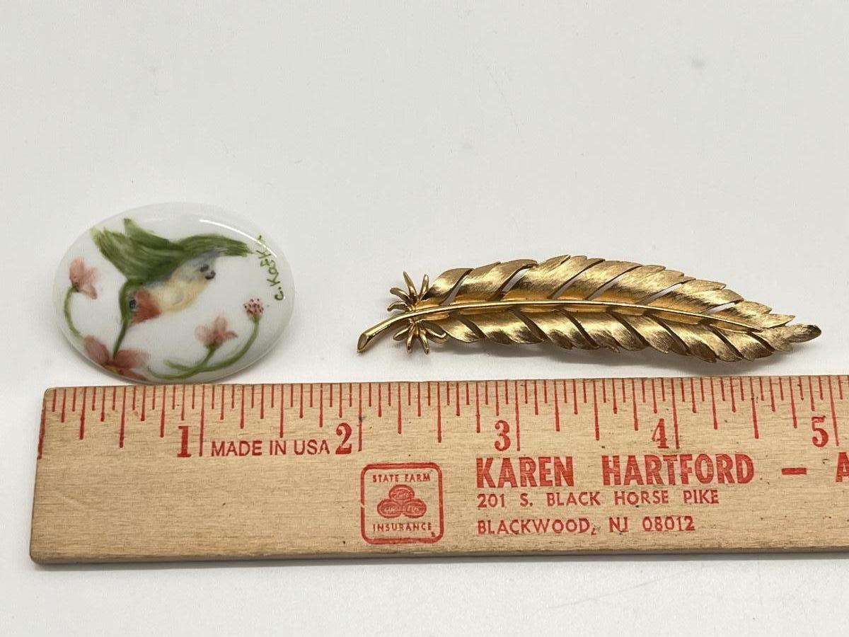 LOT 269J: Trifari Goldtone Leaf Brooch circa 1940's-1950's and Hand Painted Ceramic Brooch Signed C. Kafka
