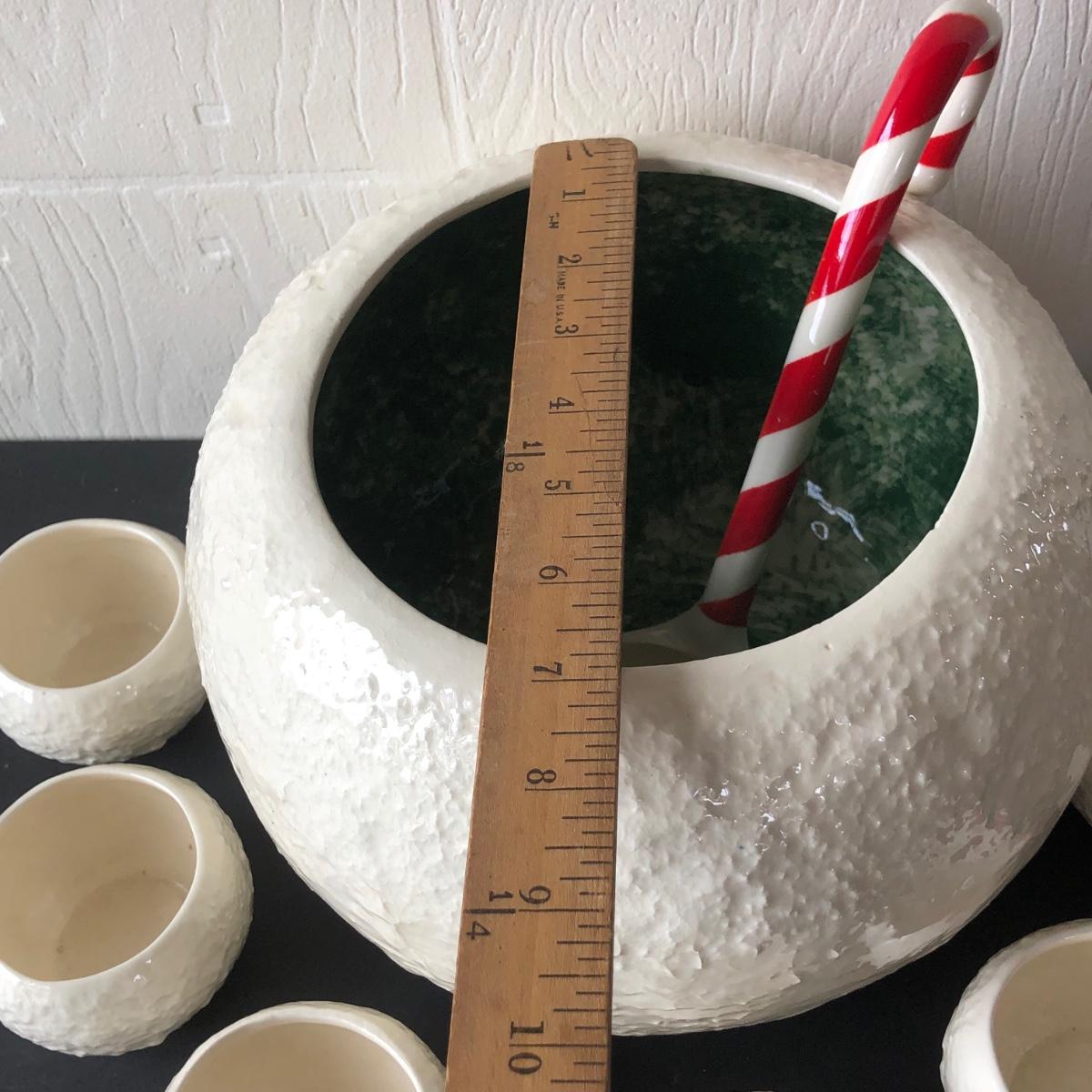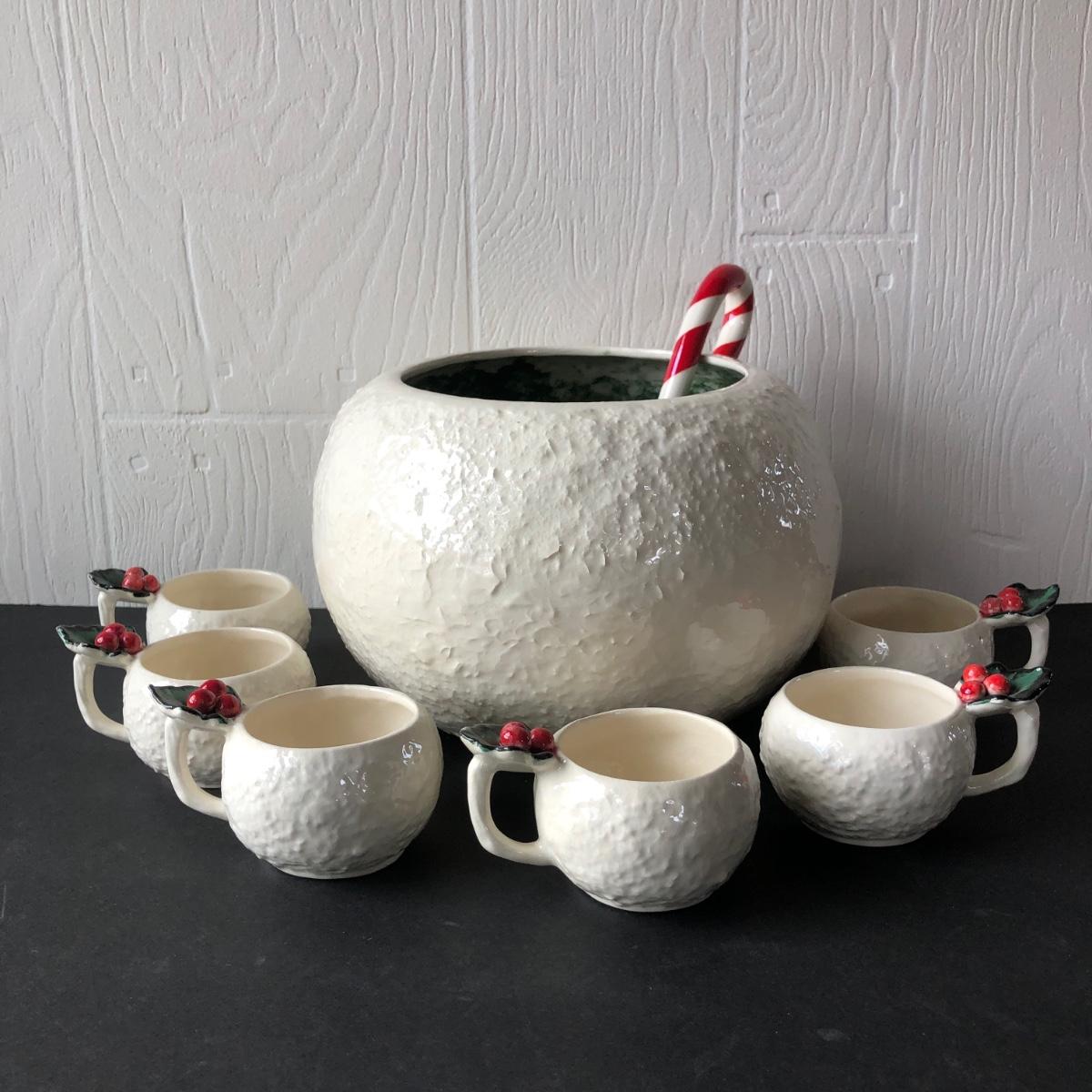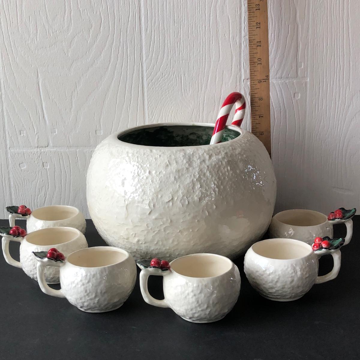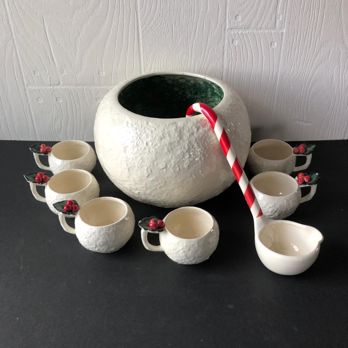 LOT 19G: Vintage 1950s Riddell California Pottery Holly Punch Bowl w/ 6 Matching Cups & Candy Cane Ladle