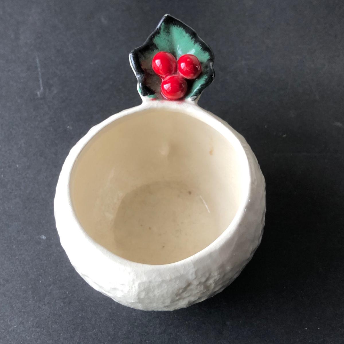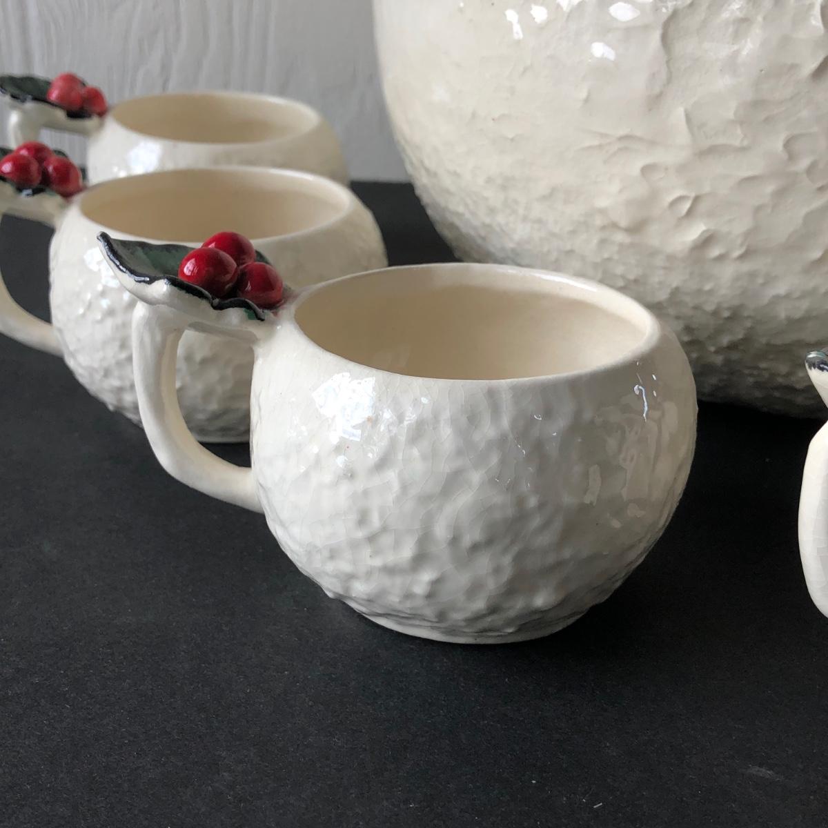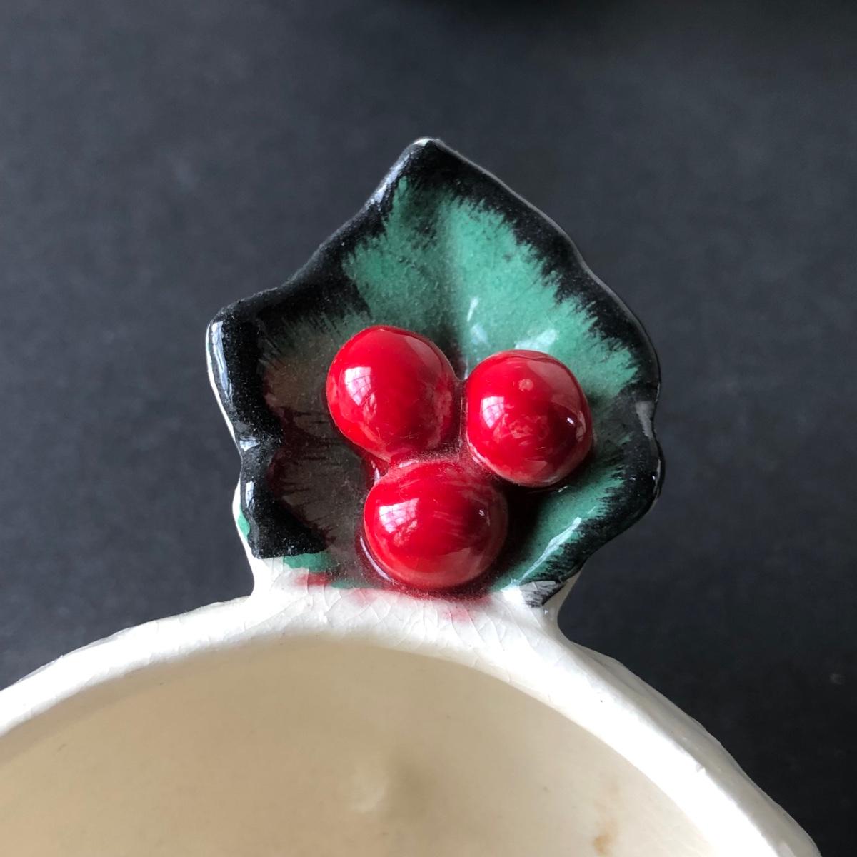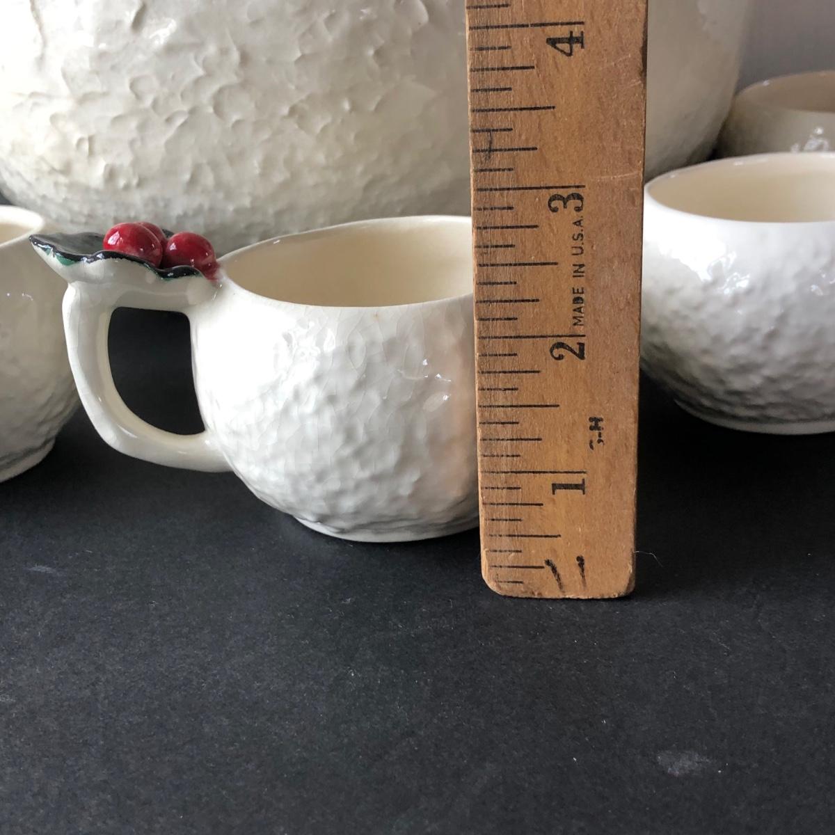LOT 19G: Vintage 1950s Riddell California Pottery Holly Punch Bowl w/ 6 Matching Cups & Candy Cane Ladle