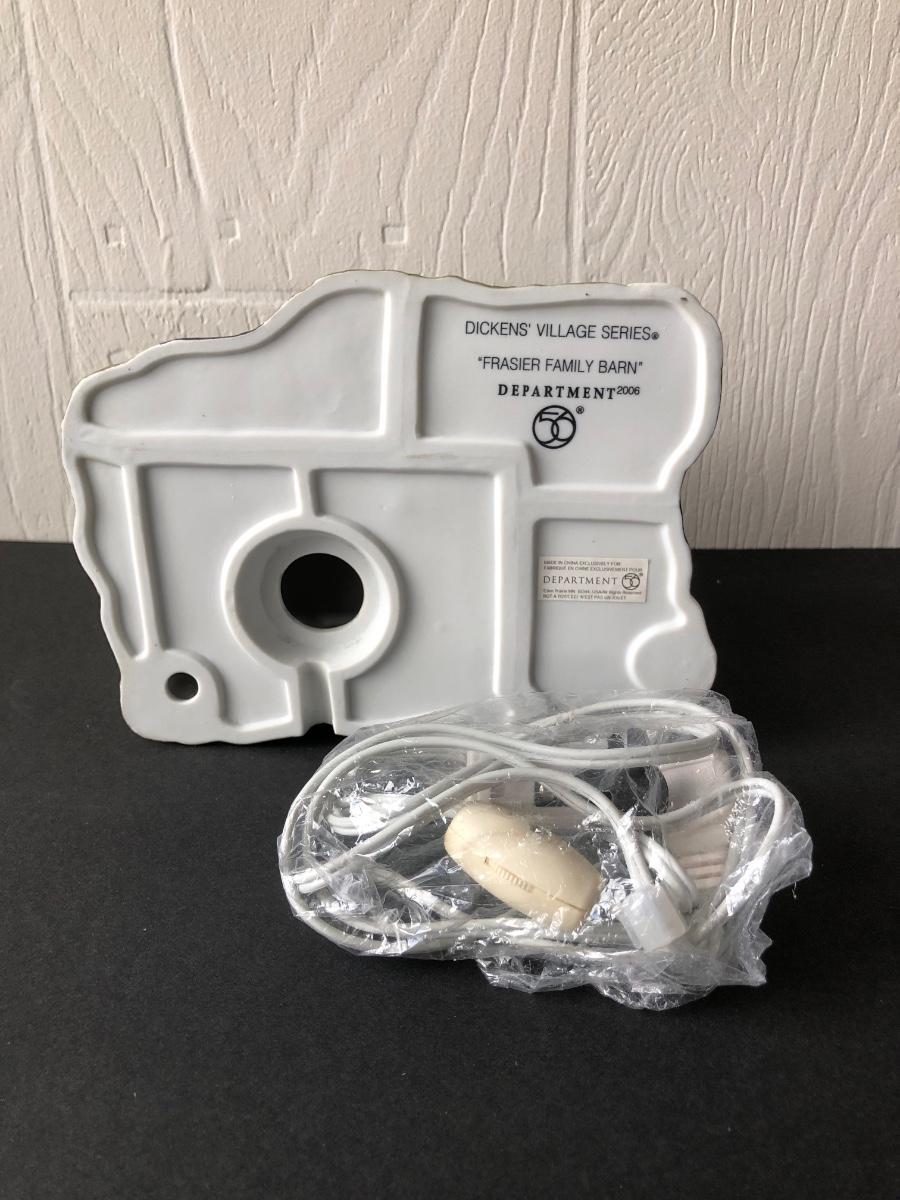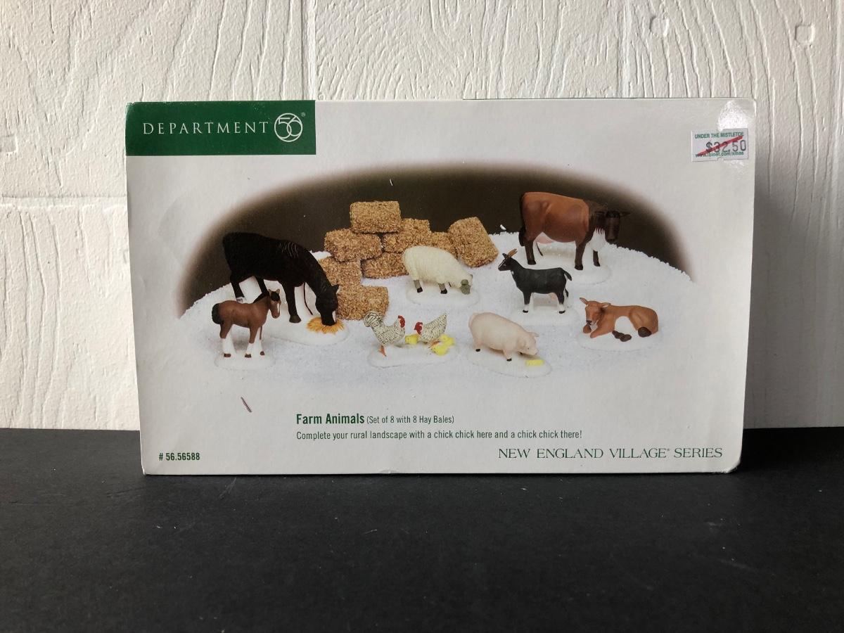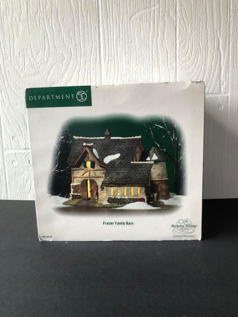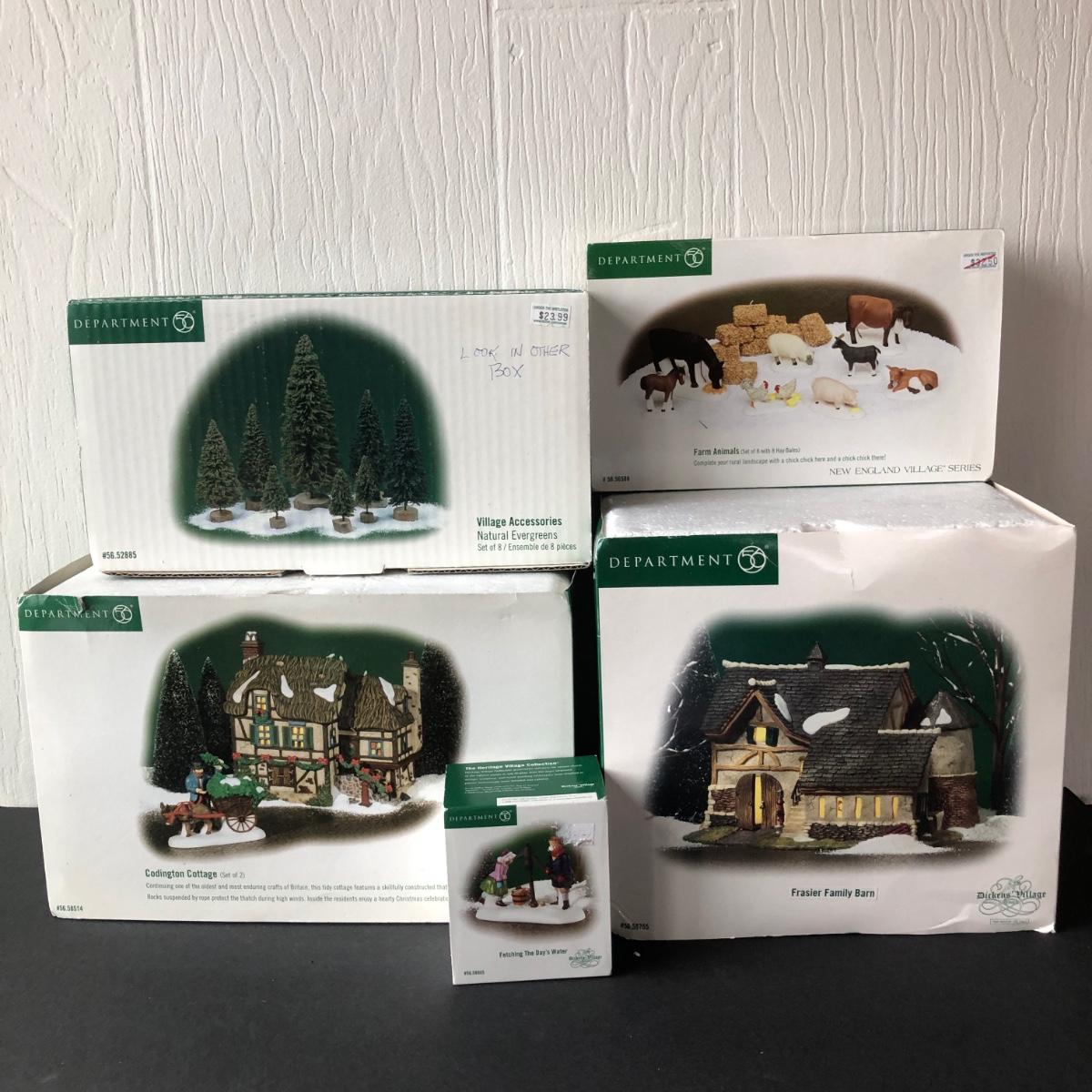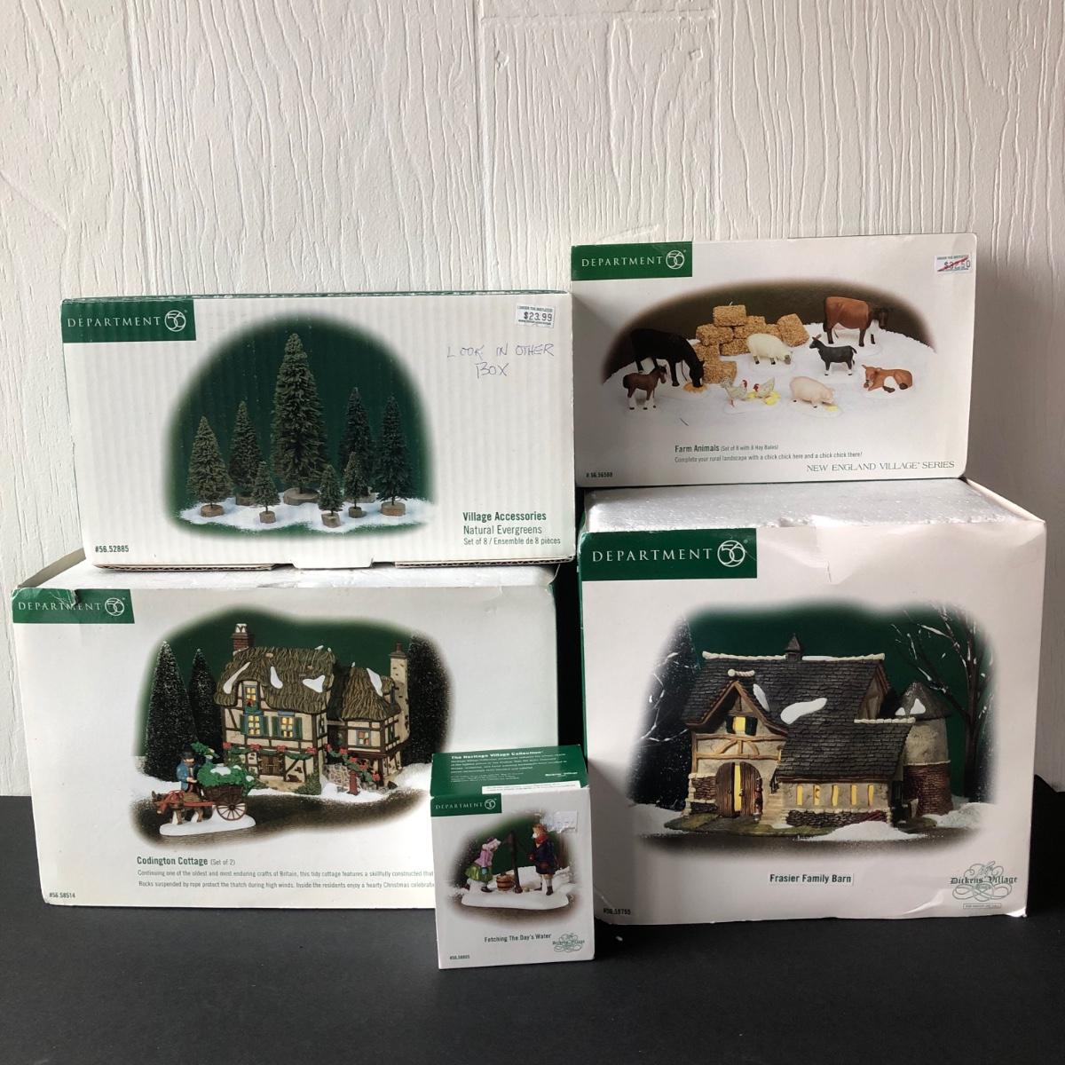 LOT 23G: Department 56 - 2006 Frasier Family Barn (56.58755), 2002 Codington Cottage (56.58514), Fetching the Days Water (56.58805) w/ Farm Animals (56.56588 - missing hay) & Natural Evergreens