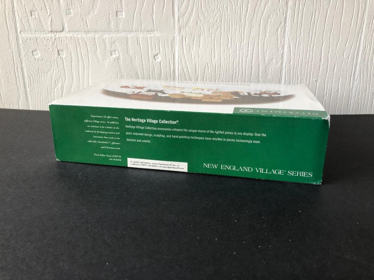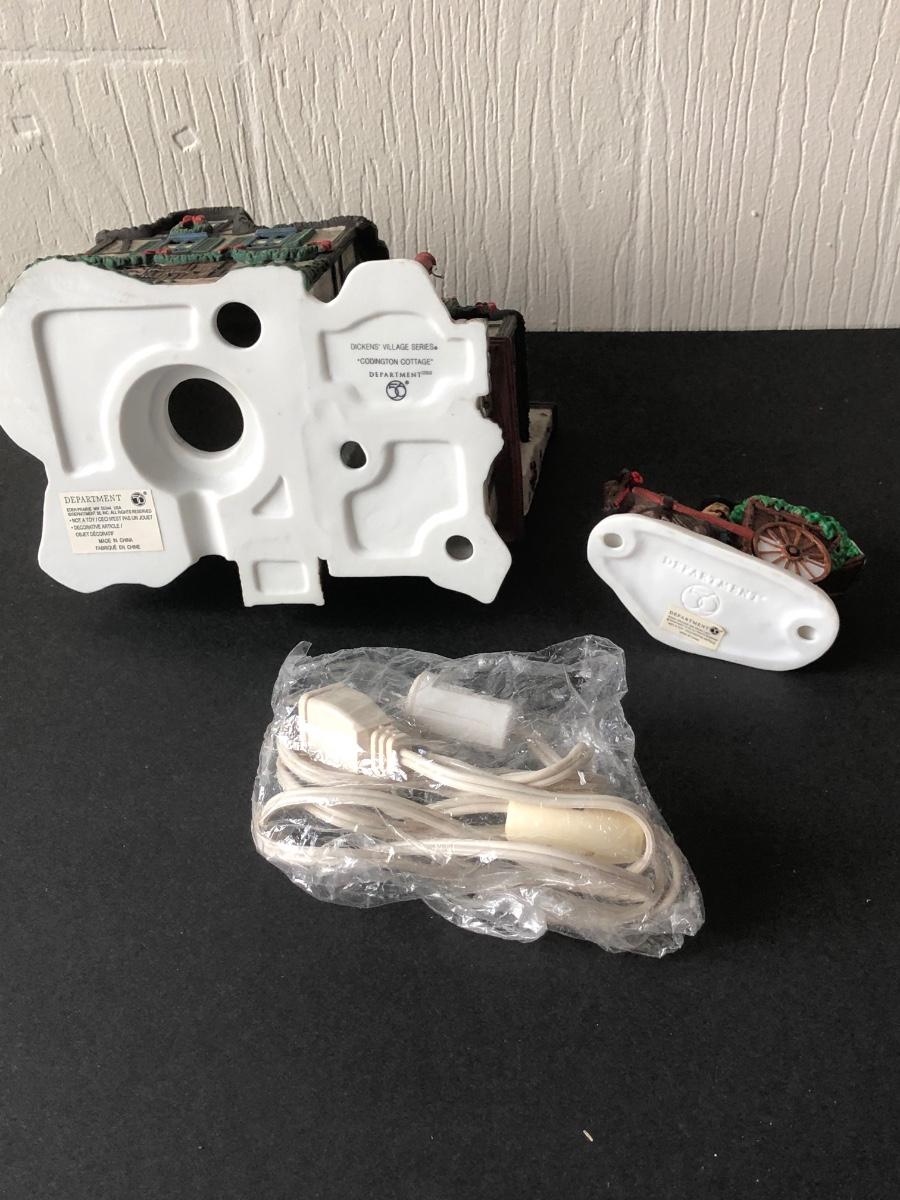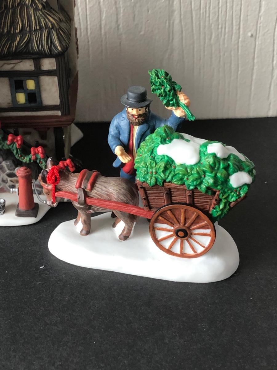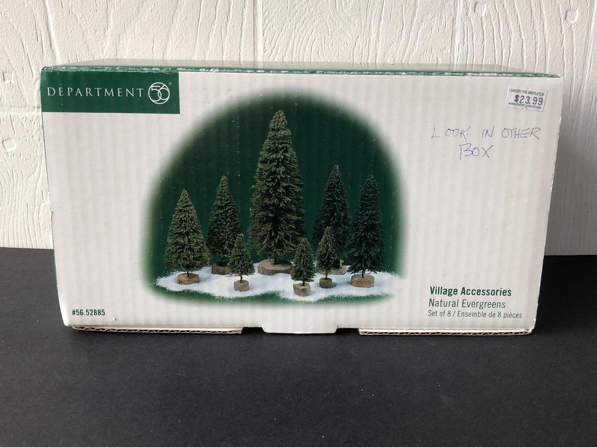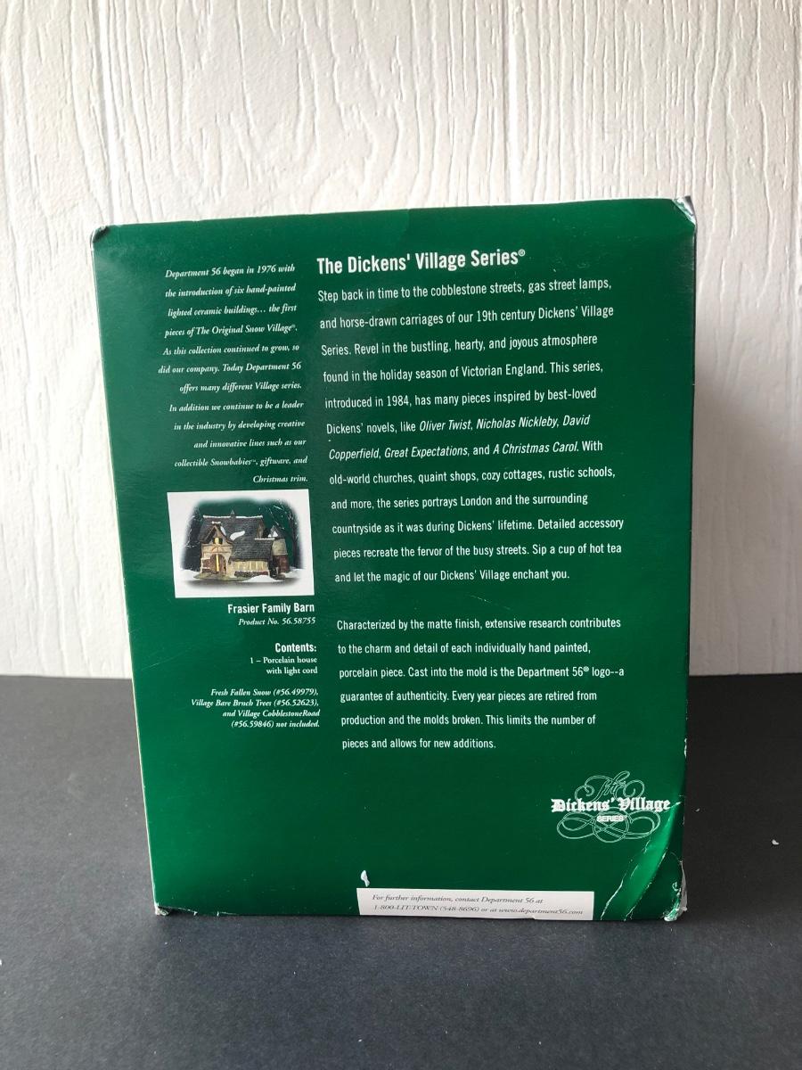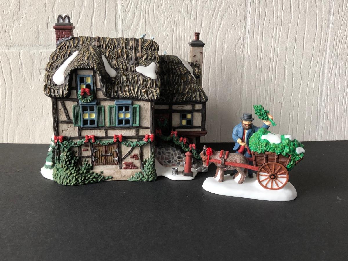 LOT 23G: Department 56 - 2006 Frasier Family Barn (56.58755), 2002 Codington Cottage (56.58514), Fetching the Days Water (56.58805) w/ Farm Animals (56.56588 - missing hay) & Natural Evergreens