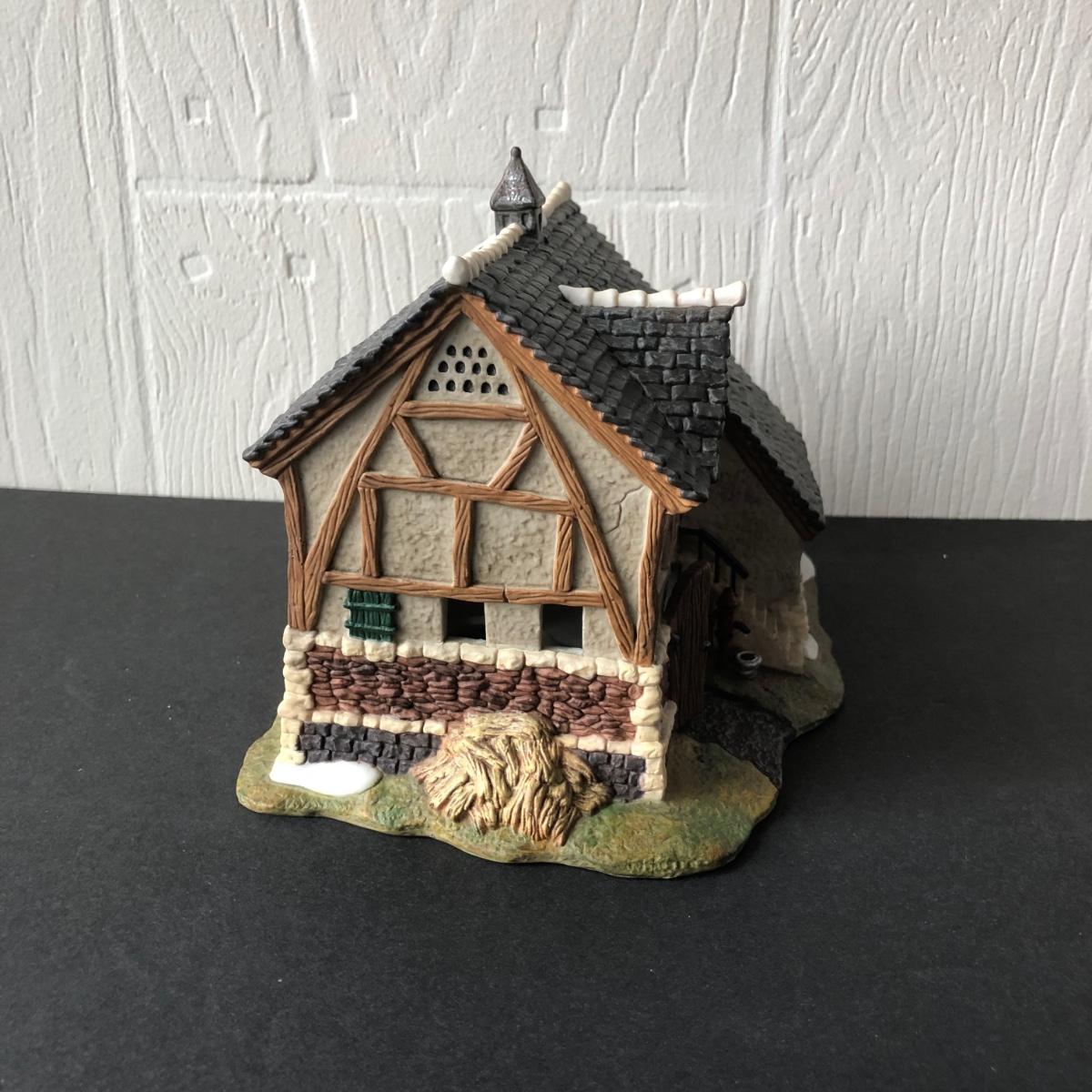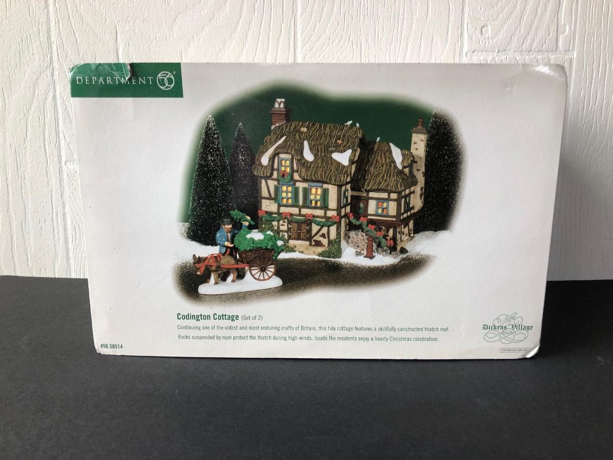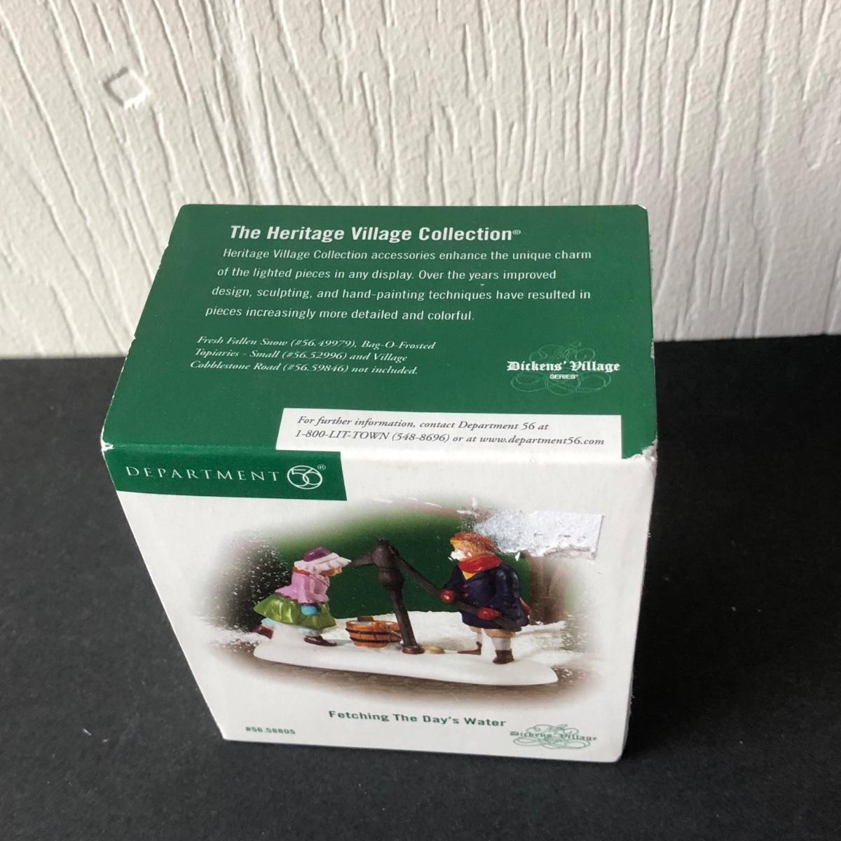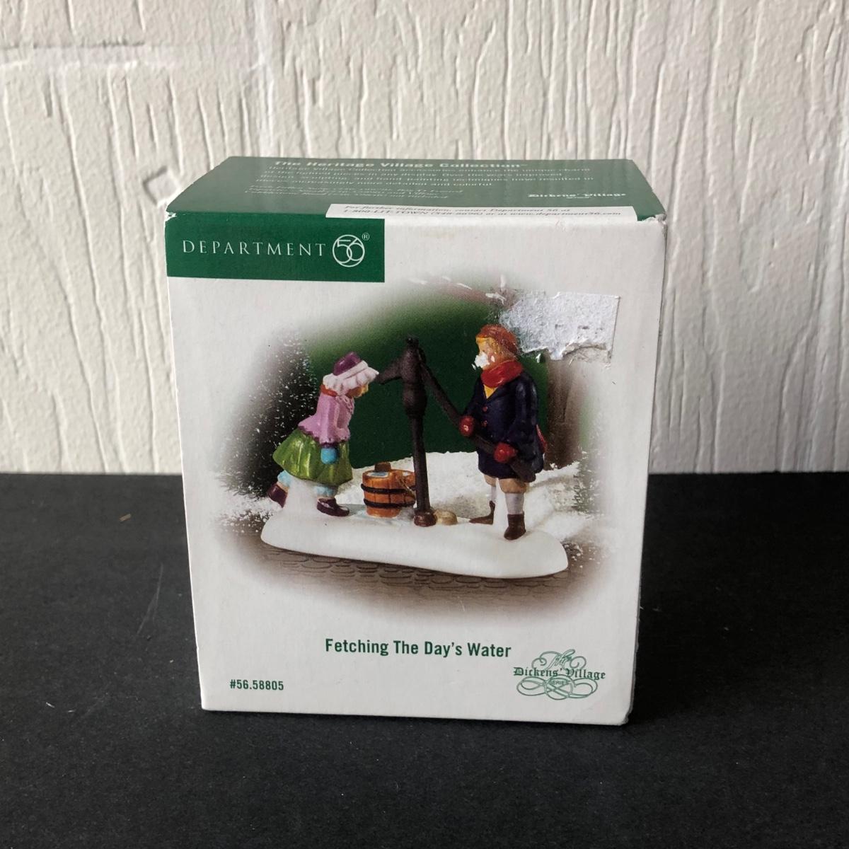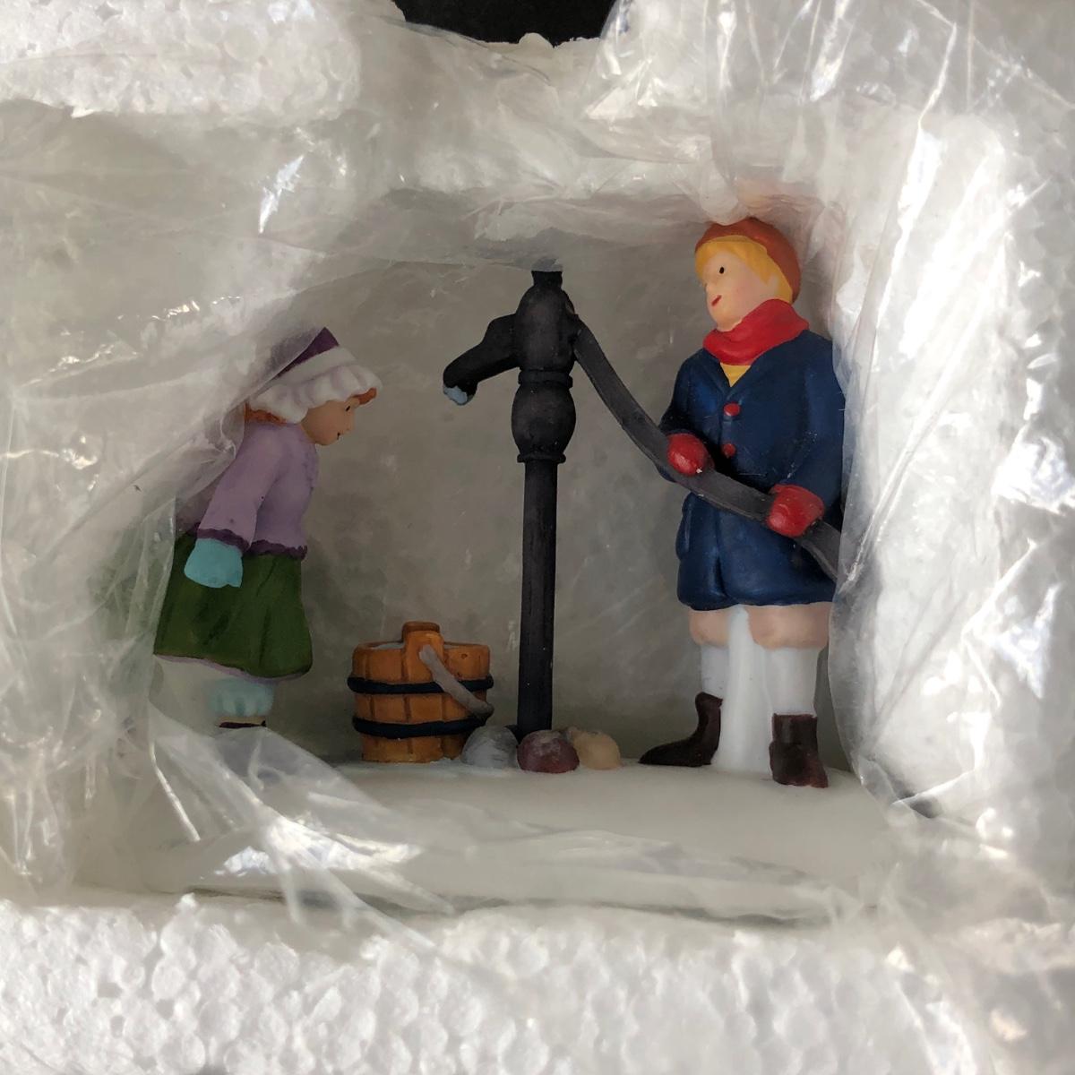 LOT 23G: Department 56 - 2006 Frasier Family Barn (56.58755), 2002 Codington Cottage (56.58514), Fetching the Days Water (56.58805) w/ Farm Animals (56.56588 - missing hay) & Natural Evergreens