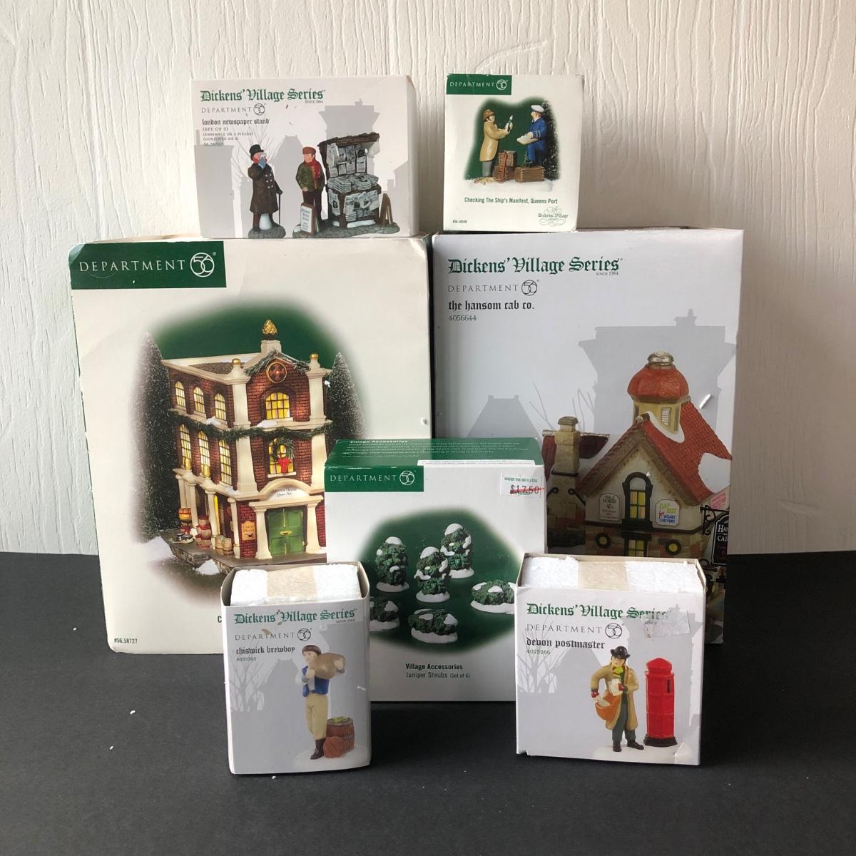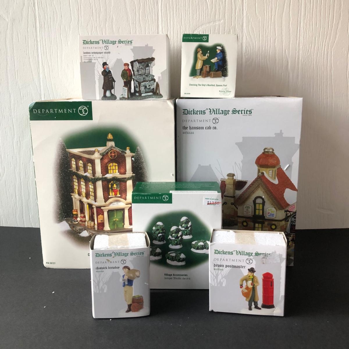 LOT 25G: Department 56 Dickens' Village - 2004 Customs House, Queens Port (56.58727), 2017 The Hansom Cab Co. (4056644), London Newspaper Stand (56.58560) & More