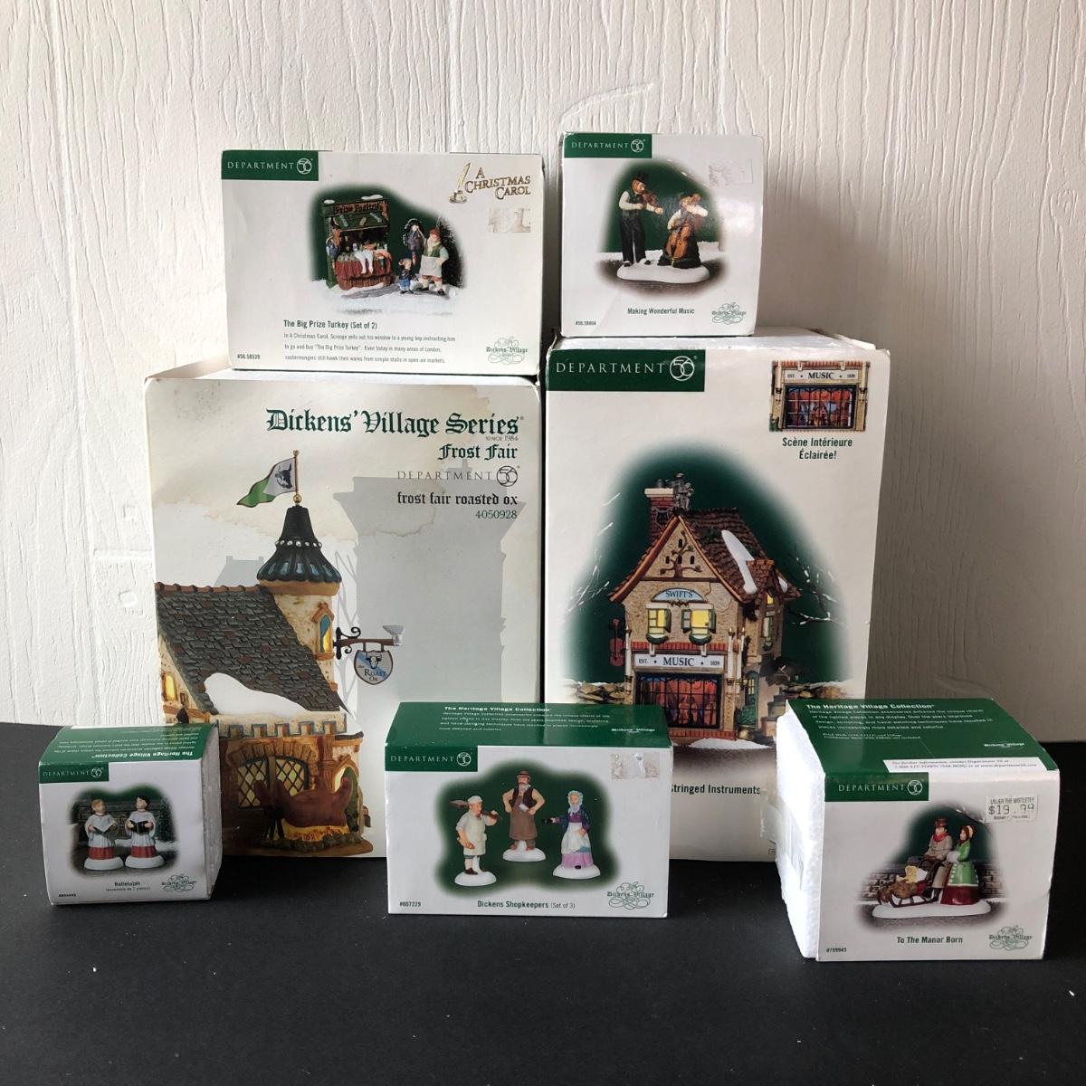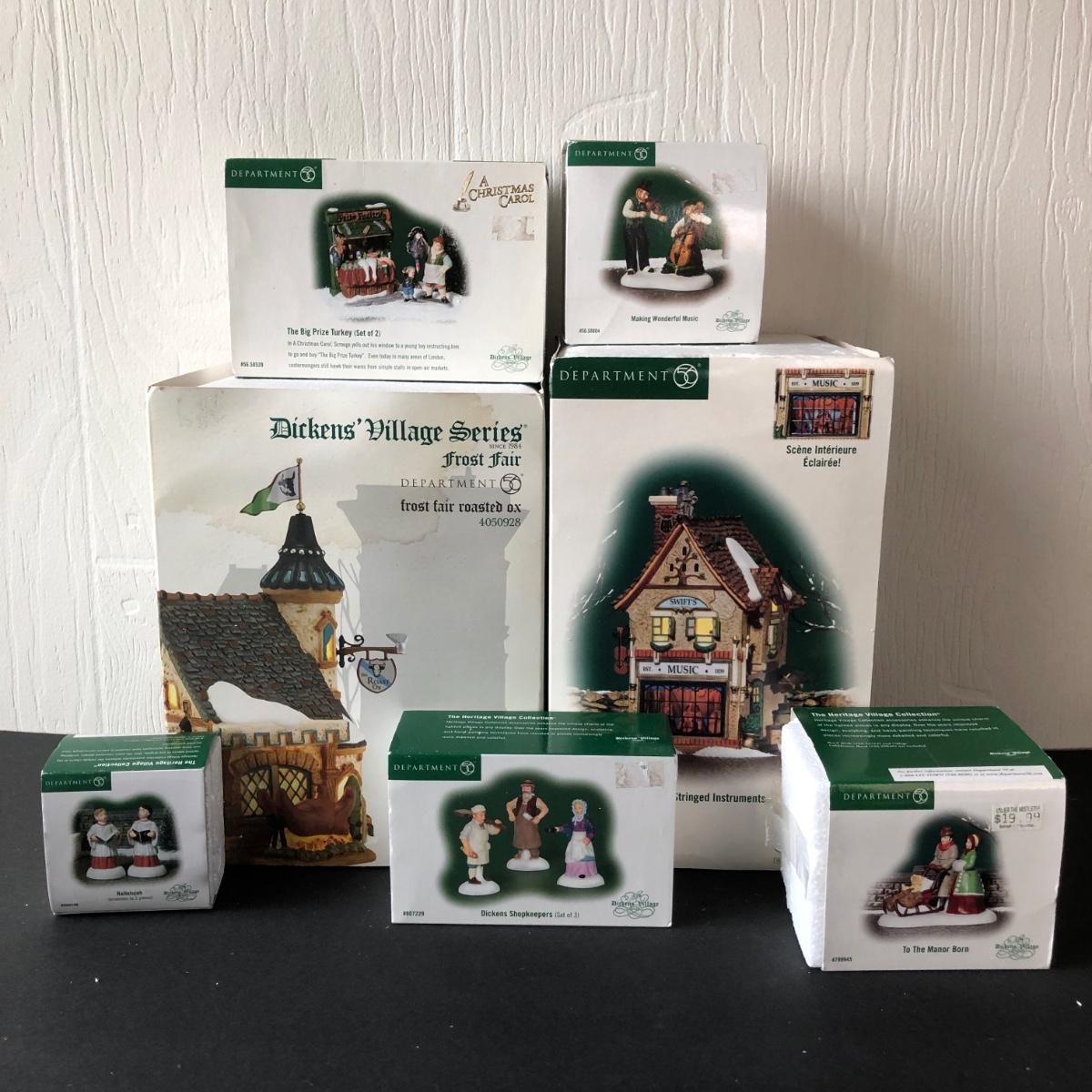 LOT 26G: Department 56 Dickens' Village - 2016 Frost Fair Roasted Ox (4050928), 2006 Swift's String Instruments (56.58753), A Christmas Carol Big Prize Turkey (56.58539) & More
