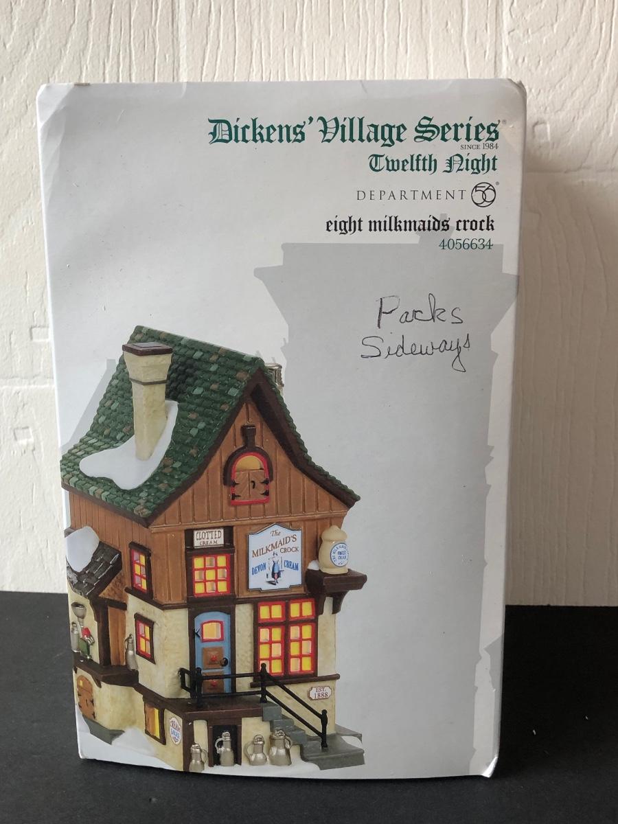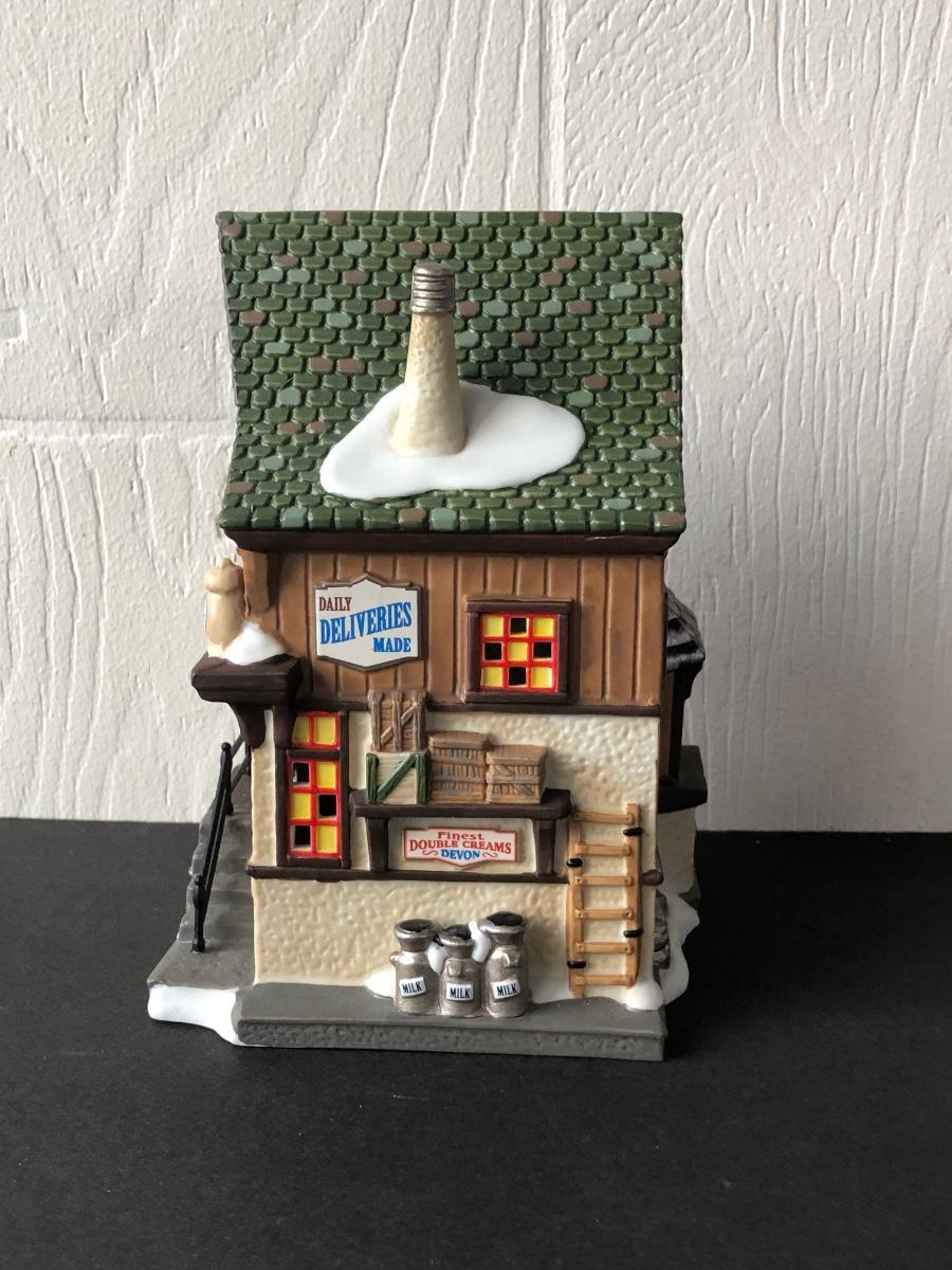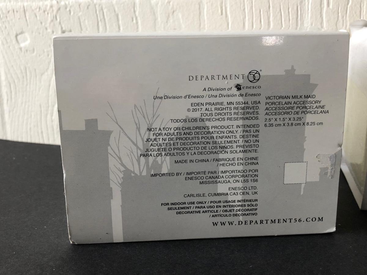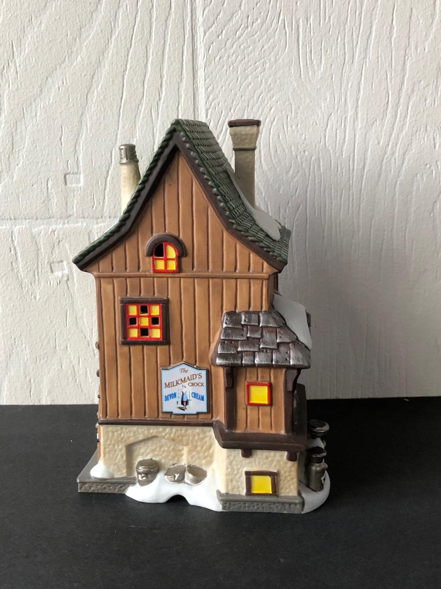 LOT 27G: Department 56 Dickens' Village - 2019 Victorian Grange House (6003071), 2017 Eight Milkmaids Crock (4056634), 2012 Devon Brook Span Cottage (4025257), Victorian Milk Maid (4056641)