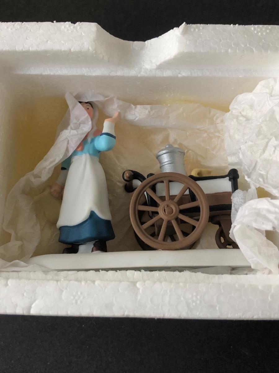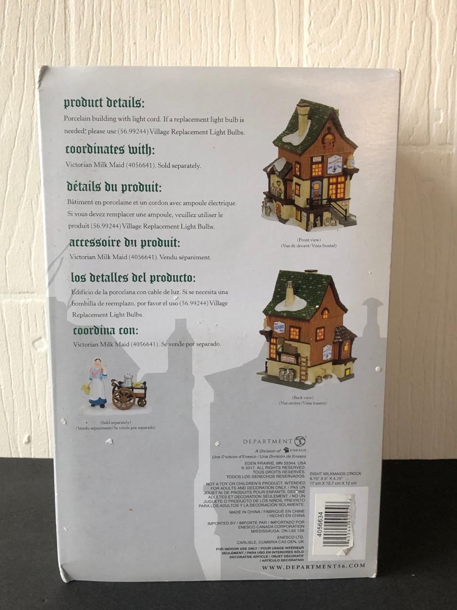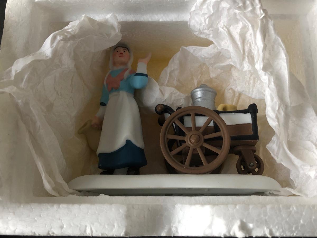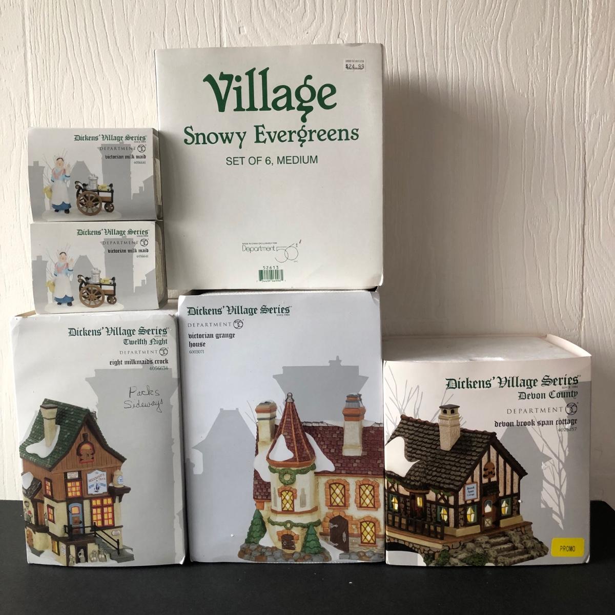 LOT 27G: Department 56 Dickens' Village - 2019 Victorian Grange House (6003071), 2017 Eight Milkmaids Crock (4056634), 2012 Devon Brook Span Cottage (4025257), Victorian Milk Maid (4056641)