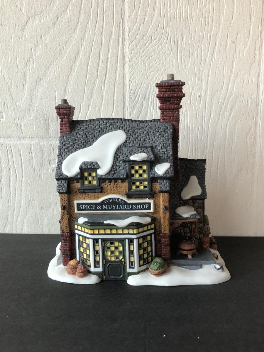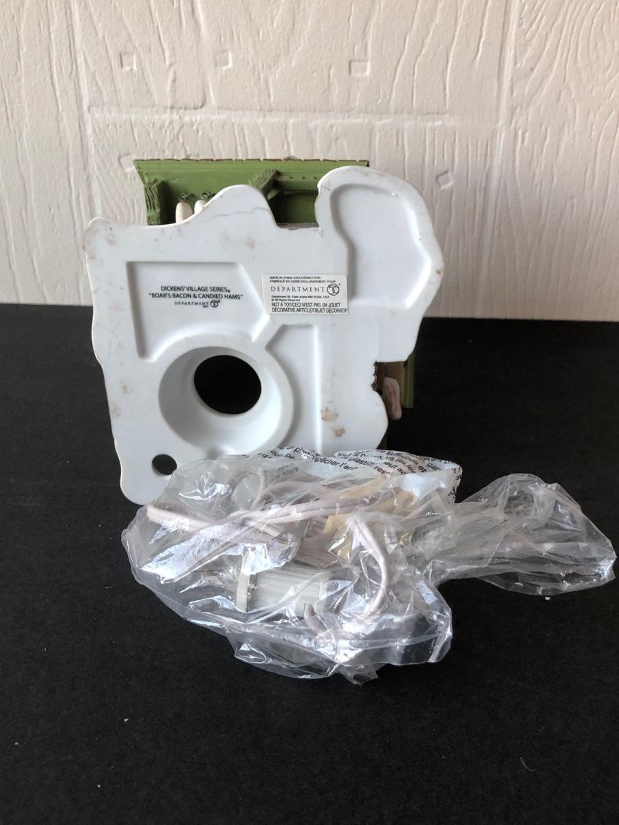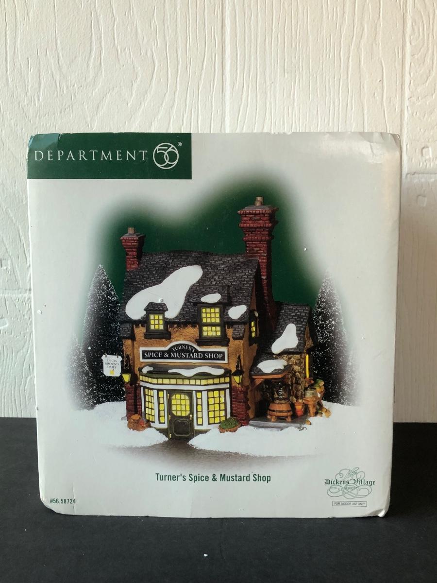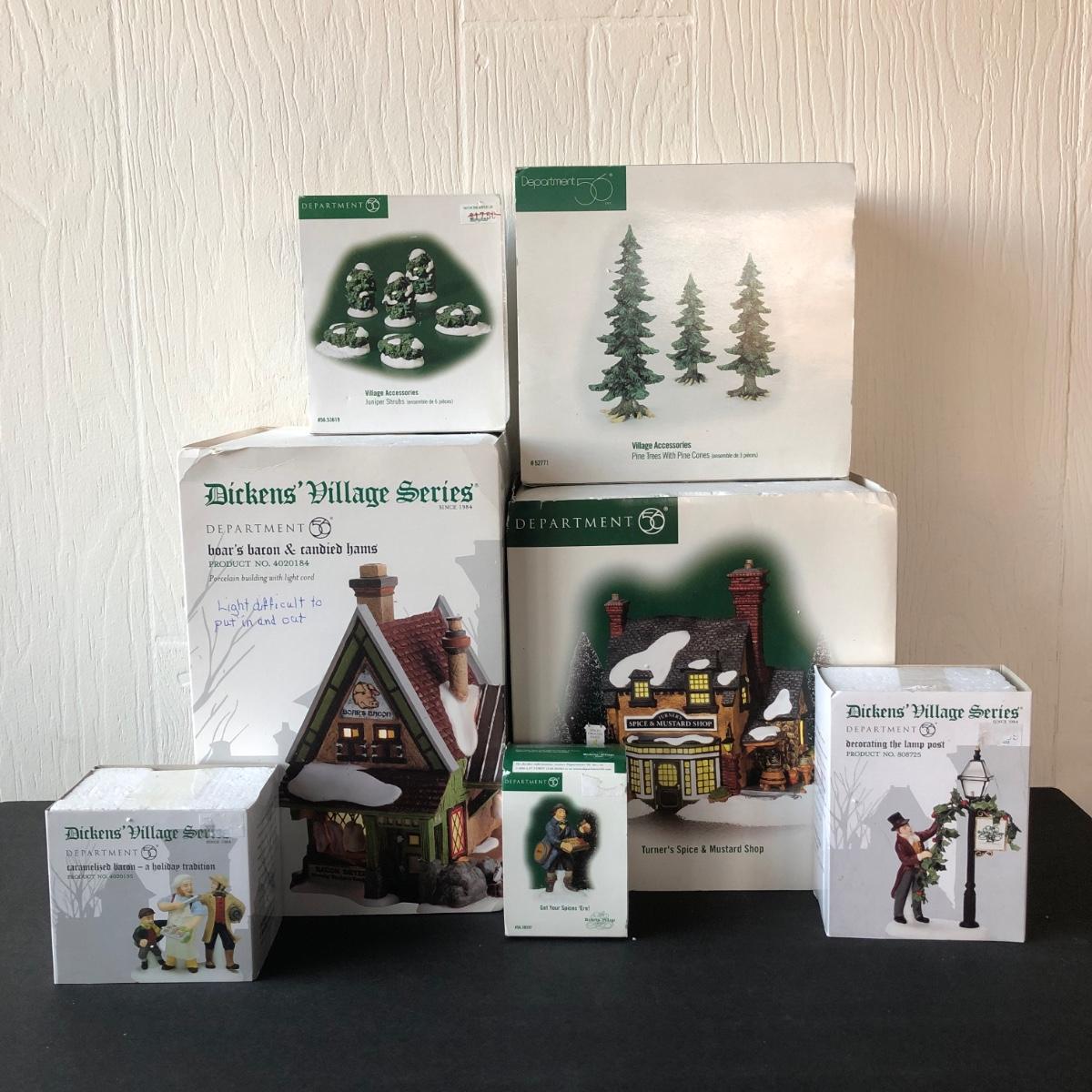 LOT 35F: Department 56 Dickens' Village - Boar's Bacon & Candied Hams (4020184), 2004 Turner's Spice & Mustard Shop (56.58274), Pine Trees w/ Pine Cones (52771) & More