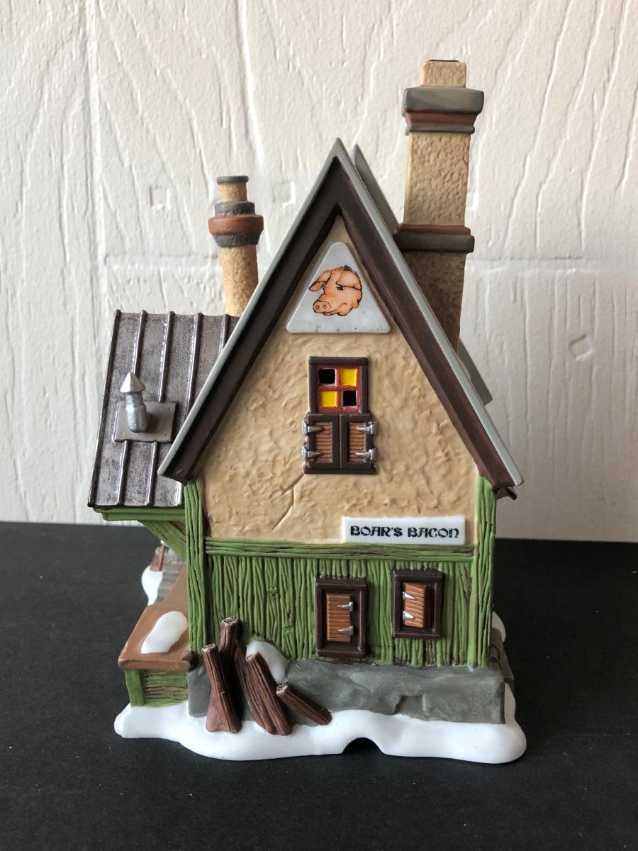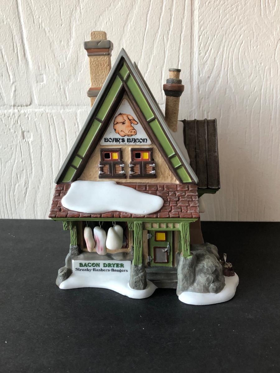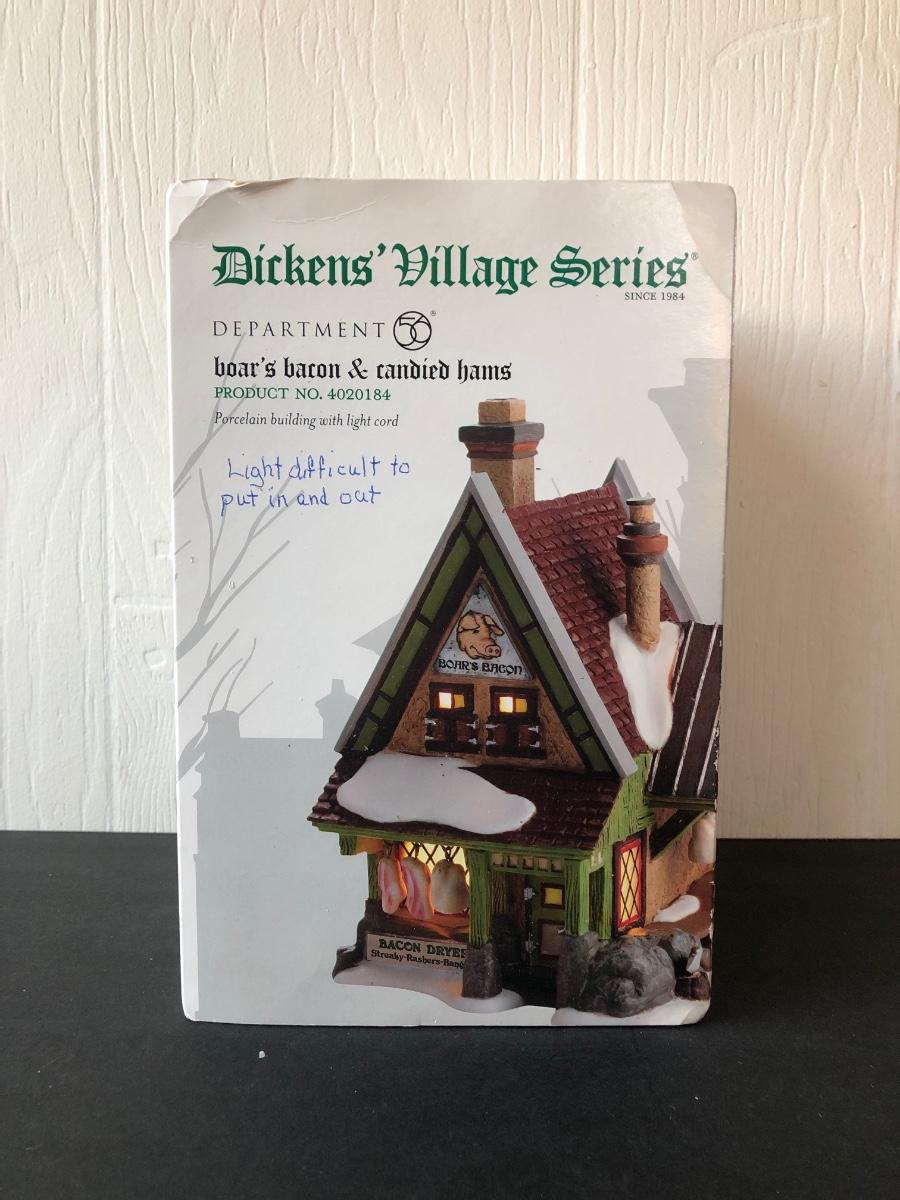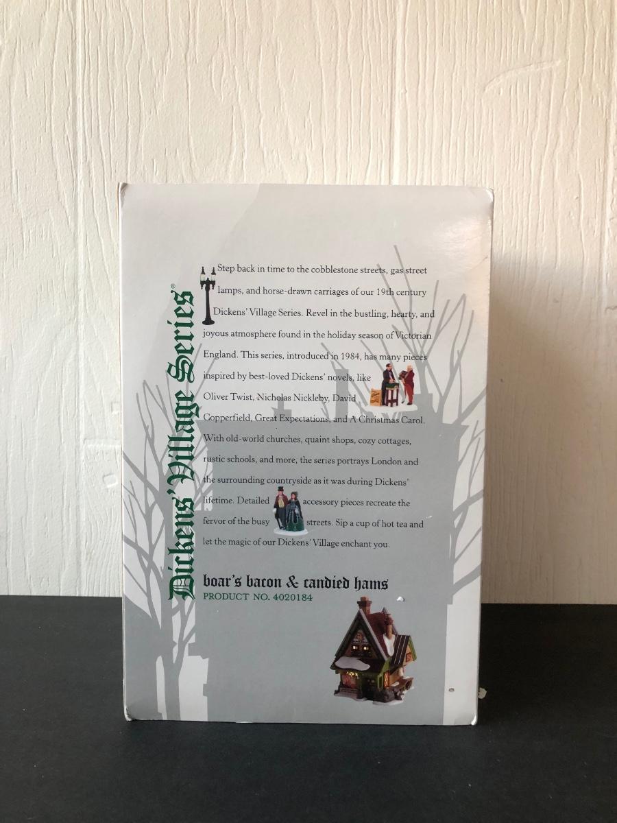 LOT 35F: Department 56 Dickens' Village - Boar's Bacon & Candied Hams (4020184), 2004 Turner's Spice & Mustard Shop (56.58274), Pine Trees w/ Pine Cones (52771) & More