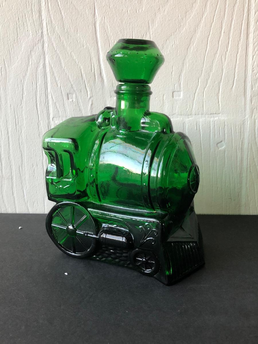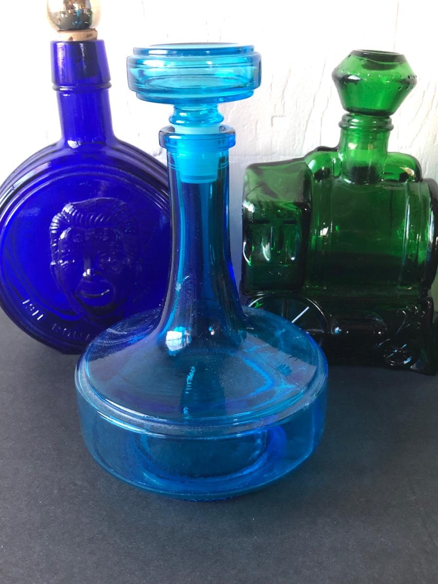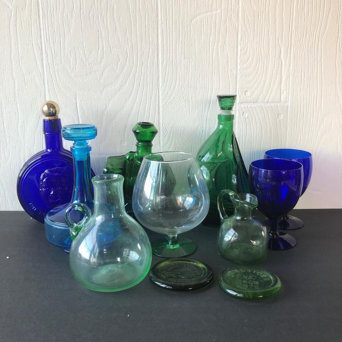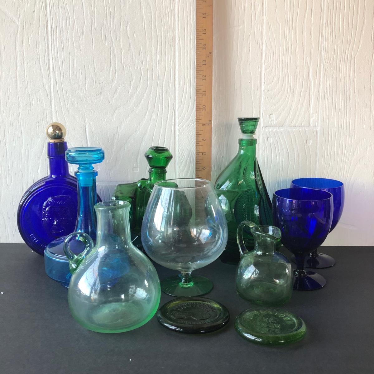 LOT 37B: Blue & Green Glass Collection - Ronald Reagan Wheaton Bottle, Jamestown Paperweight, Yorktown National Battlefield Paperweight, Train & Ship Decanters & More