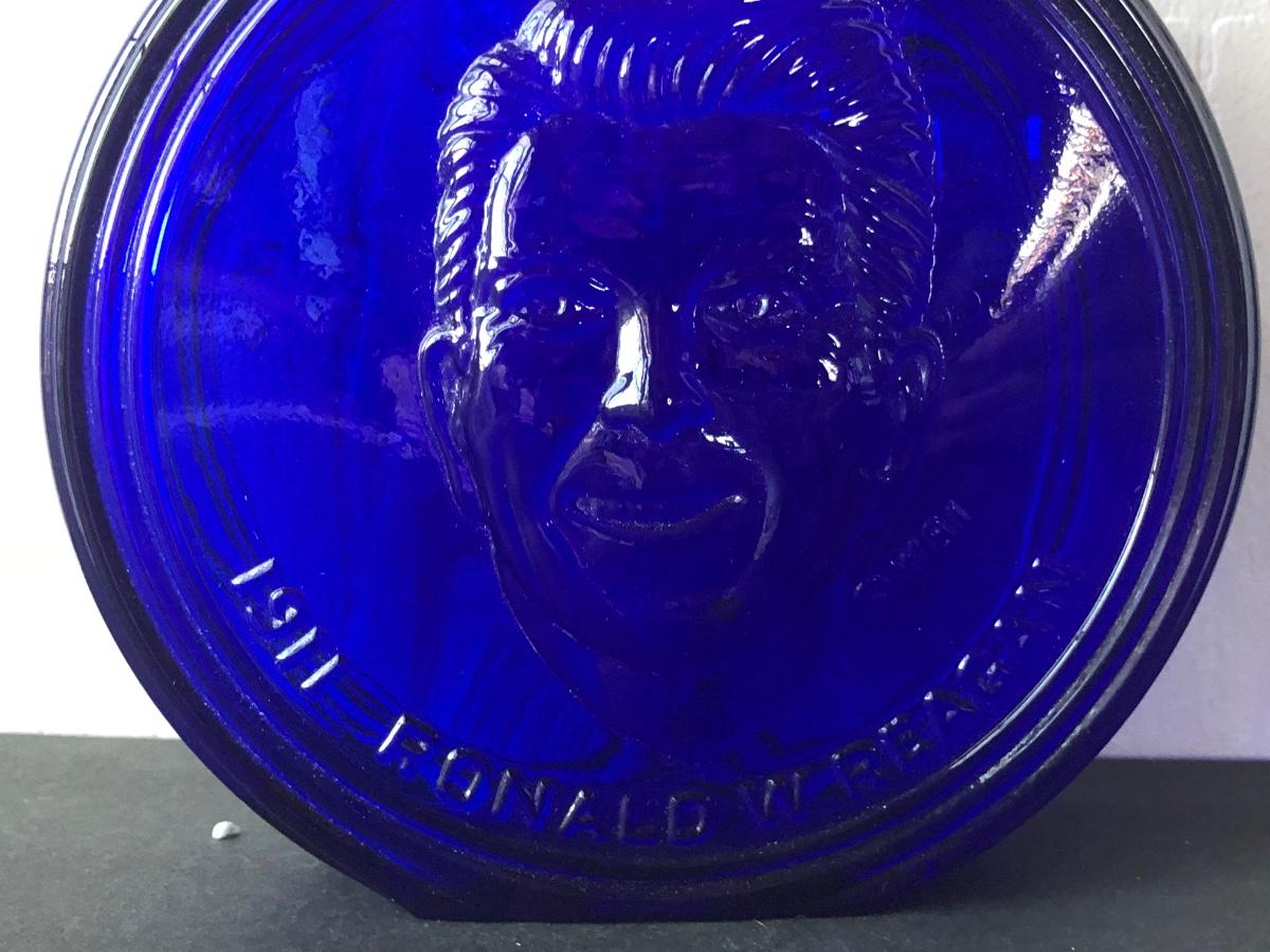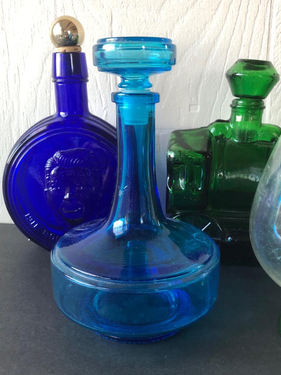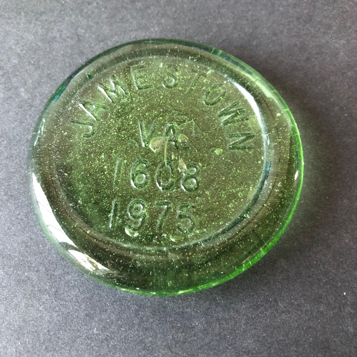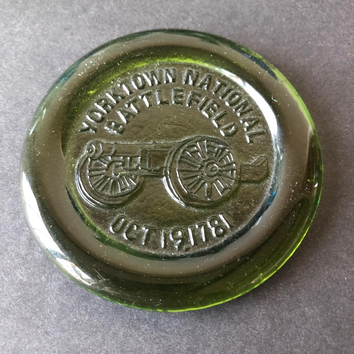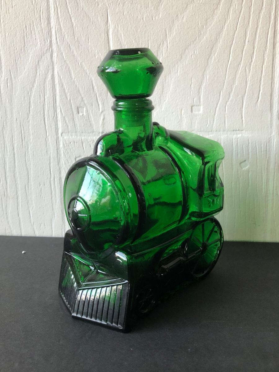LOT 37B: Blue & Green Glass Collection - Ronald Reagan Wheaton Bottle, Jamestown Paperweight, Yorktown National Battlefield Paperweight, Train & Ship Decanters & More
