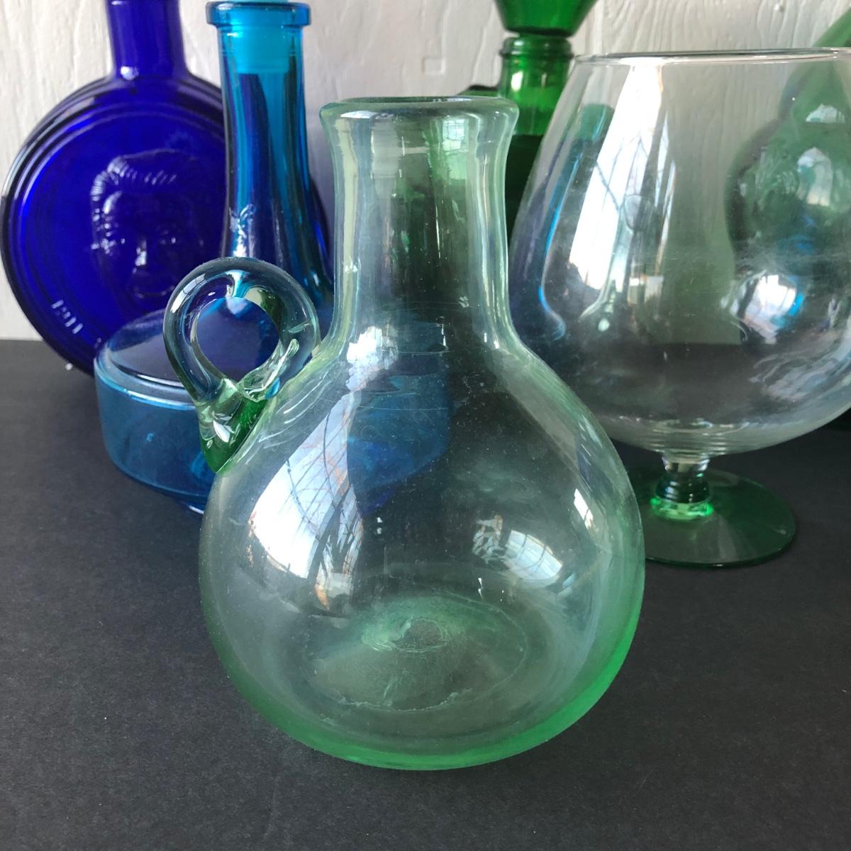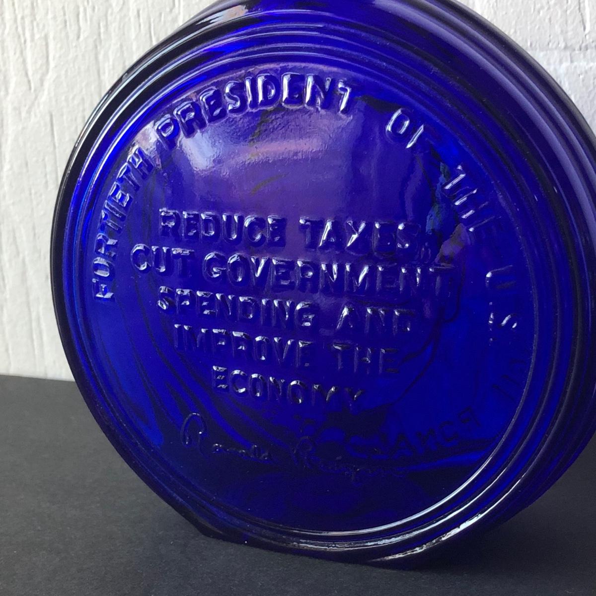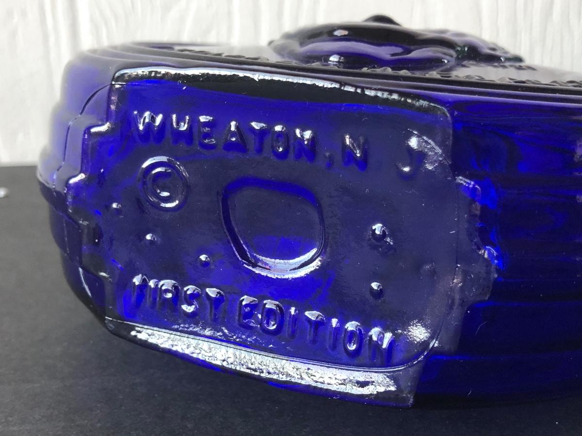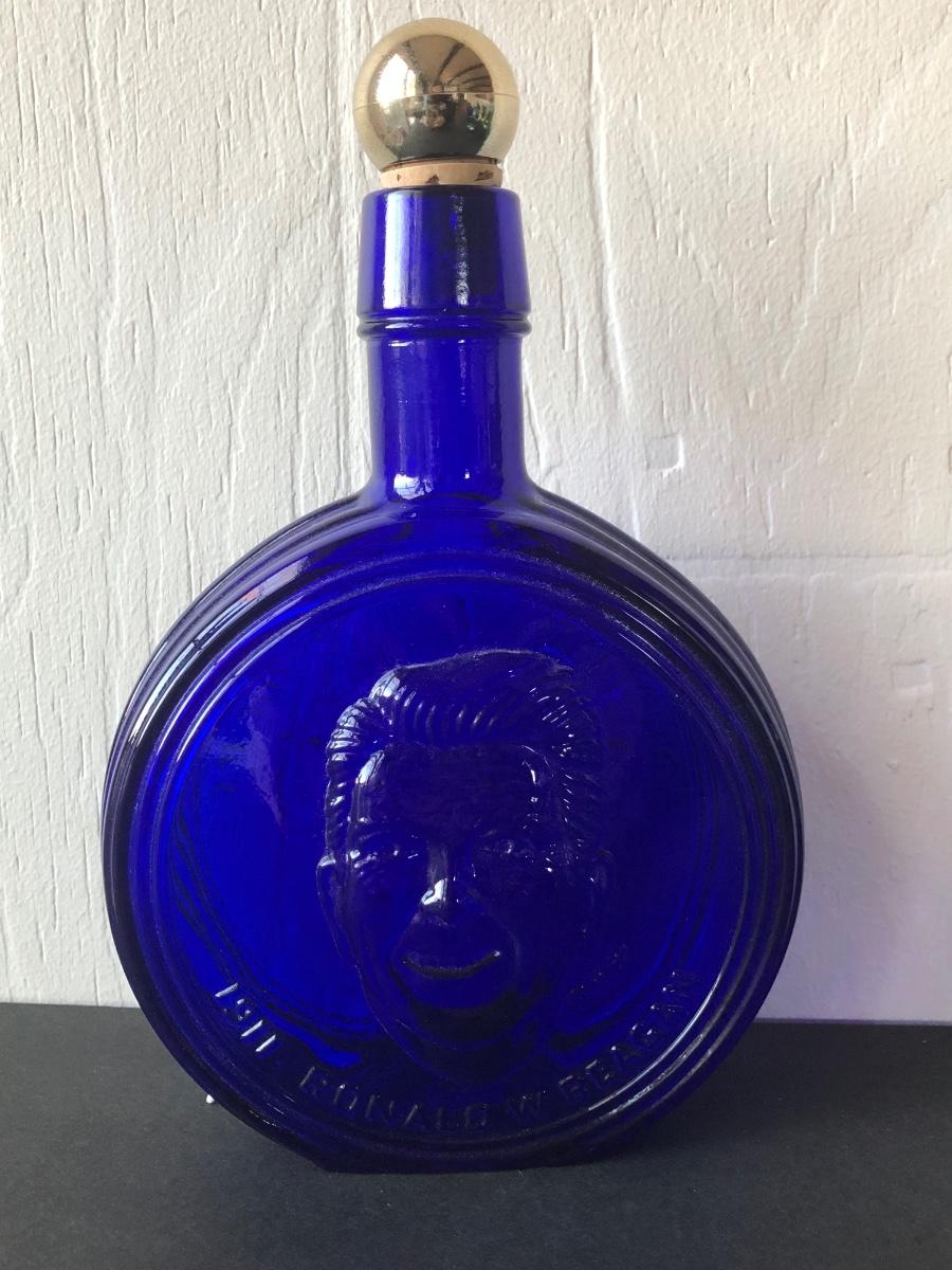 LOT 37B: Blue & Green Glass Collection - Ronald Reagan Wheaton Bottle, Jamestown Paperweight, Yorktown National Battlefield Paperweight, Train & Ship Decanters & More