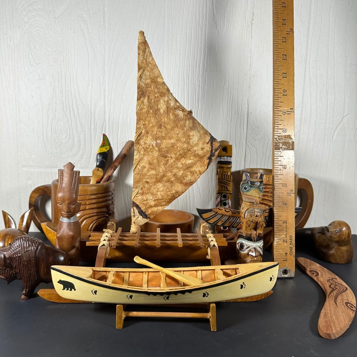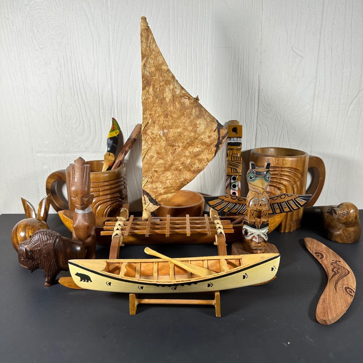 LOT 55B: Wooden Collectables / Souvenirs - Australian Boomerang, Hand Carved Mugs, & More