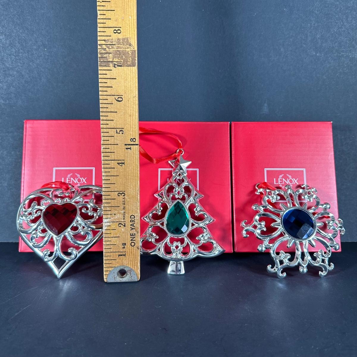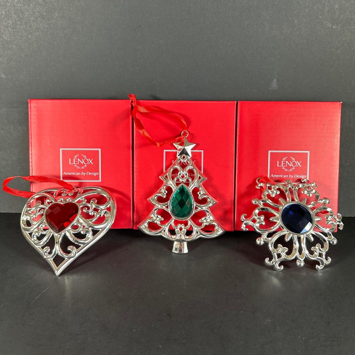 LOT 61G: Lenox Silver Plated Bejeweled Christmas Ornaments w/ Box (3)