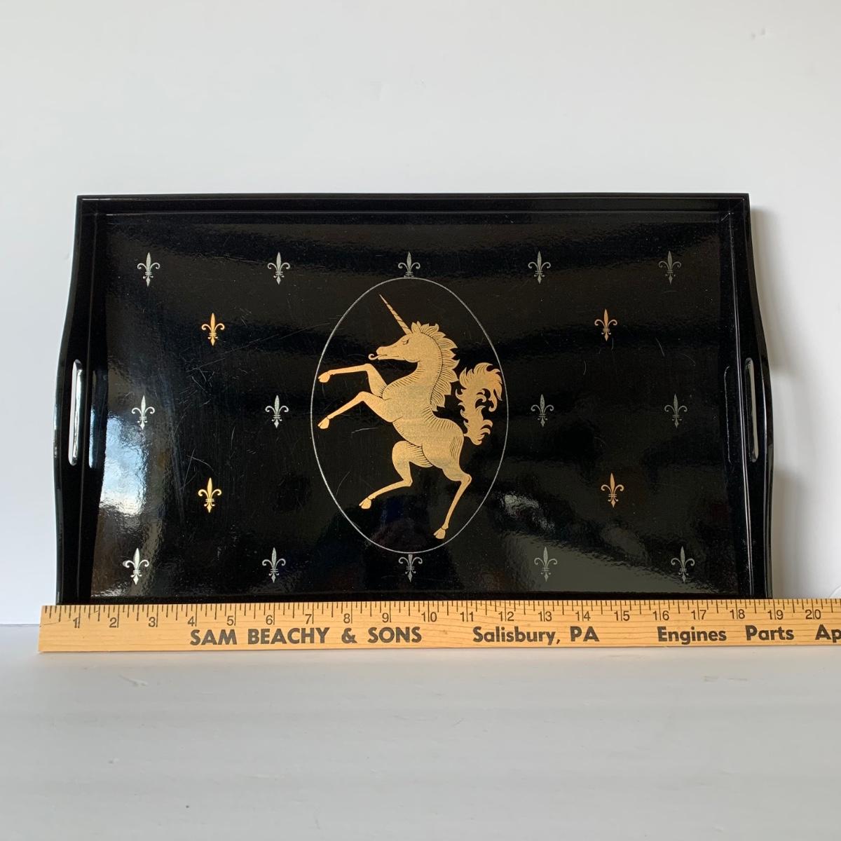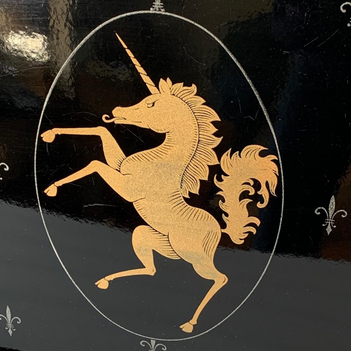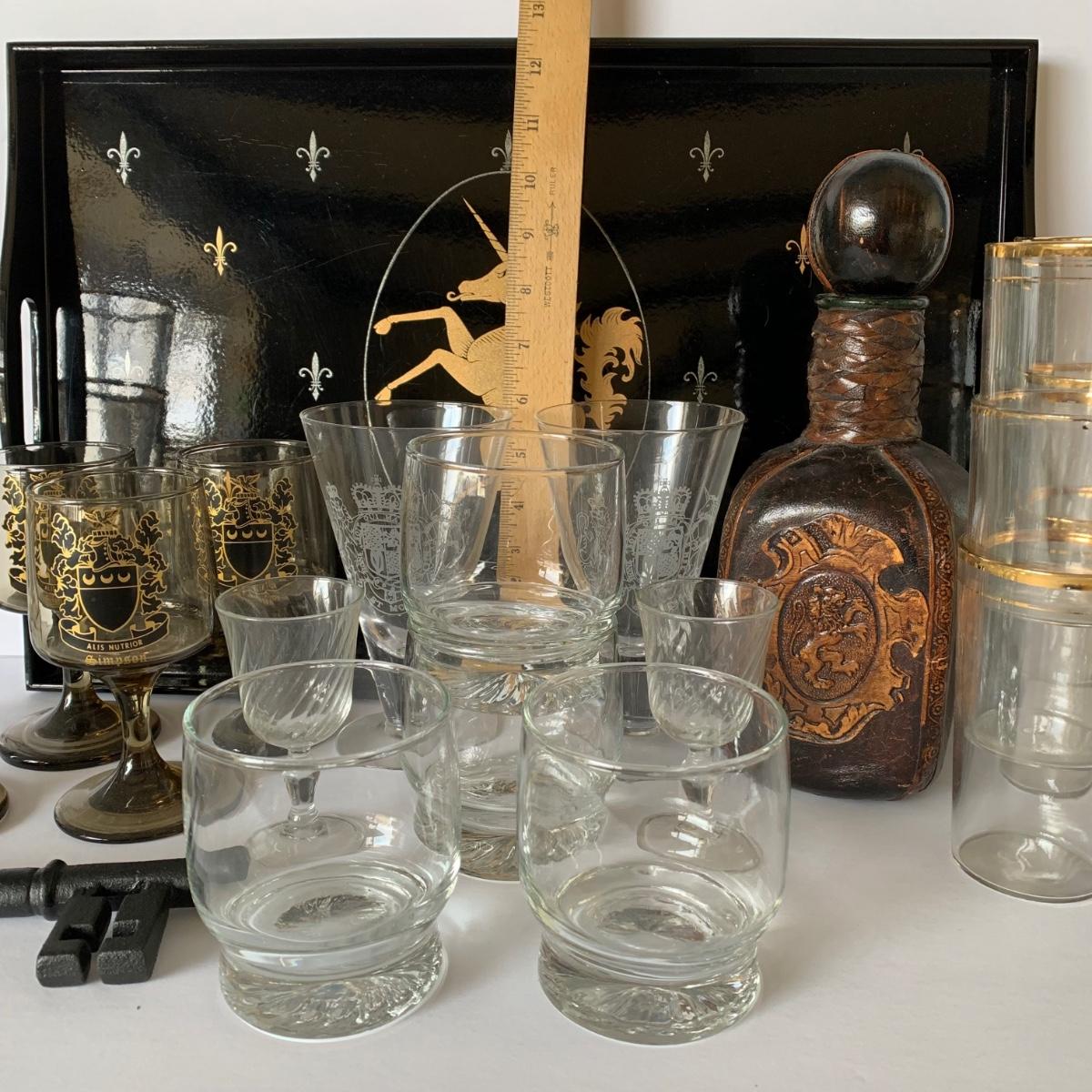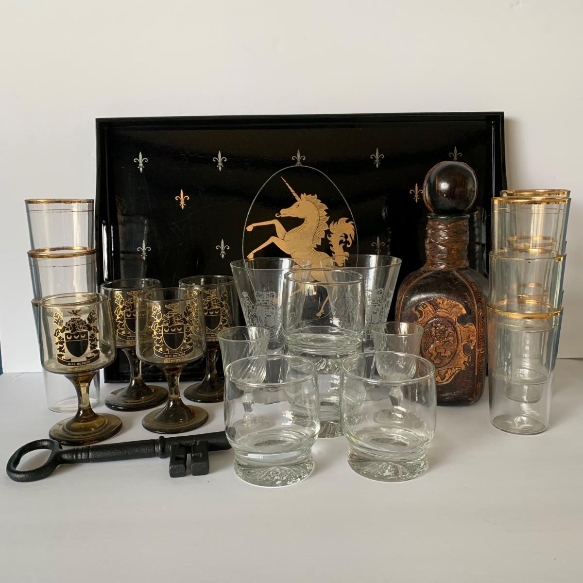LOT 88 G: Medieval Style Bar Collection: Vintage Black, Gold, & Silver Lacquered Unicorn Tray From Japan, Leather Bound & Embossed Liquor Decanter, Smokey Glass Goblets & More