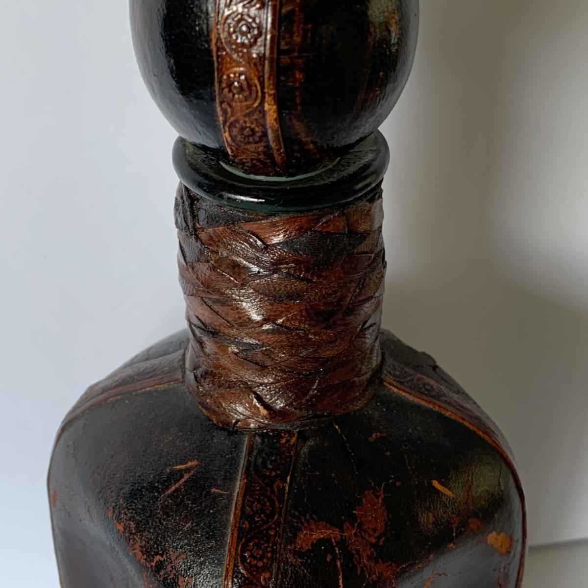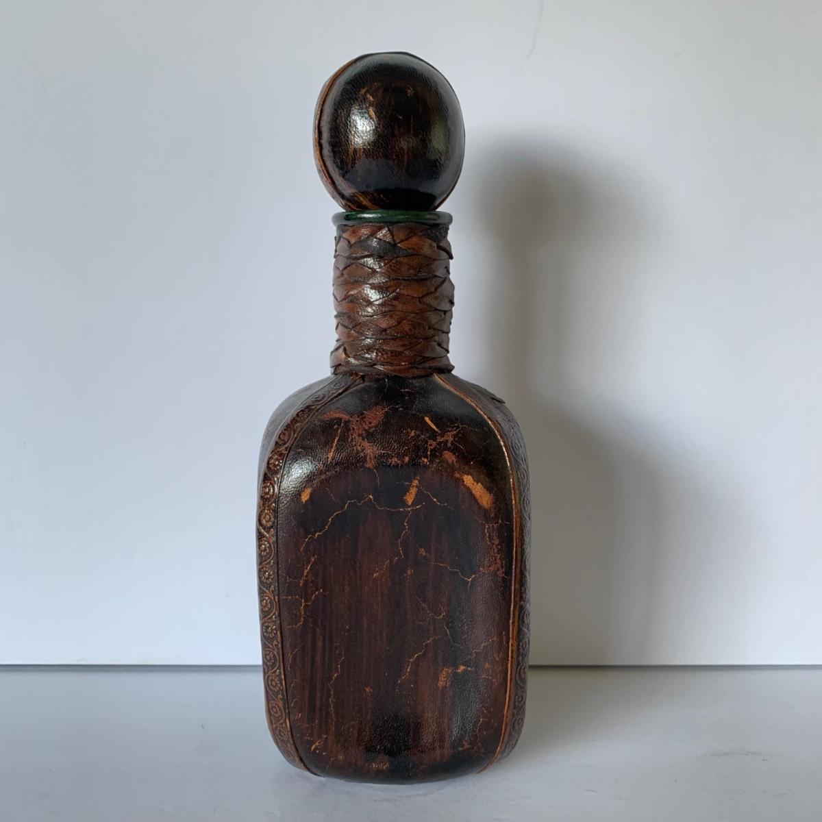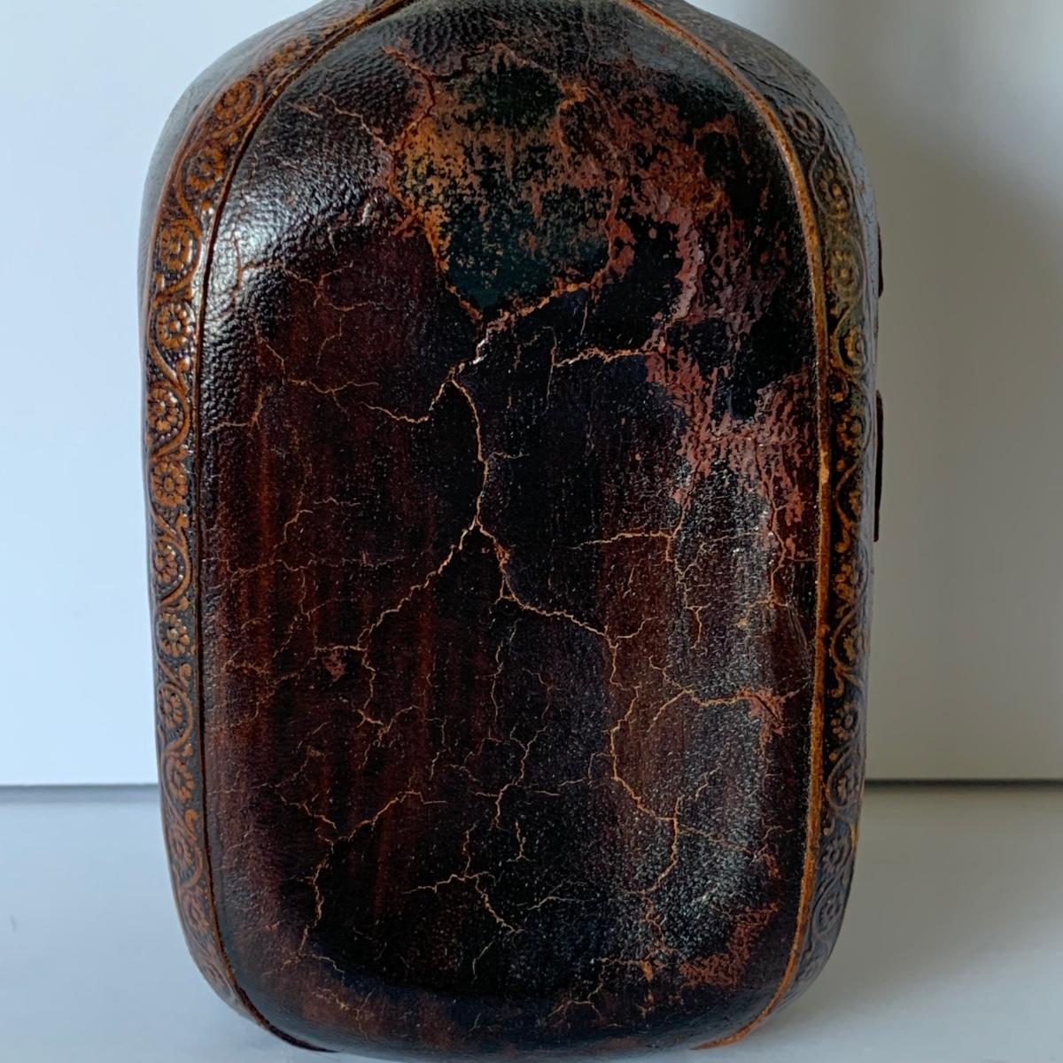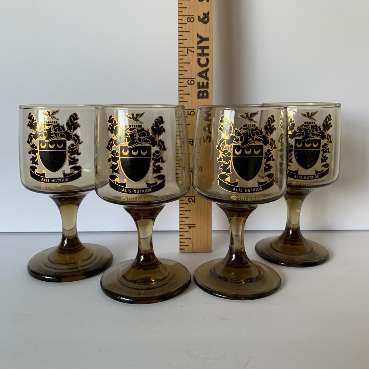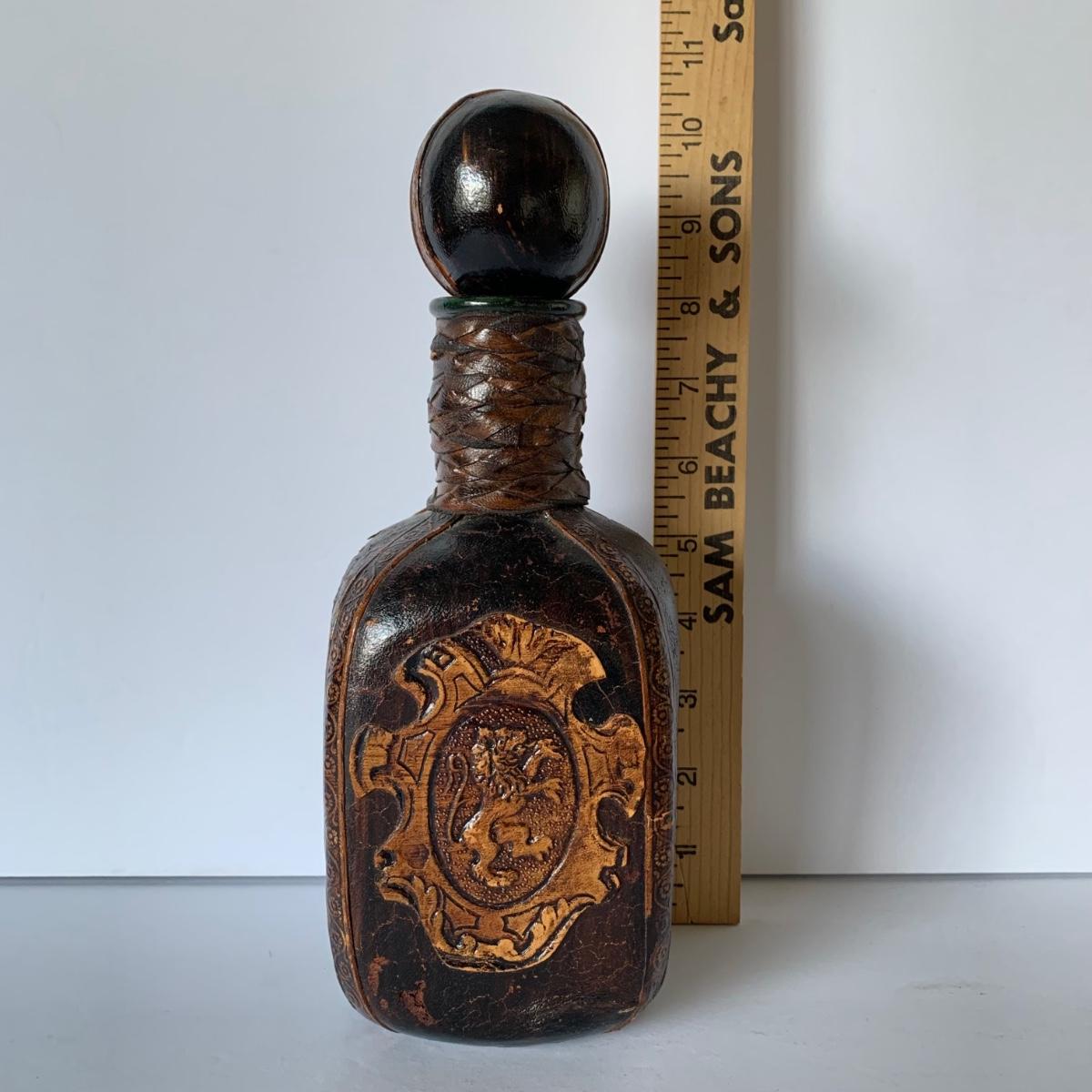 LOT 88 G: Medieval Style Bar Collection: Vintage Black, Gold, & Silver Lacquered Unicorn Tray From Japan, Leather Bound & Embossed Liquor Decanter, Smokey Glass Goblets & More