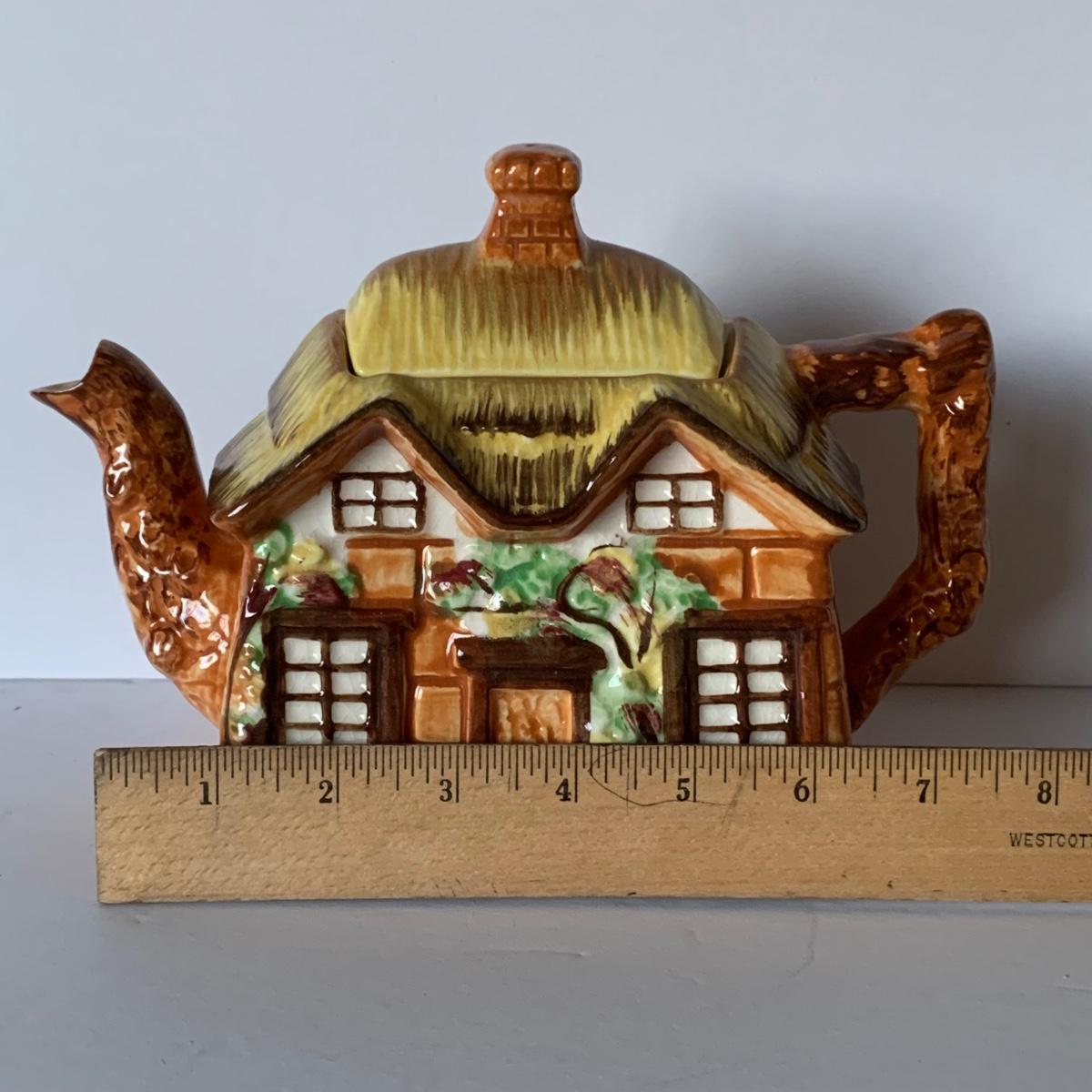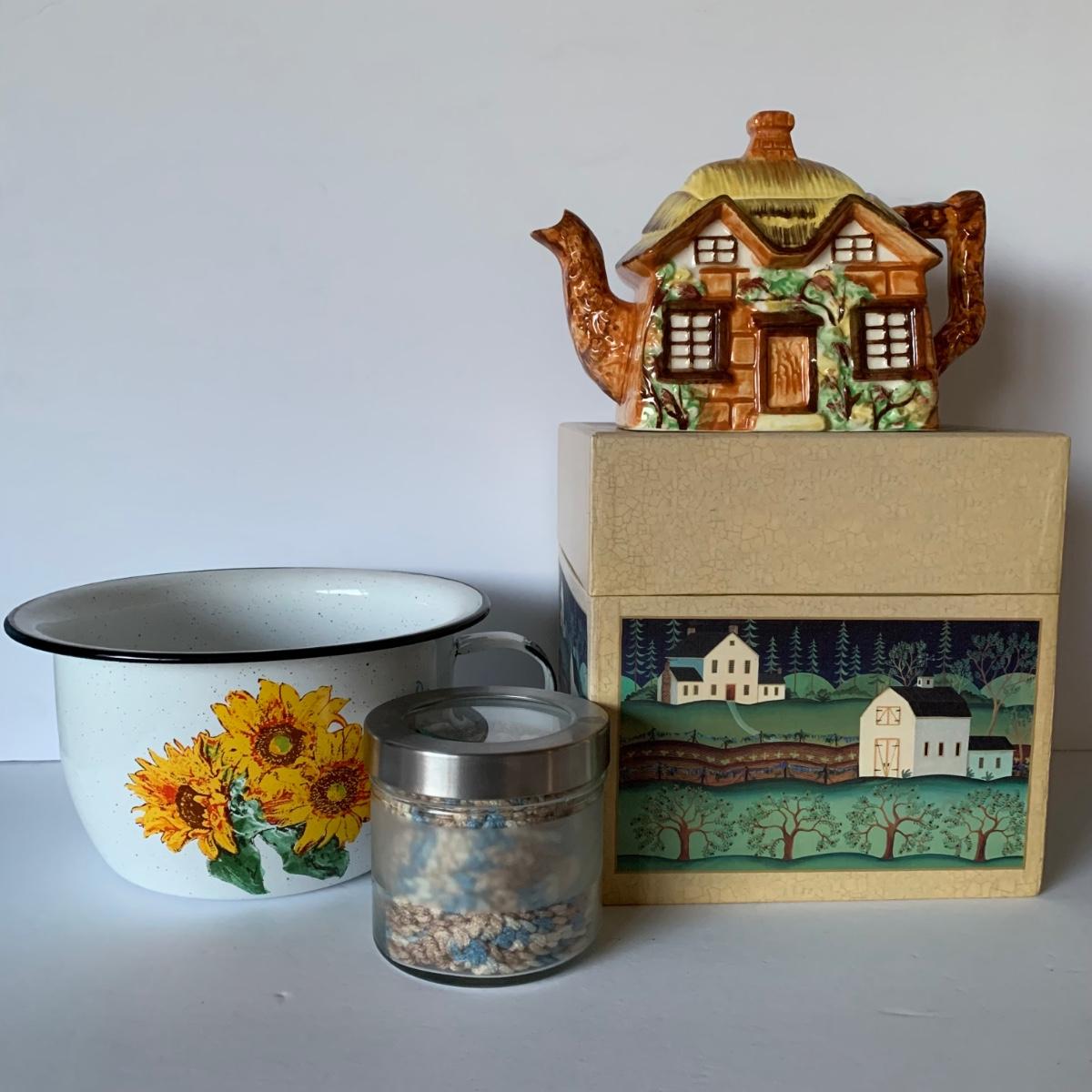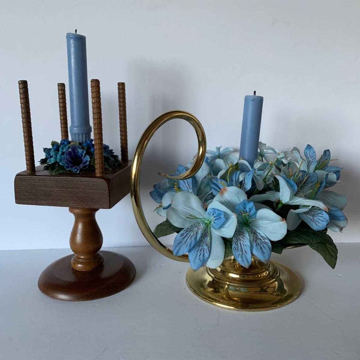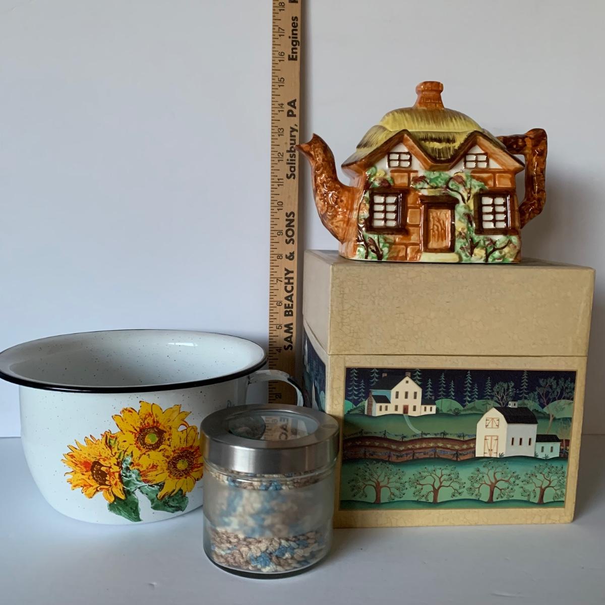 LOT 94 B: Cottage Style Decor Collection: Vintage Brass Baldwin Candle Holder, Wooden Cornwall Wood Products Pedestal Candle Holder, Cottage Tea Pot, & More