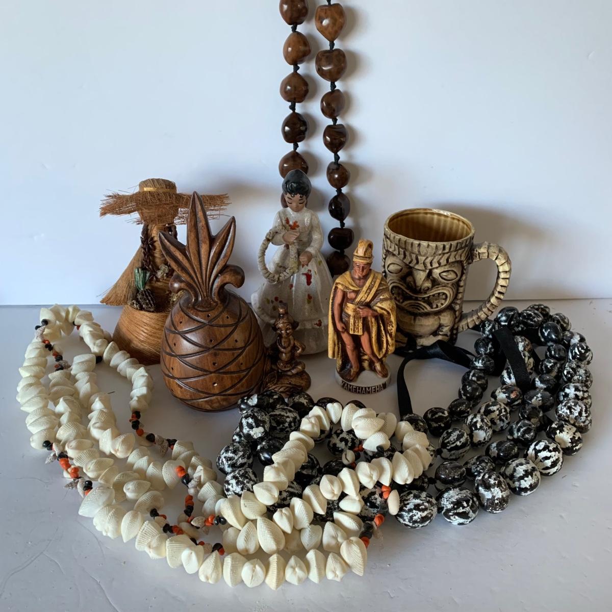 LOT 114 B: Hawaiian Collection: Kamehameha Okolehao Liquor Bottle, Kukui Nut Lei's & More