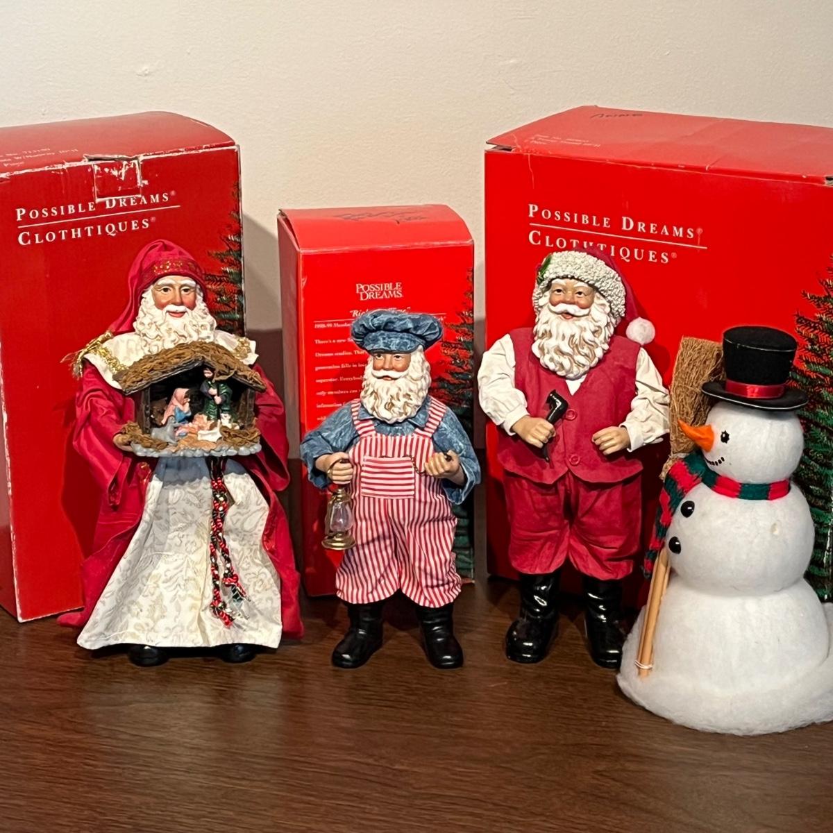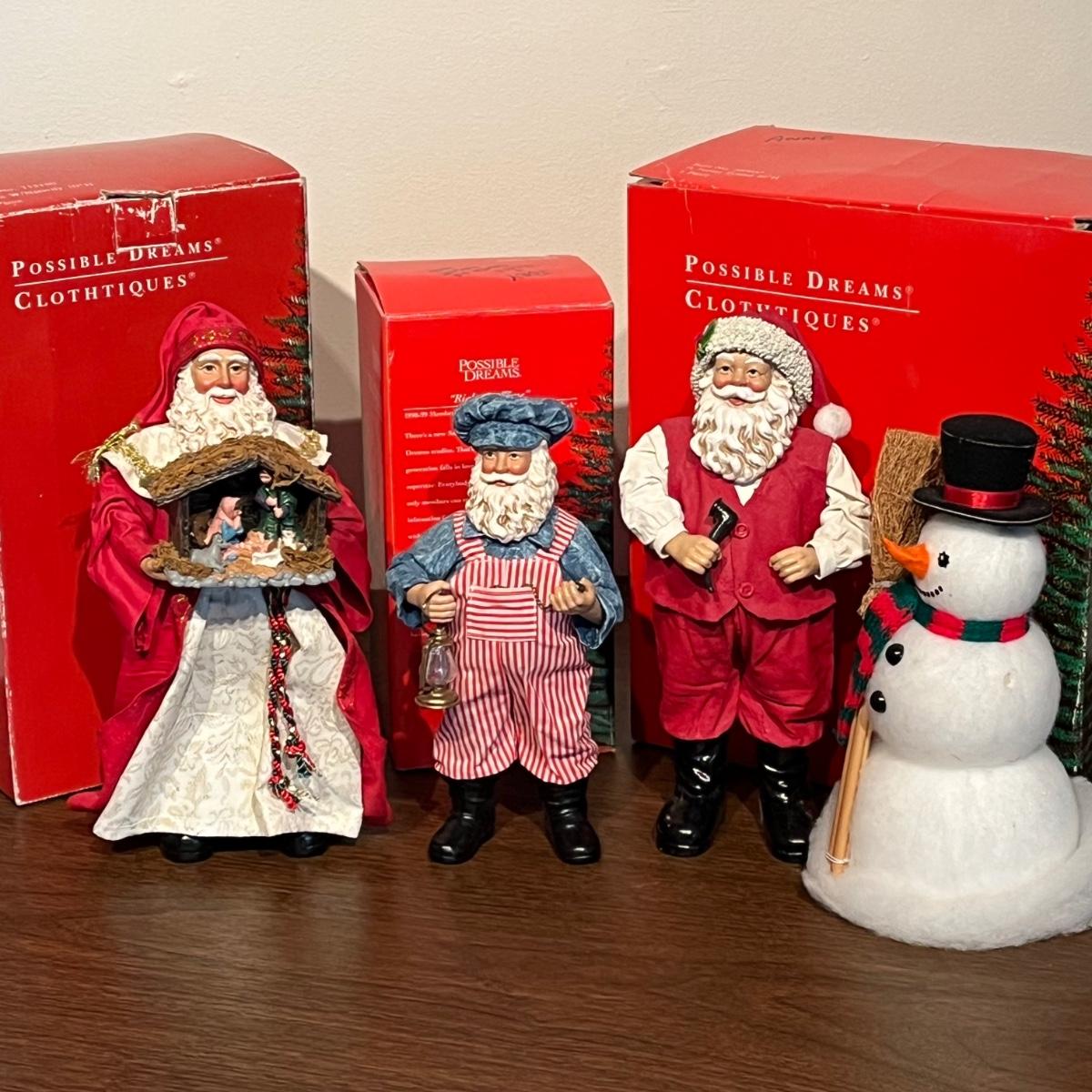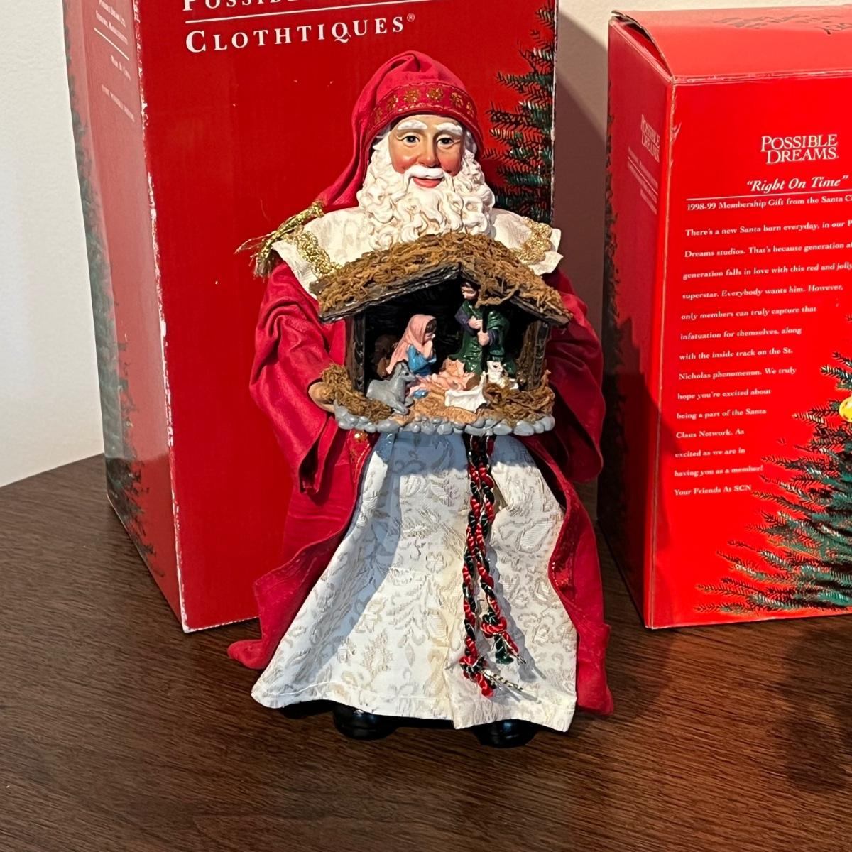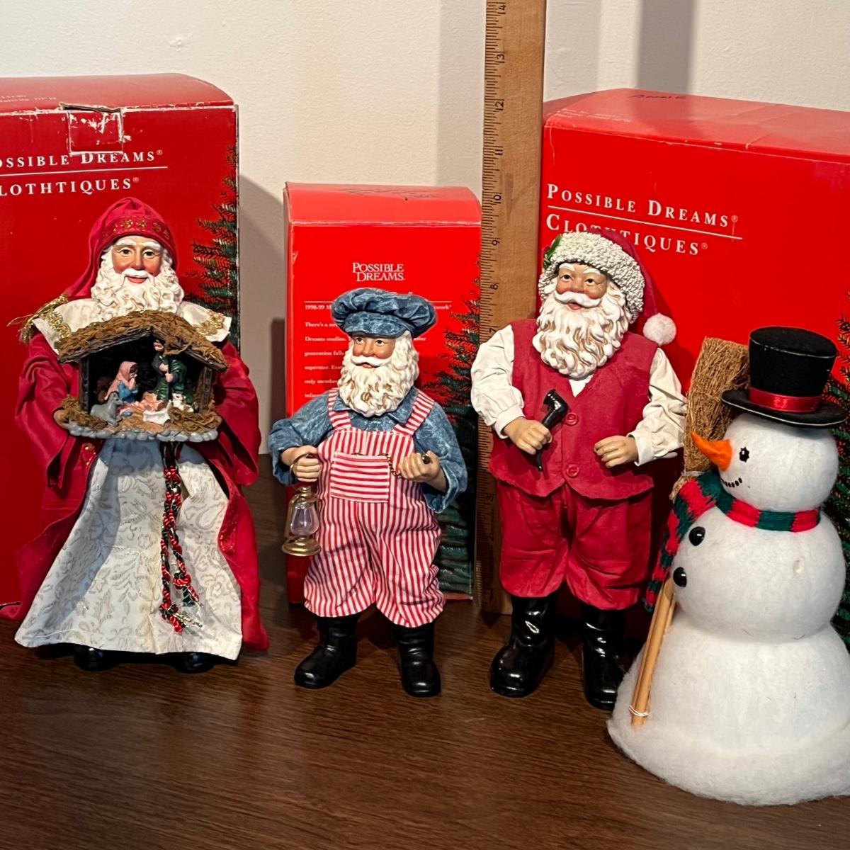 LOT 122G: Possible Dreams Clothtique Santa Figurines - Santa W/ Nativity, Right On Time, A Frosty Friend
