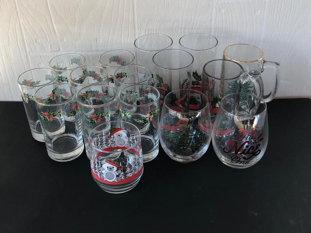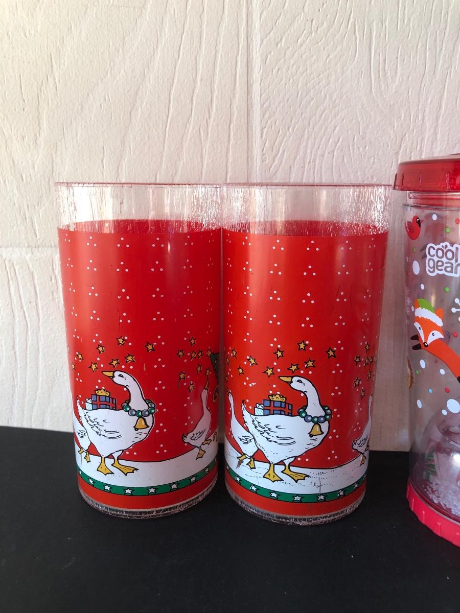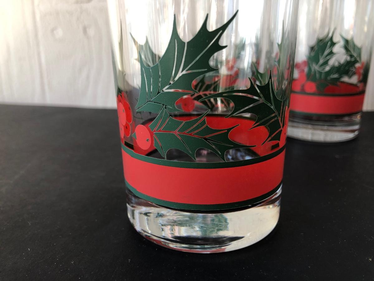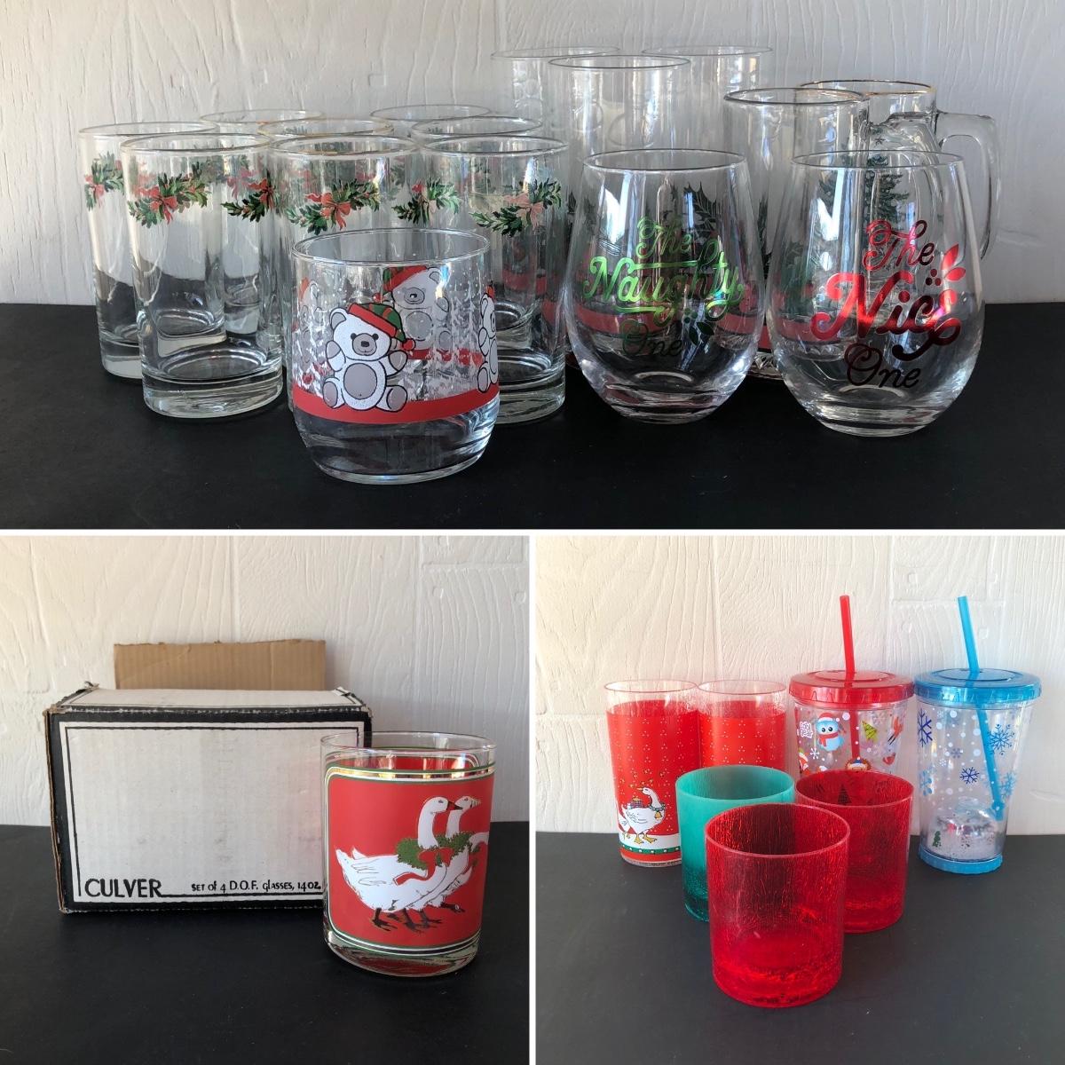 LOT 163B: Christmas Glasses & Plastic Cups - Libbey Holly Rim Glasses, Culver Goose Double Old Fashioned Glasses in Box & More