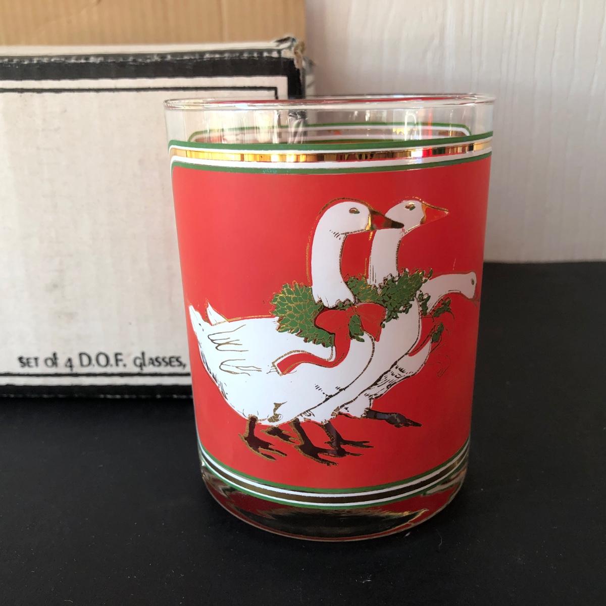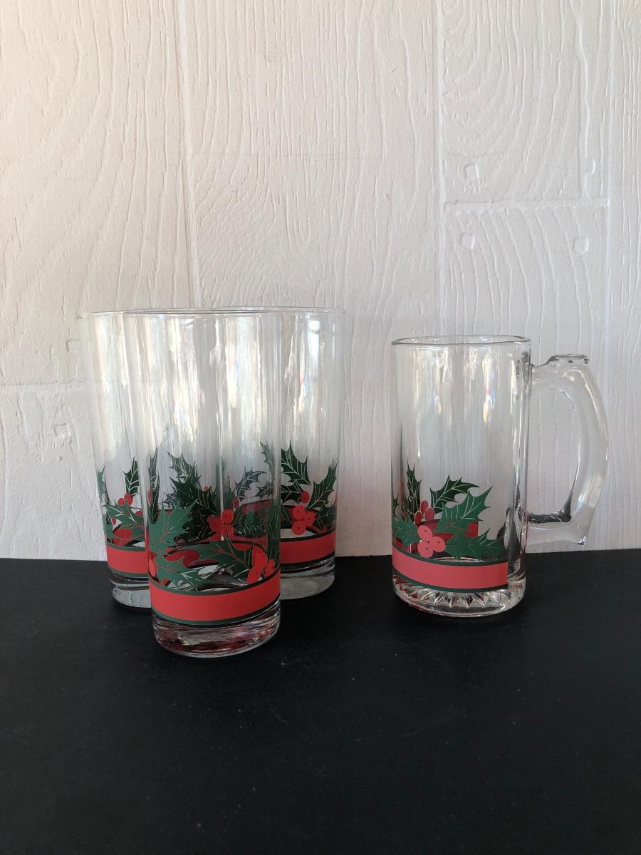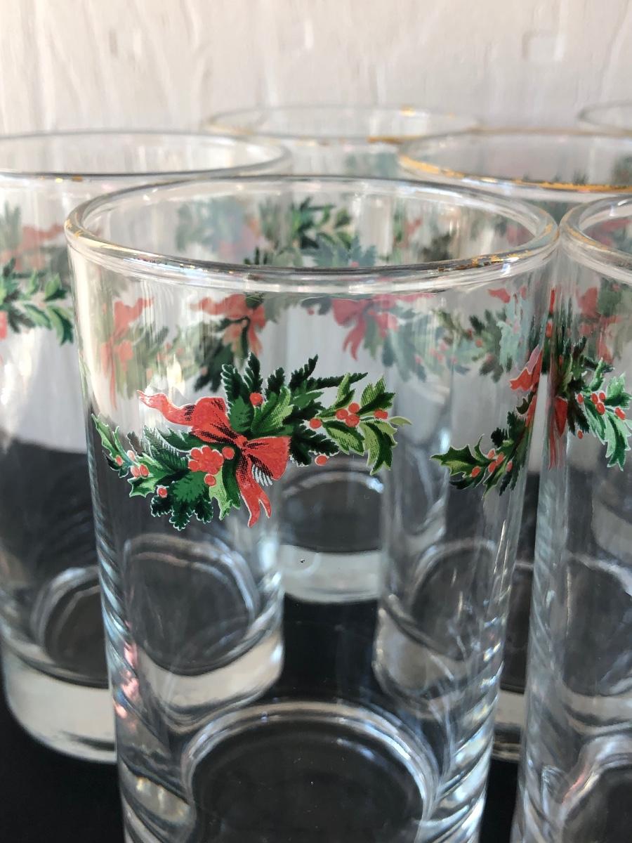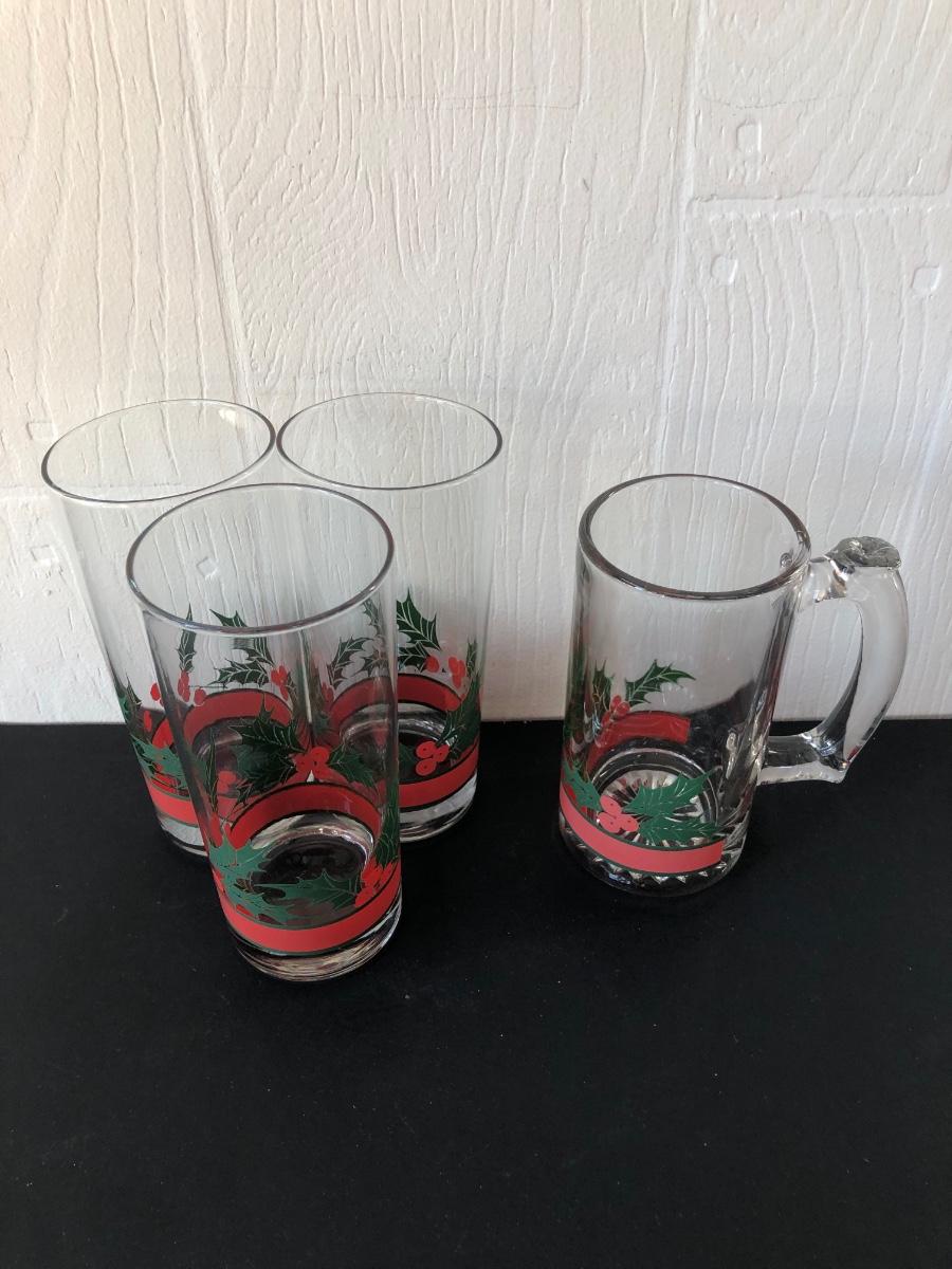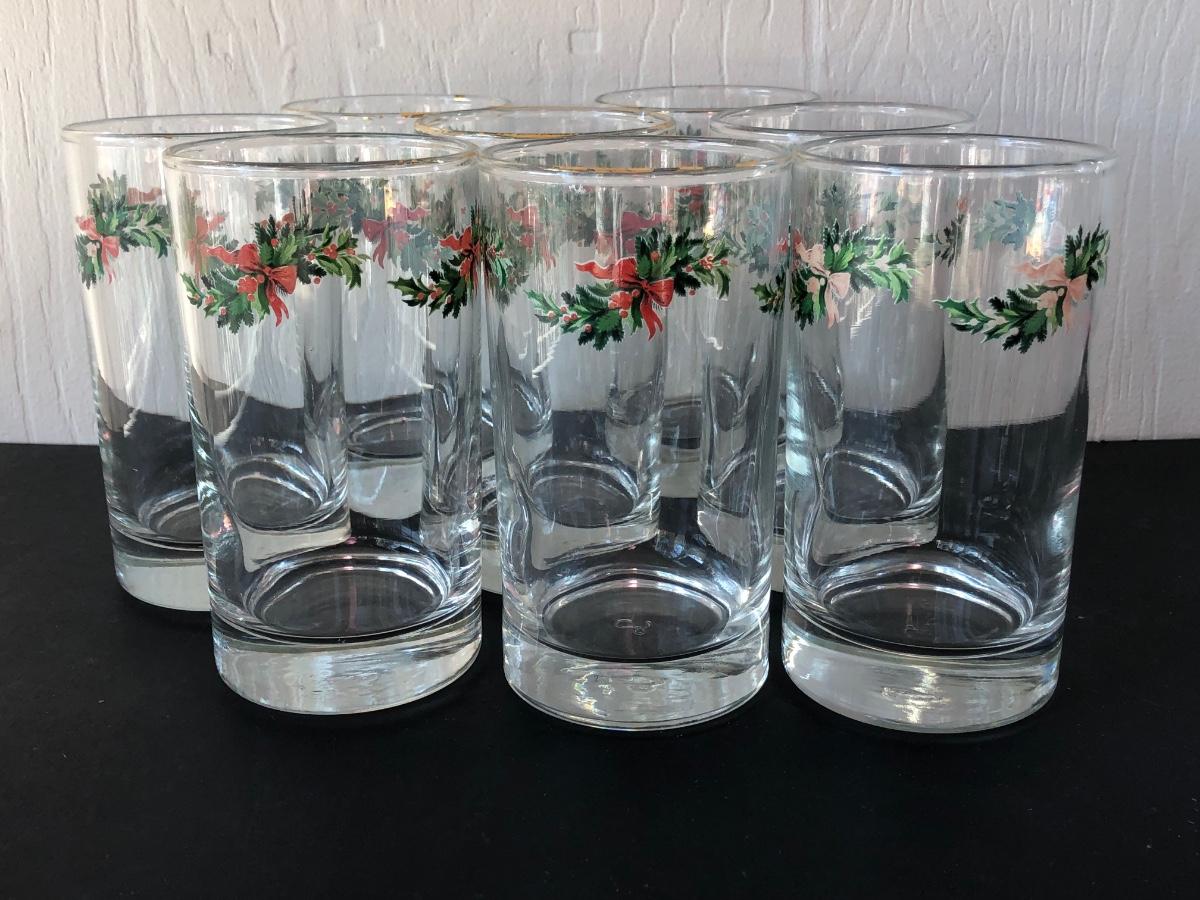 LOT 163B: Christmas Glasses & Plastic Cups - Libbey Holly Rim Glasses, Culver Goose Double Old Fashioned Glasses in Box & More