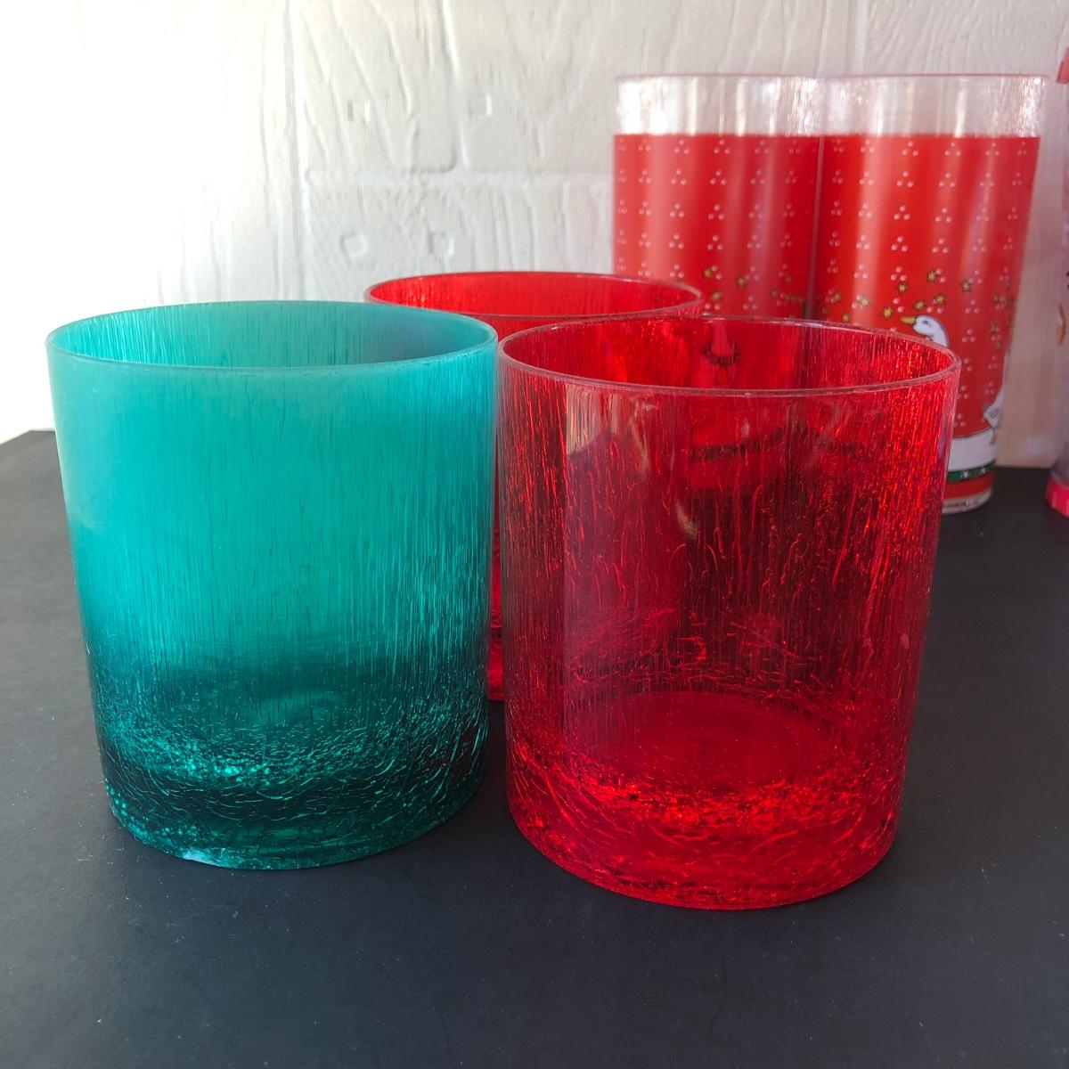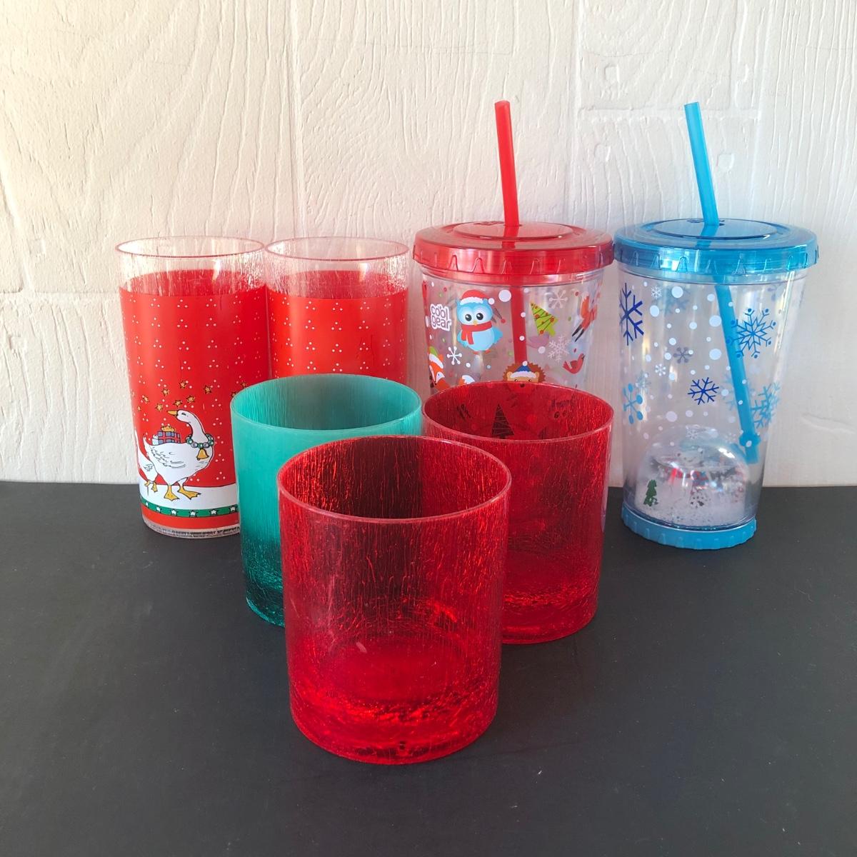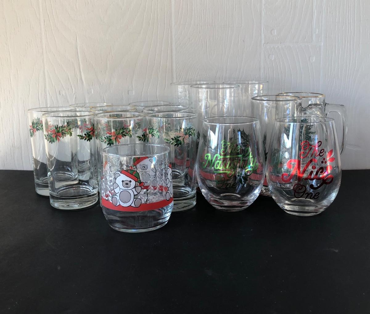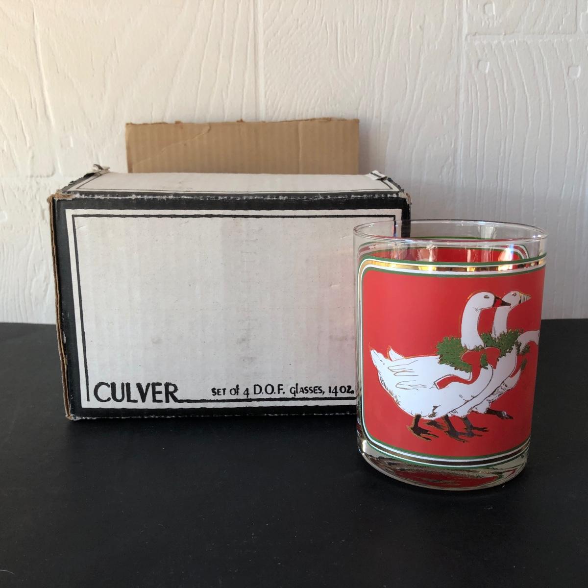 LOT 163B: Christmas Glasses & Plastic Cups - Libbey Holly Rim Glasses, Culver Goose Double Old Fashioned Glasses in Box & More