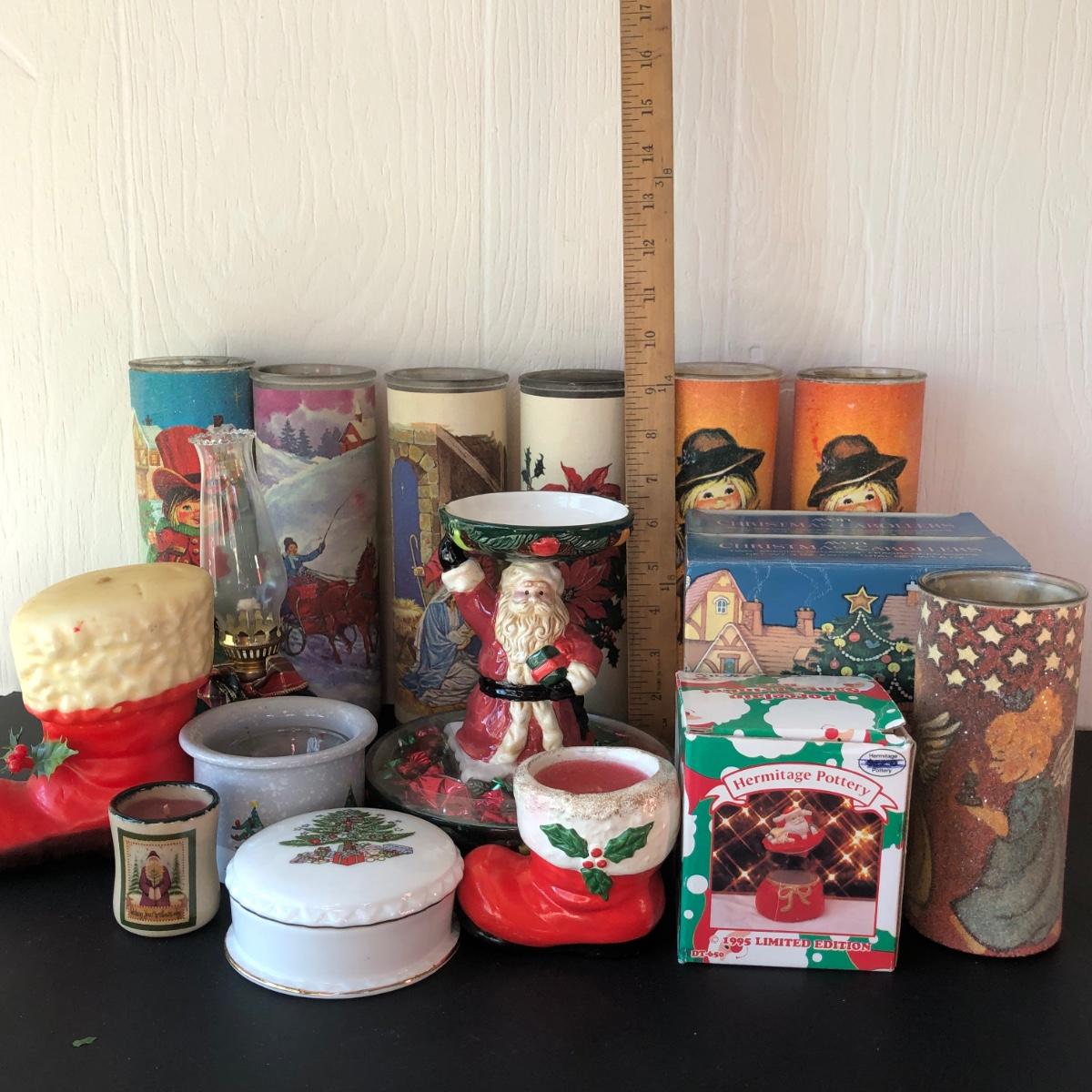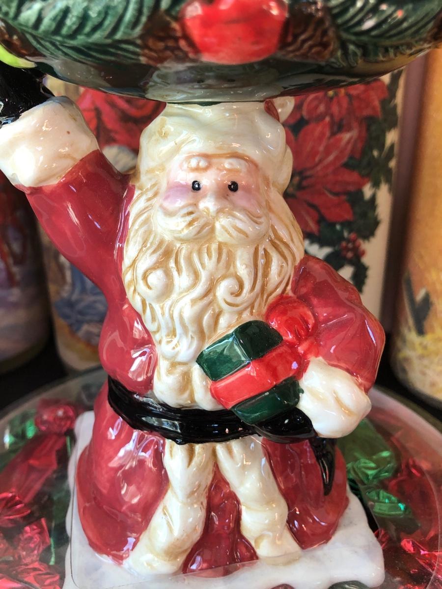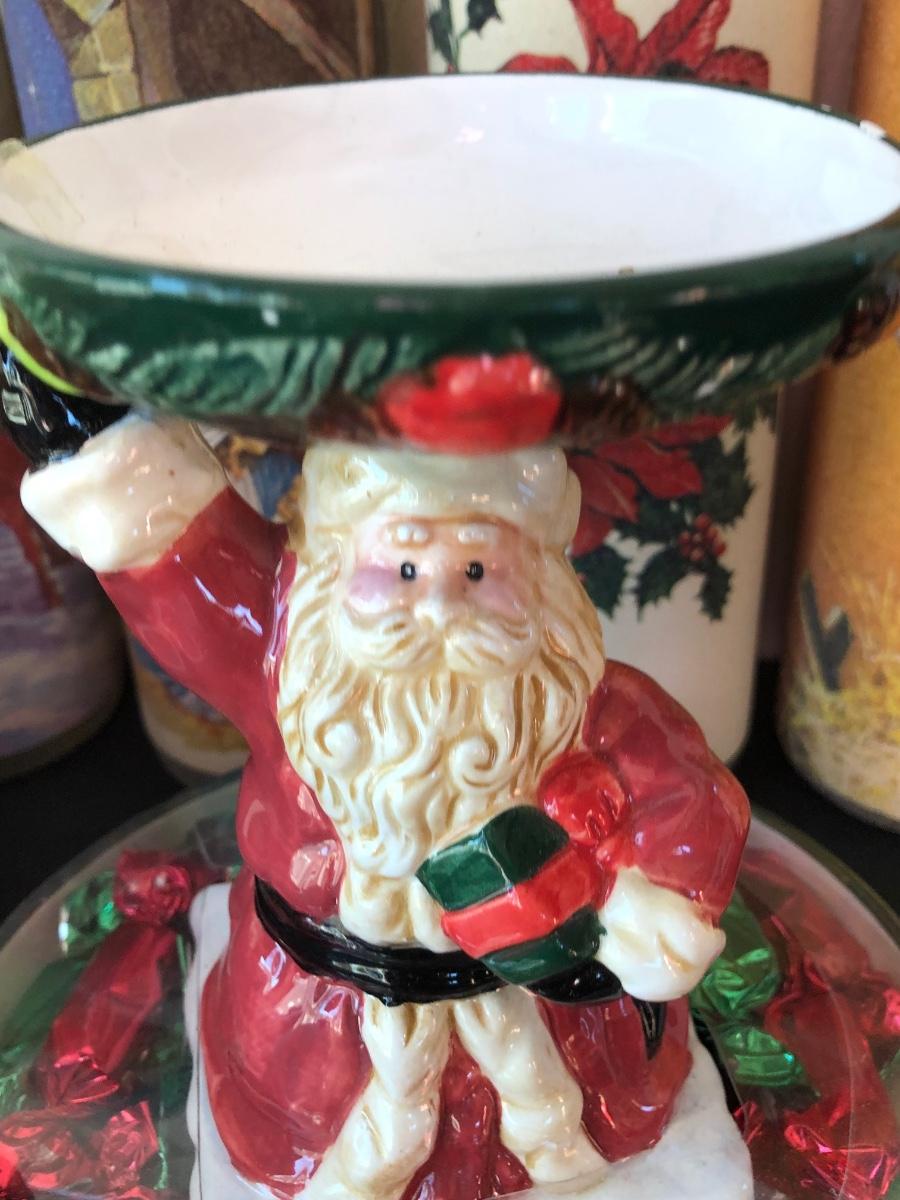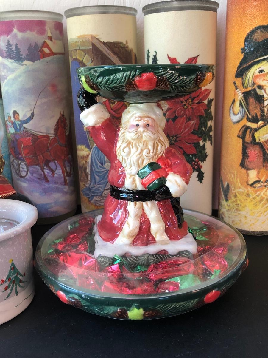 LOT 168G: Vintage Christmas Decor - 1995 LE Hermitage Pottery Santa Trinket Dish, 2-Tier Santa Candy Dish, Avon Christmas Carolers Soap, Candles & More