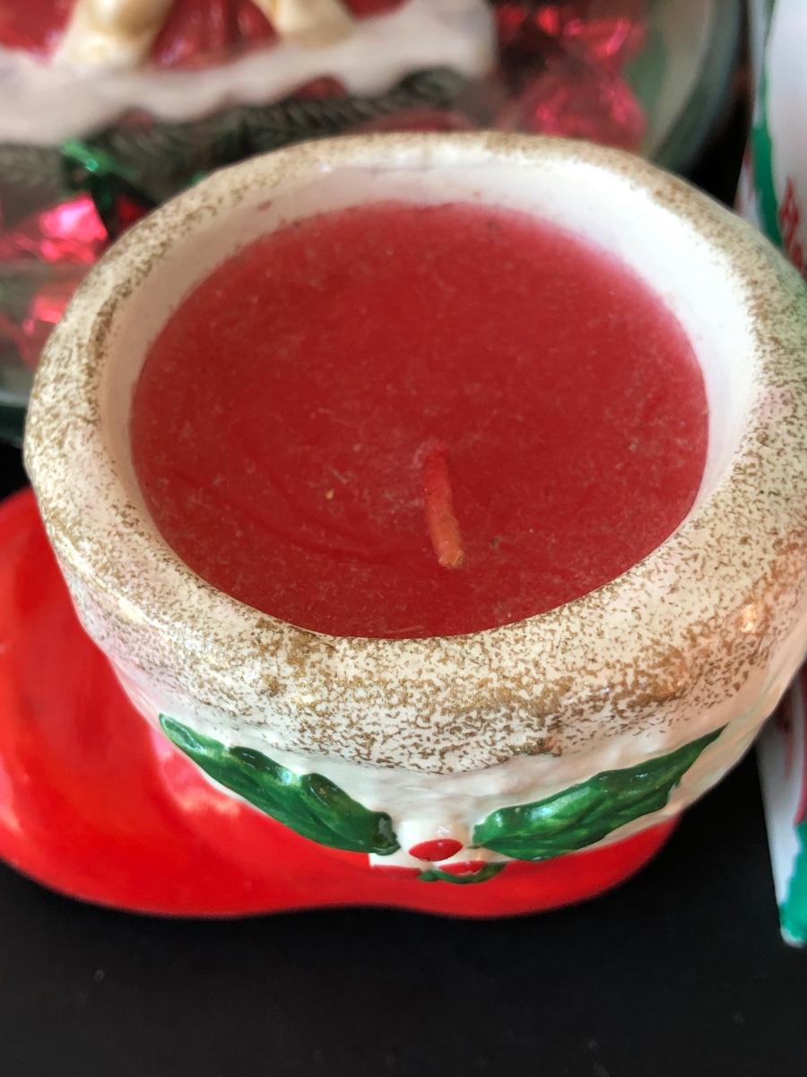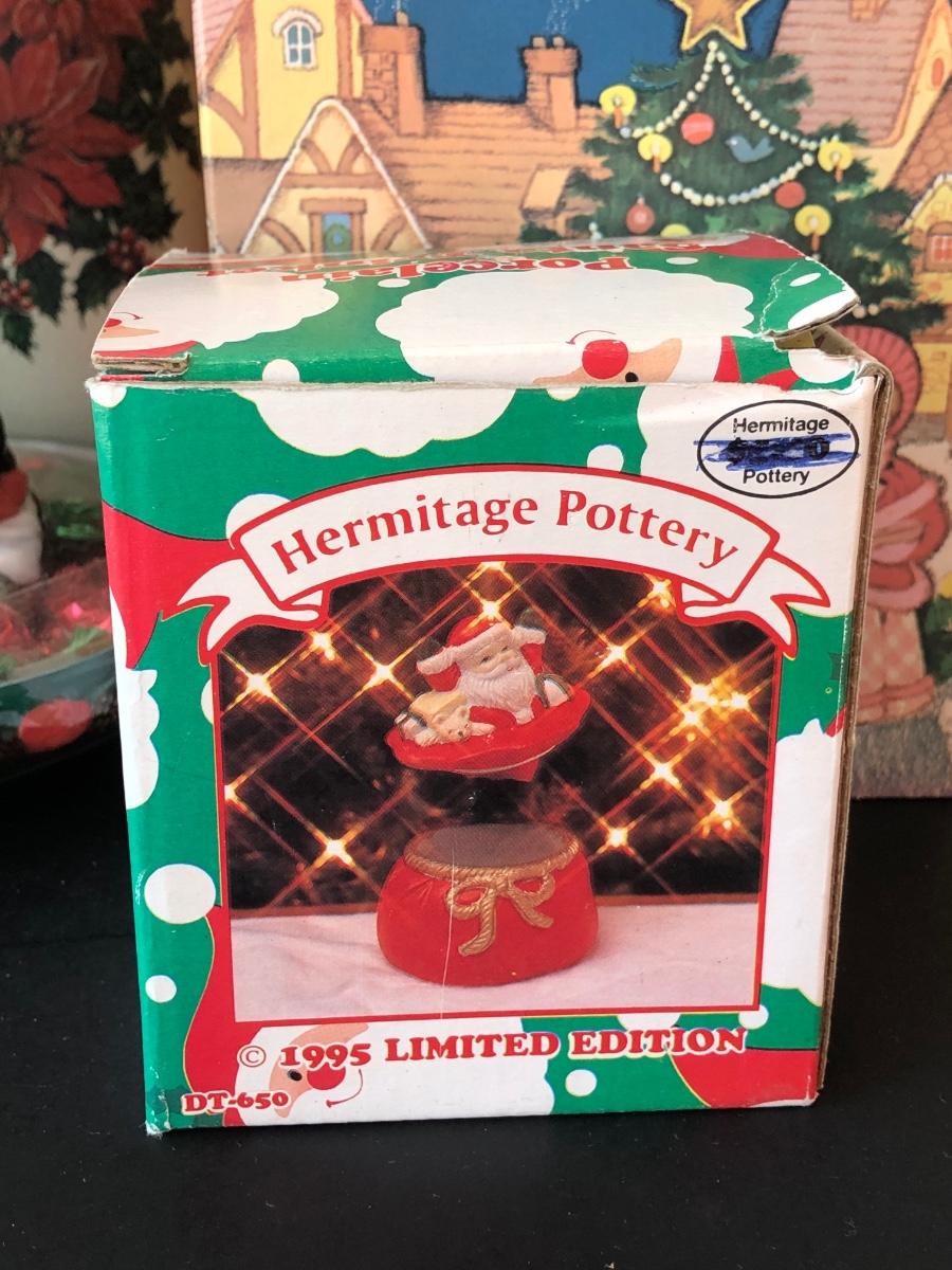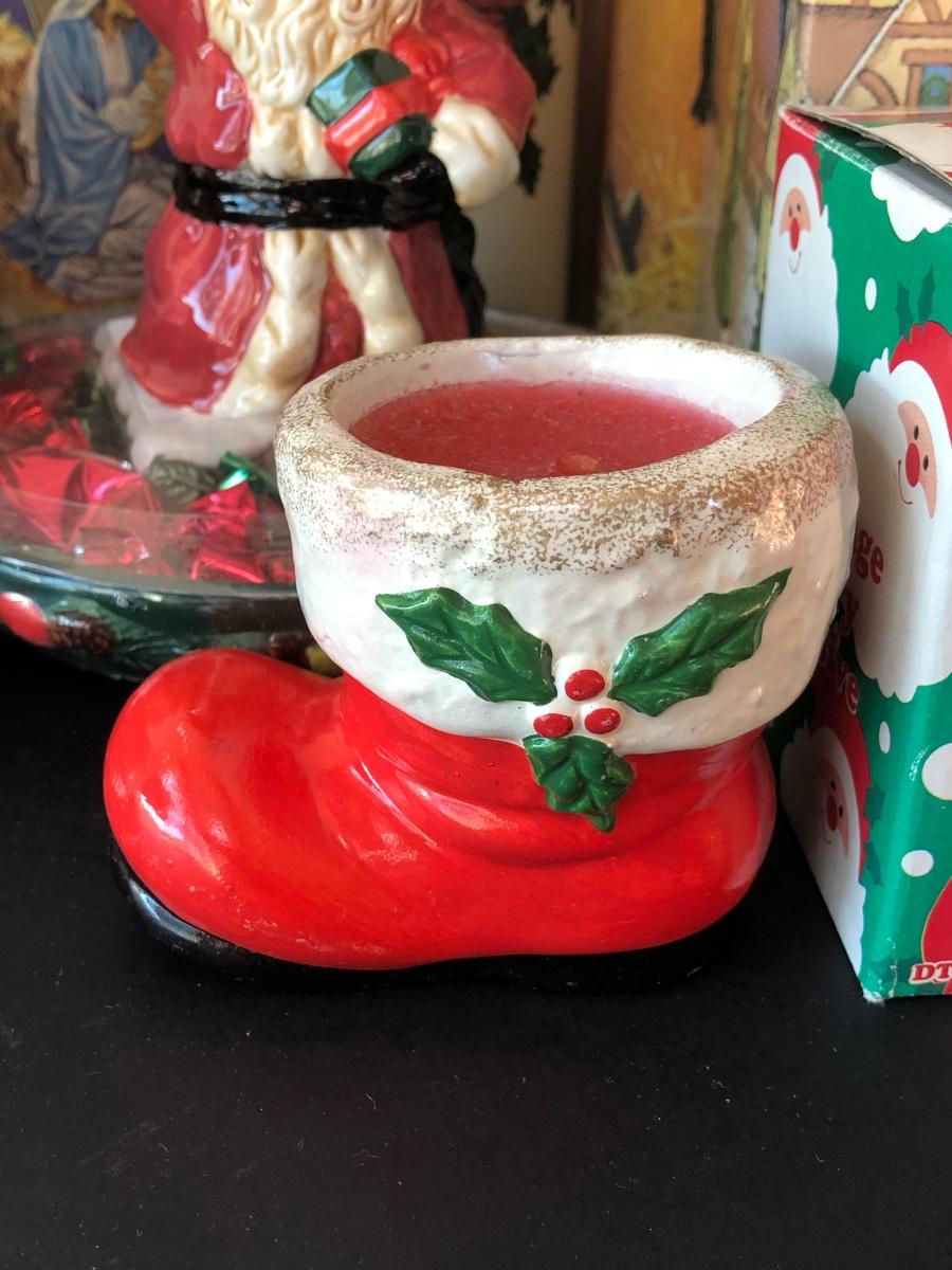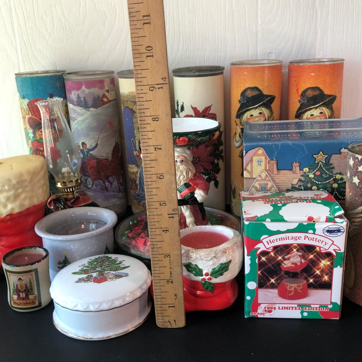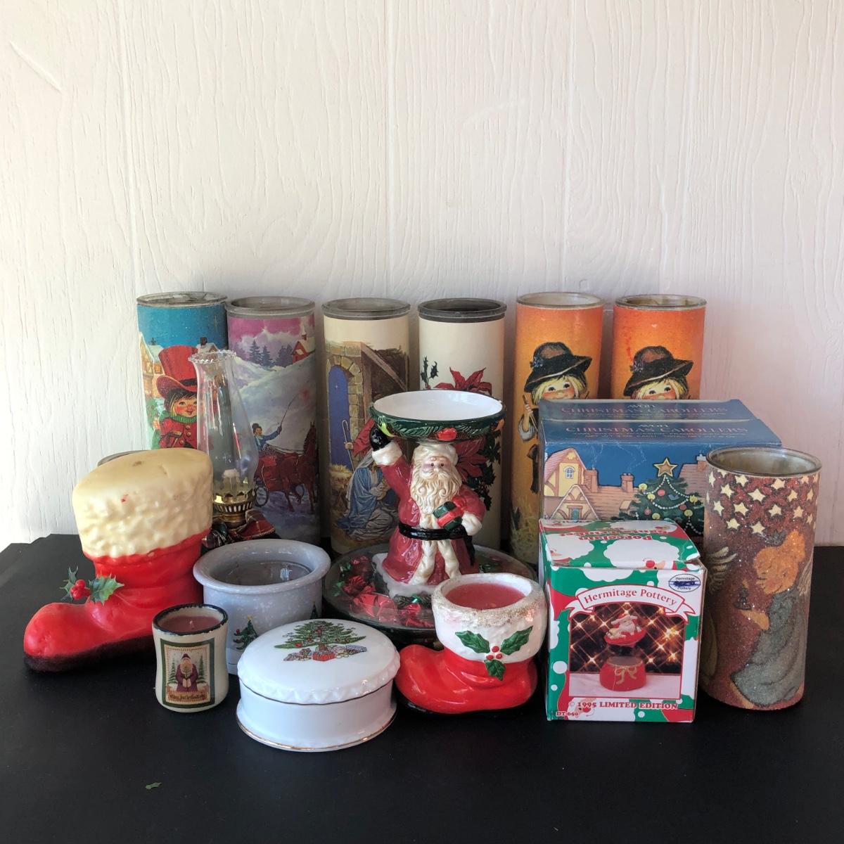 LOT 168G: Vintage Christmas Decor - 1995 LE Hermitage Pottery Santa Trinket Dish, 2-Tier Santa Candy Dish, Avon Christmas Carolers Soap, Candles & More