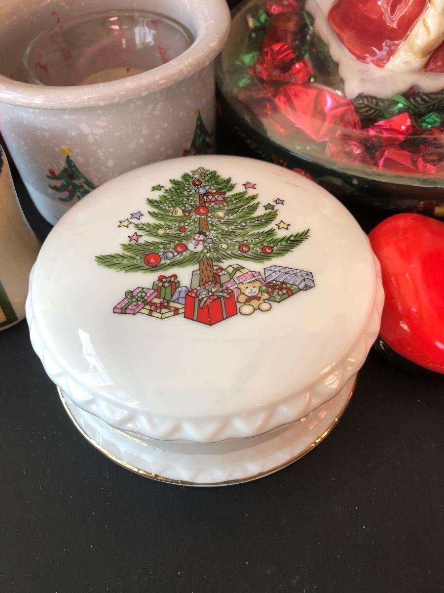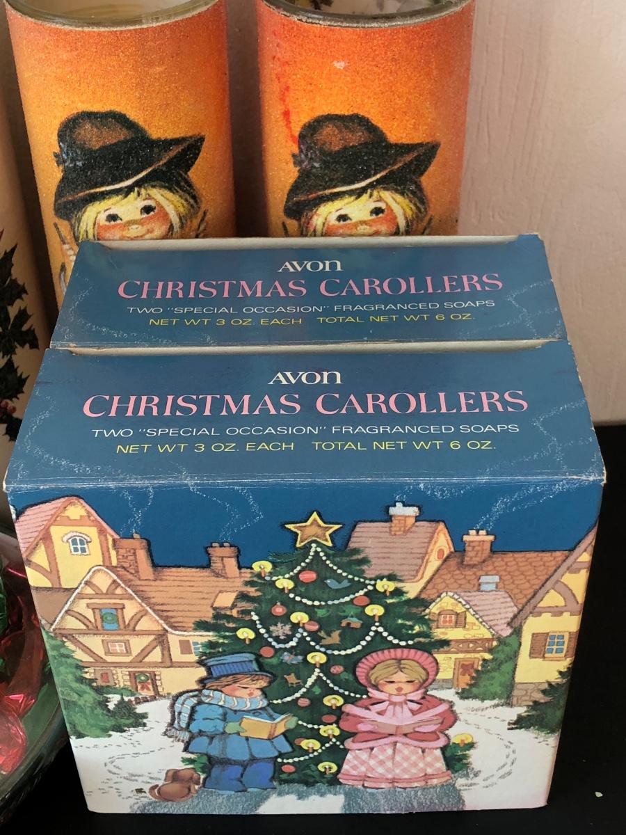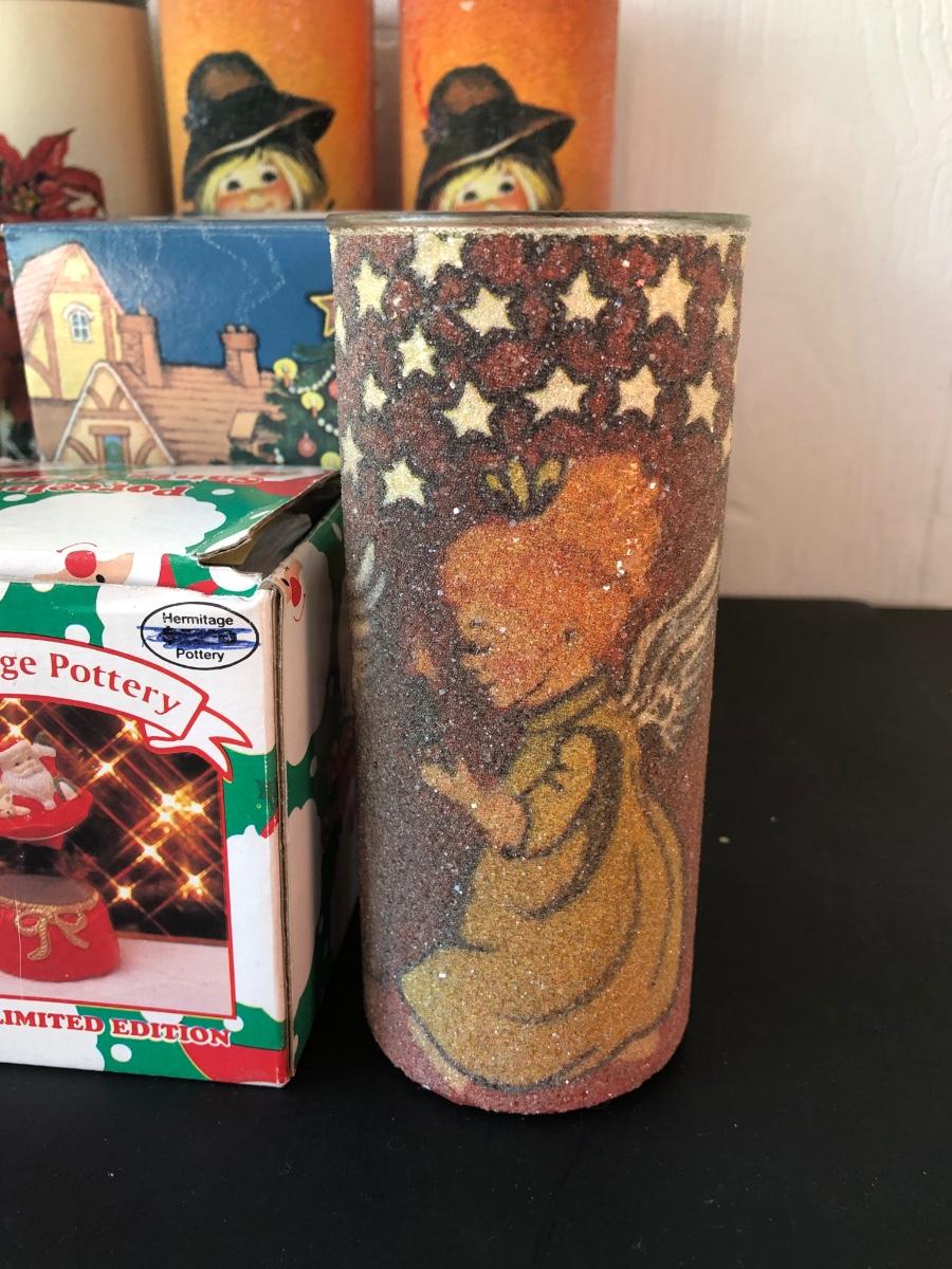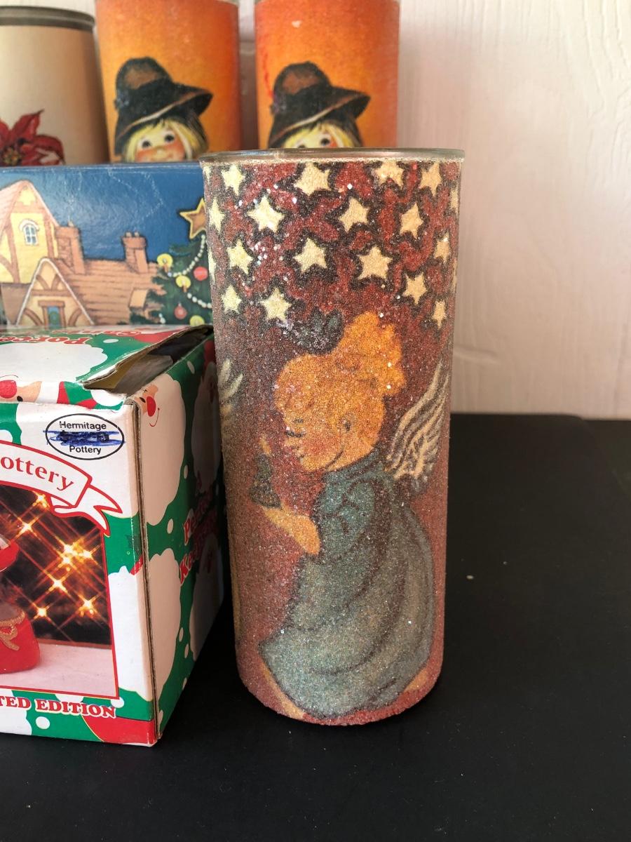 LOT 168G: Vintage Christmas Decor - 1995 LE Hermitage Pottery Santa Trinket Dish, 2-Tier Santa Candy Dish, Avon Christmas Carolers Soap, Candles & More