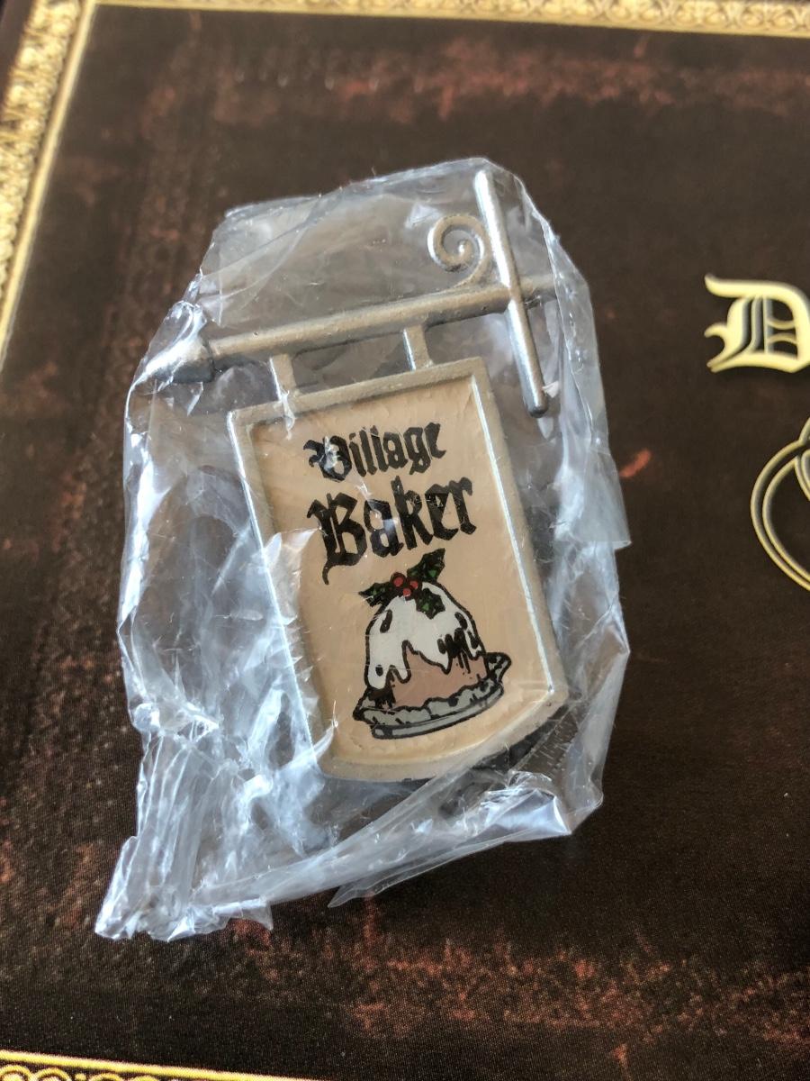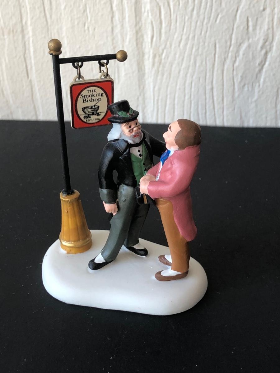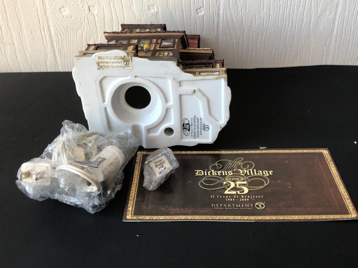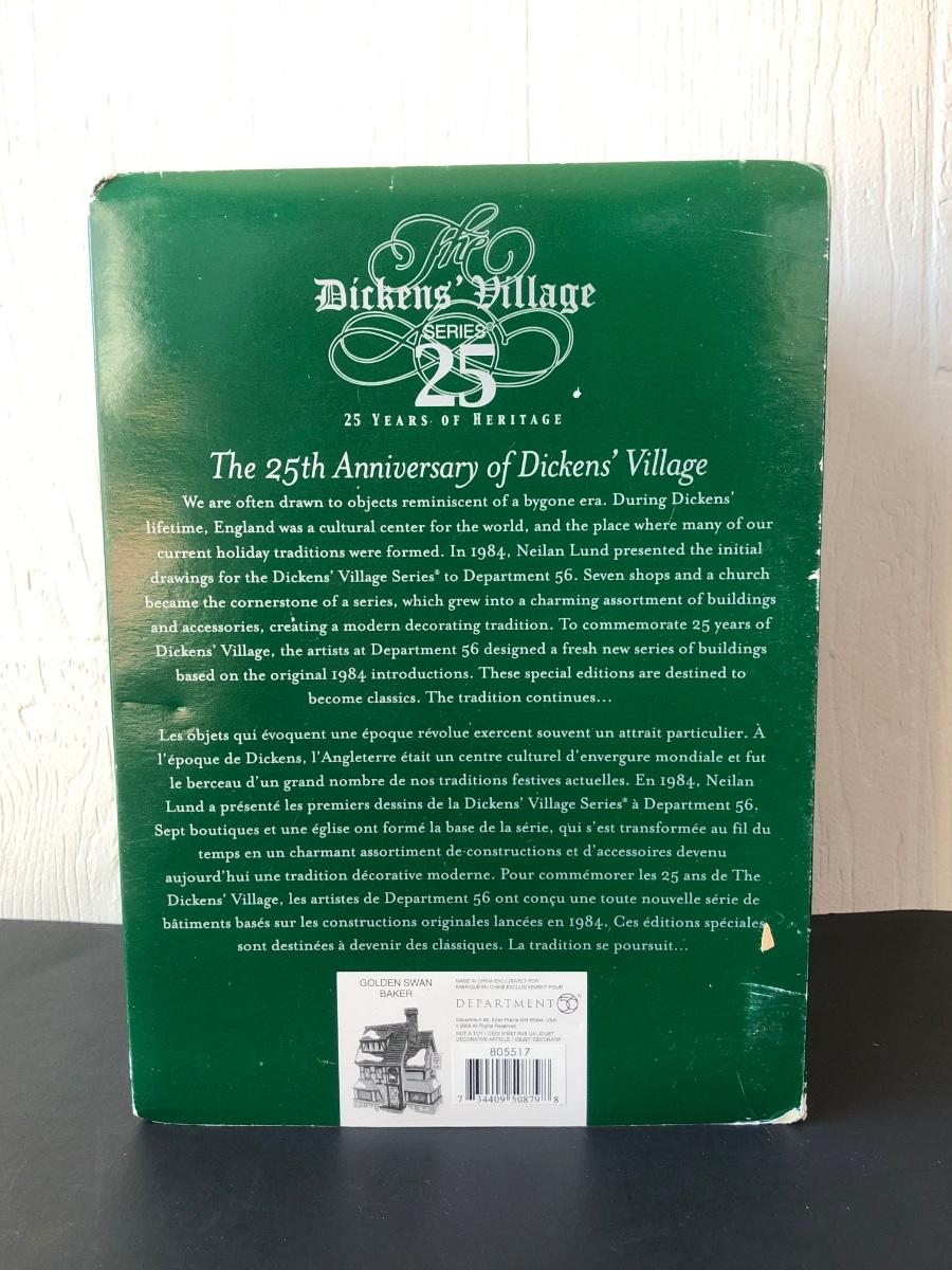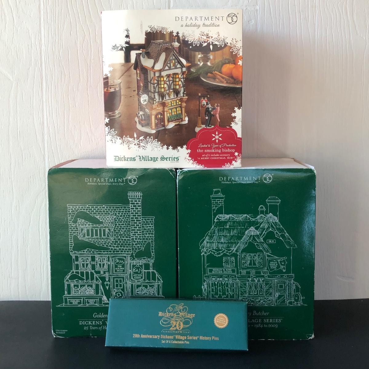 LOT 171G: Department 56 Dickens' Village 25th Anniversary - Golden Swan Baker (805517) & Abel Beesley Butcher (805516) w/ LE Smoking Bishop (4023612) & 20th Anniversary Pins