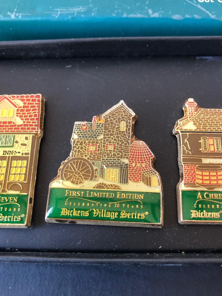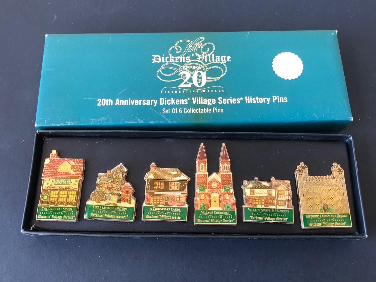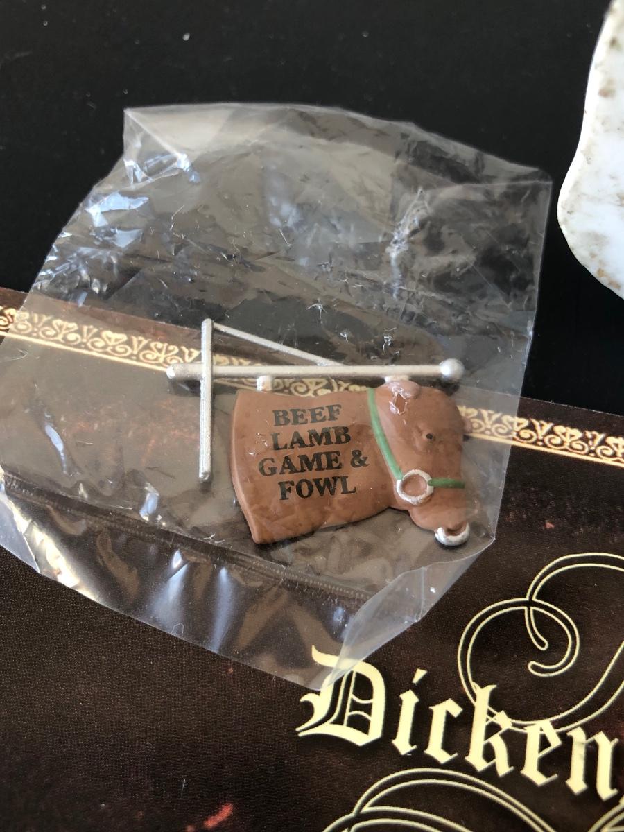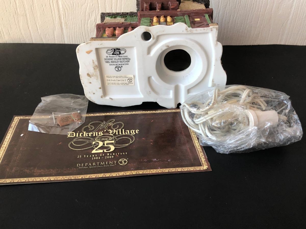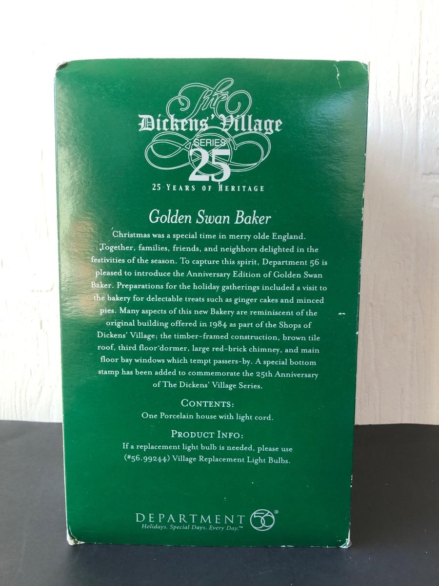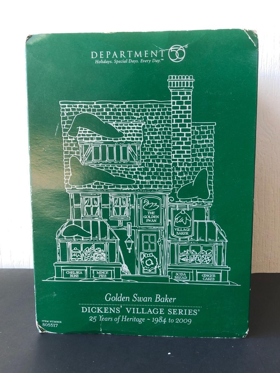 LOT 171G: Department 56 Dickens' Village 25th Anniversary - Golden Swan Baker (805517) & Abel Beesley Butcher (805516) w/ LE Smoking Bishop (4023612) & 20th Anniversary Pins