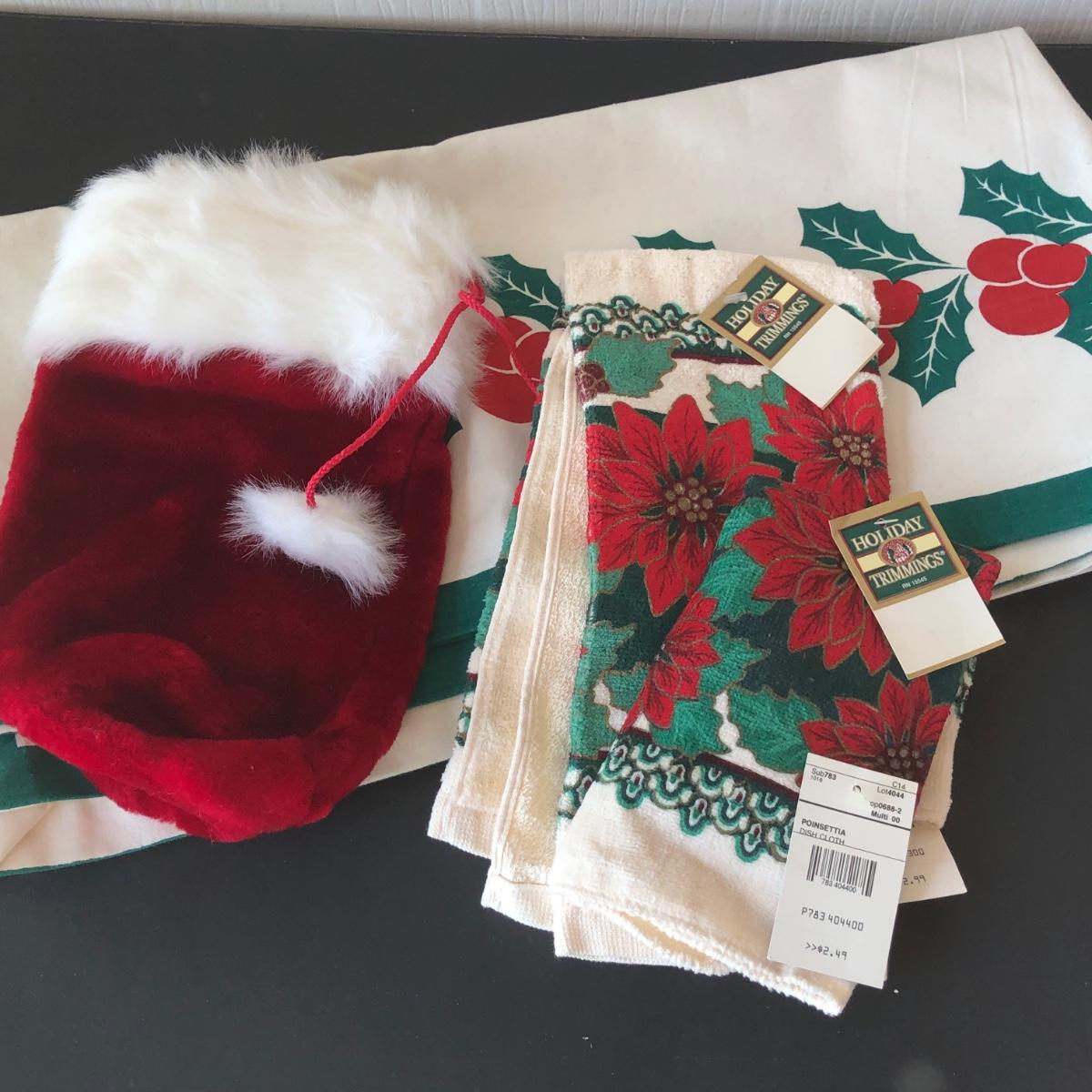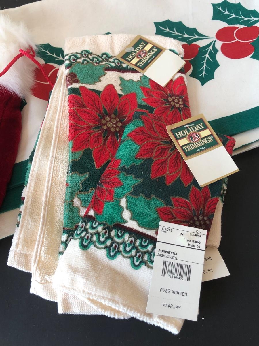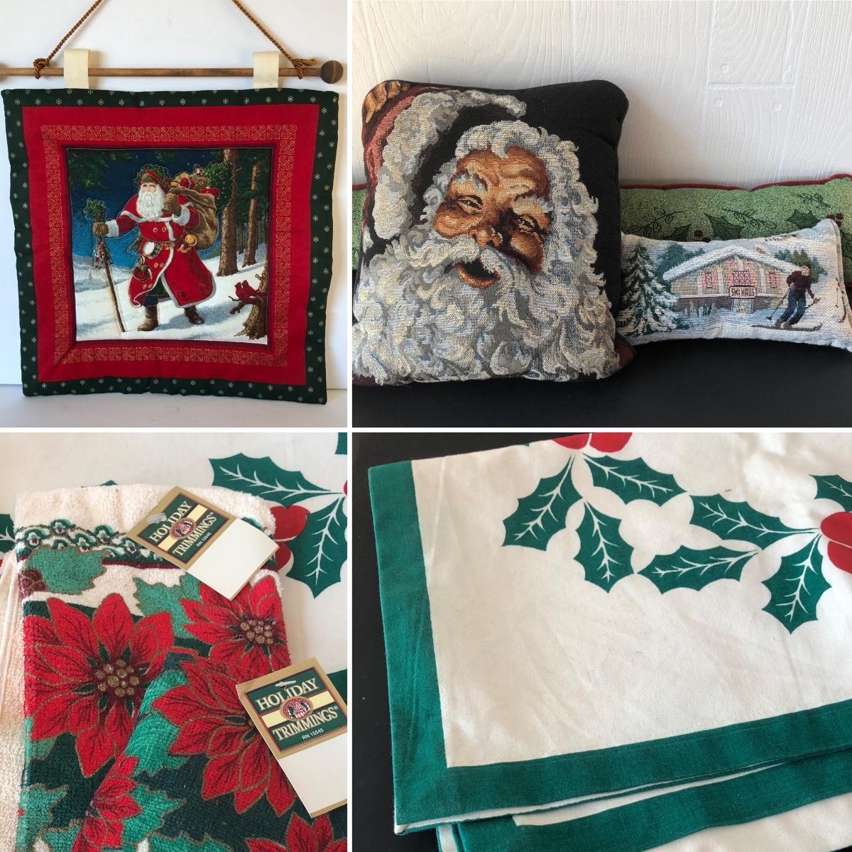 LOT 245F: Christmas Pillows, Tablecloth, Hanging Decor & Kitchen Towels w/ Tags