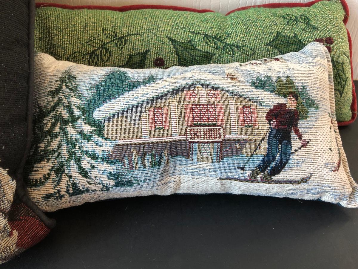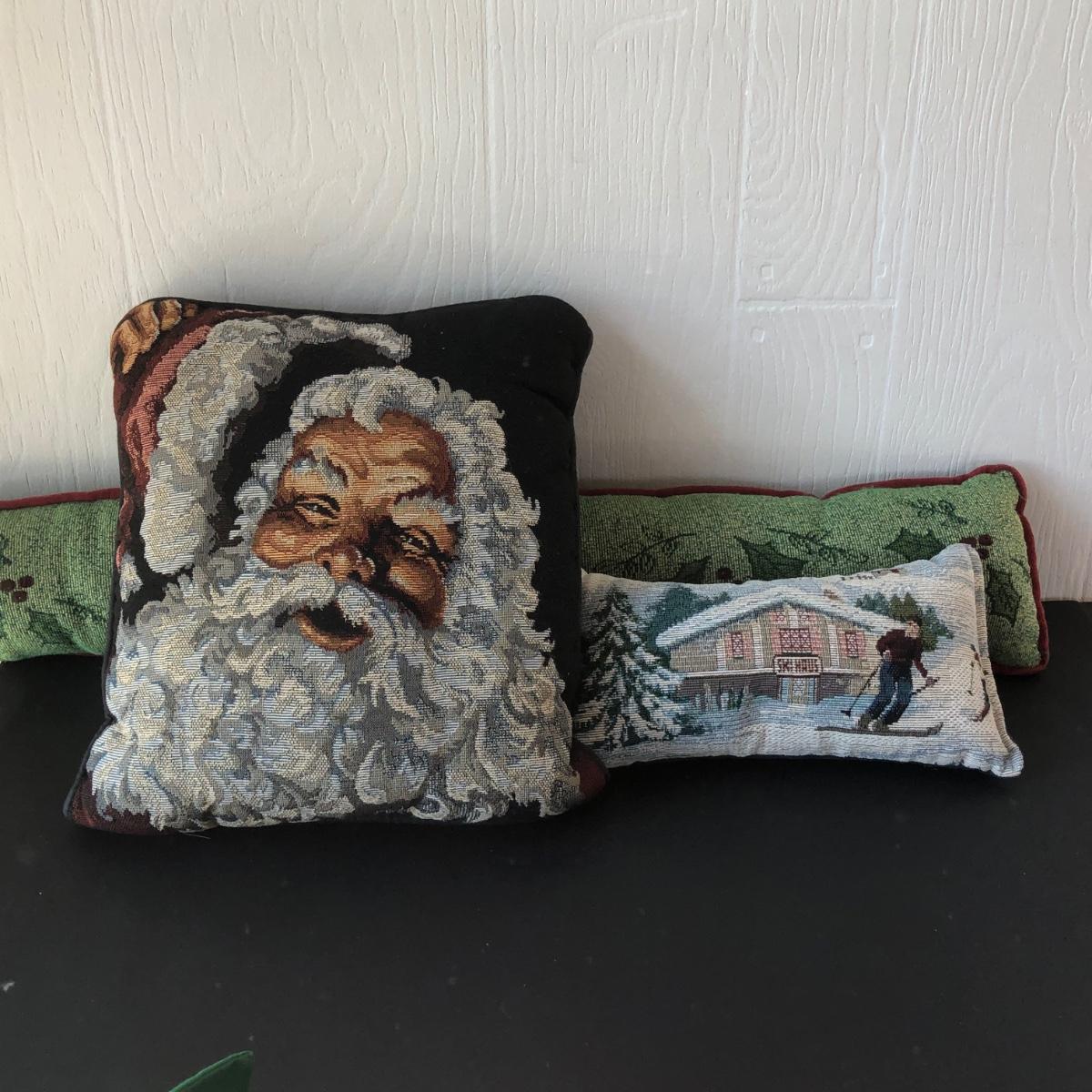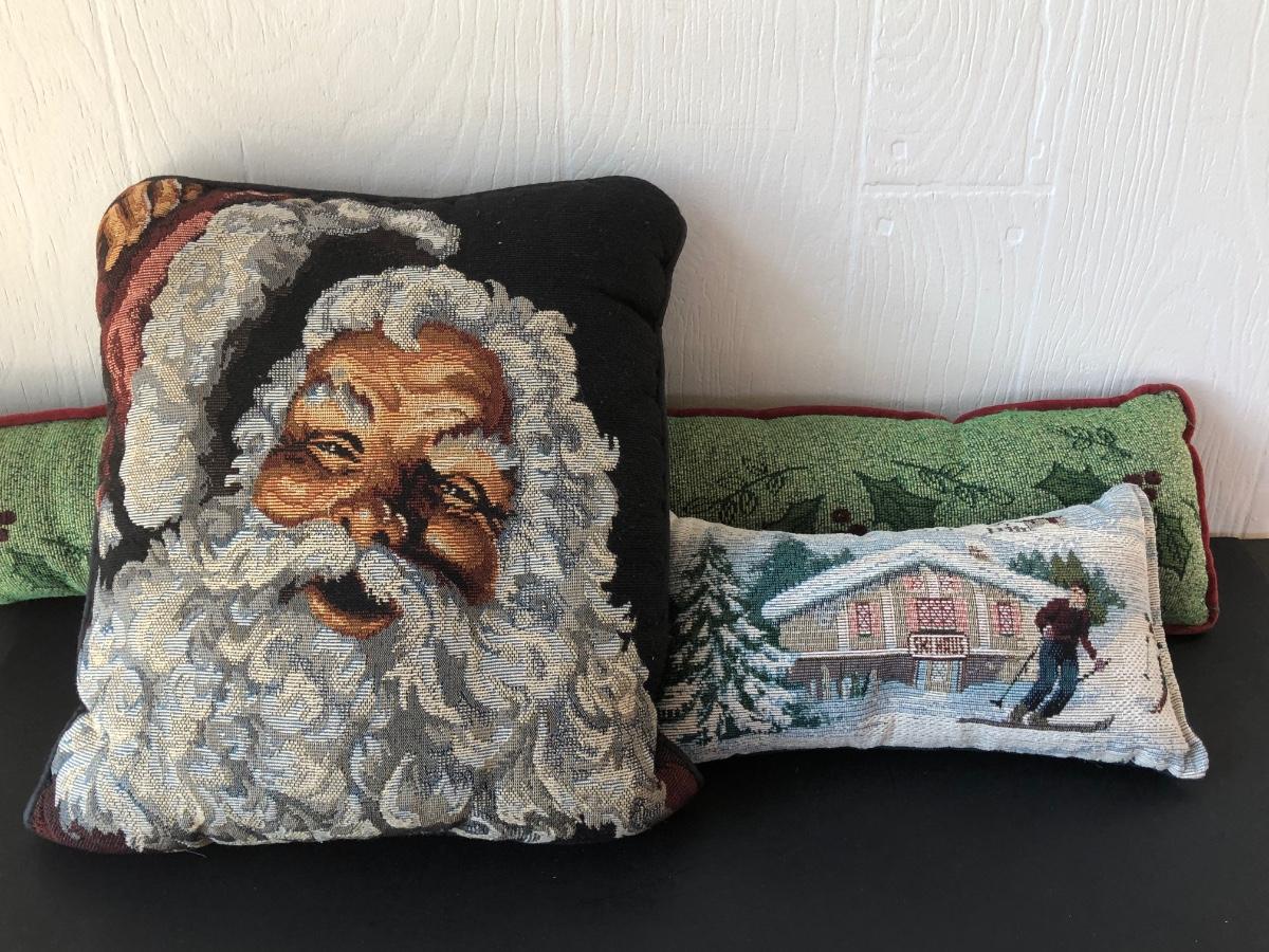 LOT 245F: Christmas Pillows, Tablecloth, Hanging Decor & Kitchen Towels w/ Tags