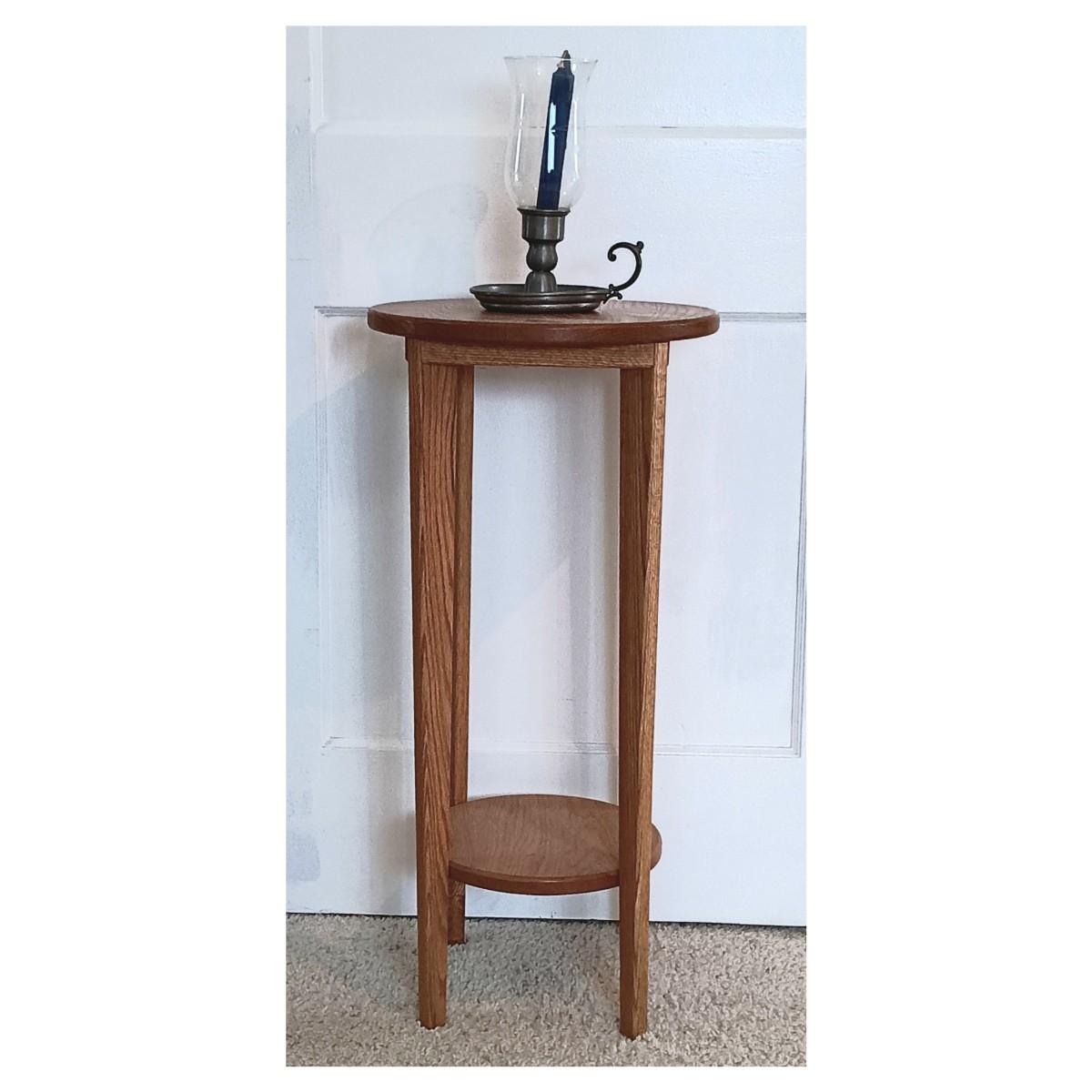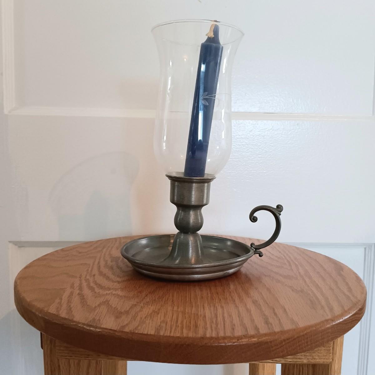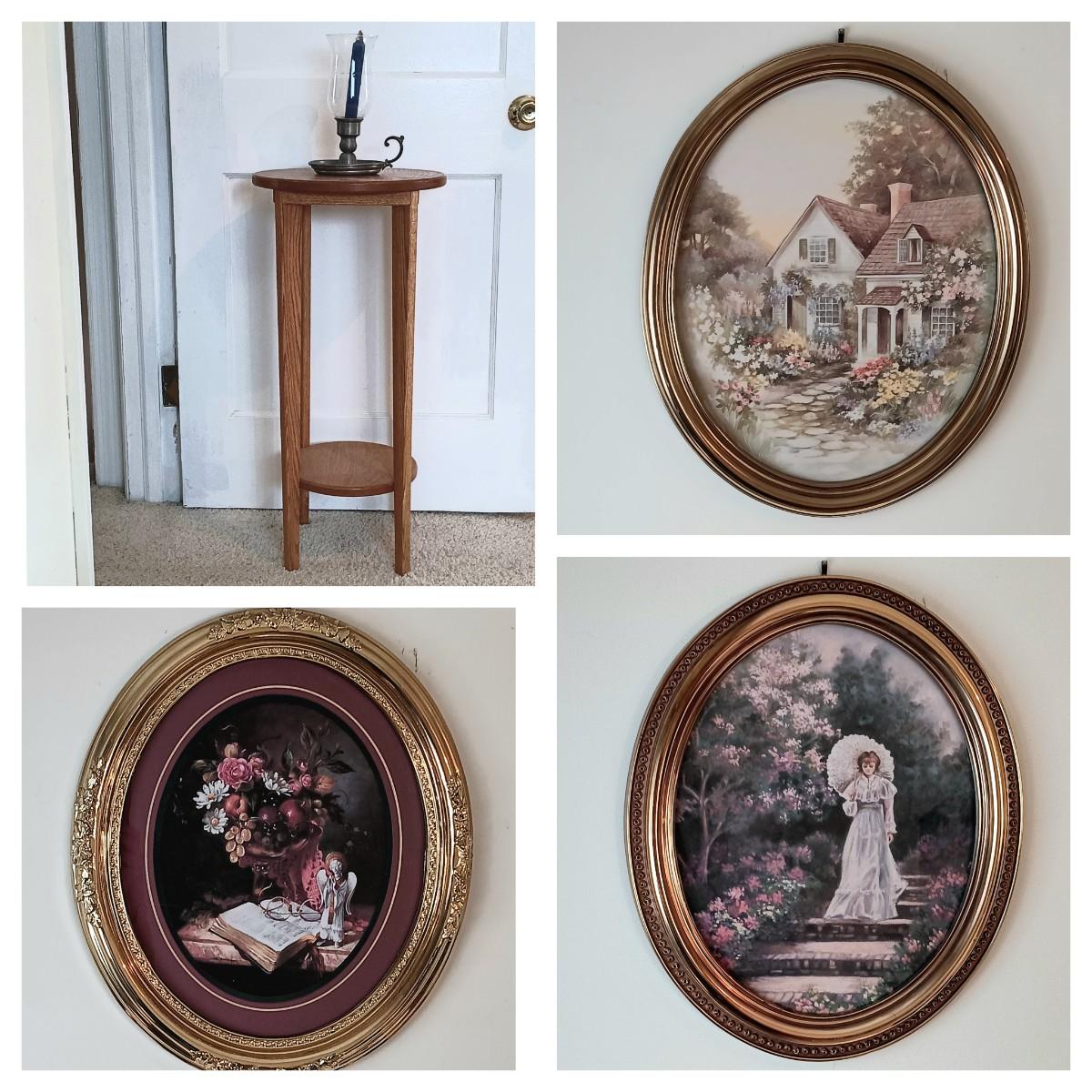 LOT 6U: Round Side Table w/ Pewter Candle Lamp & 3 Framed Prints