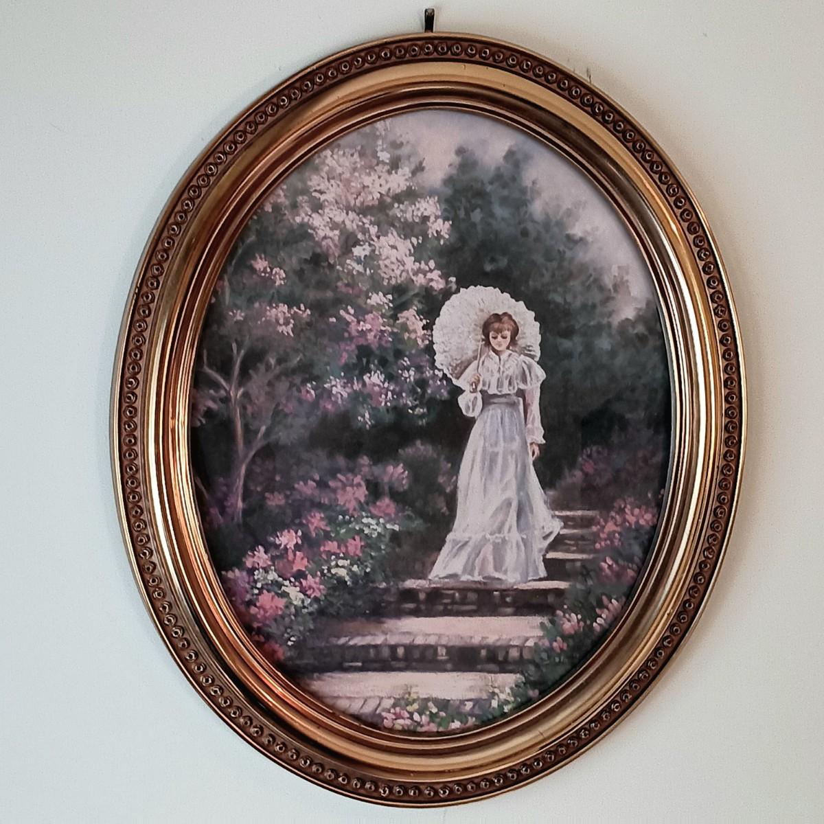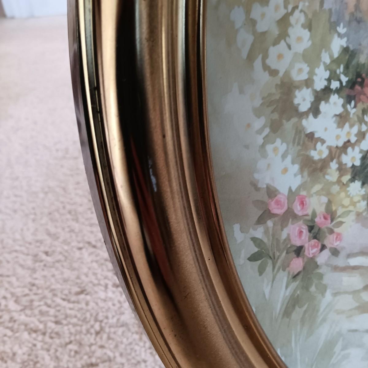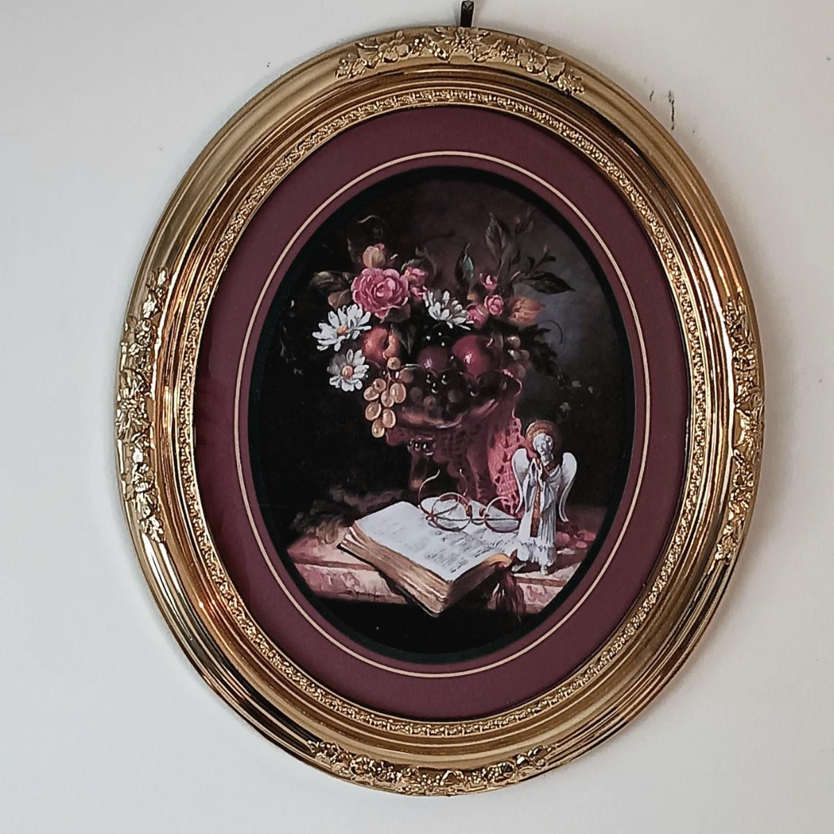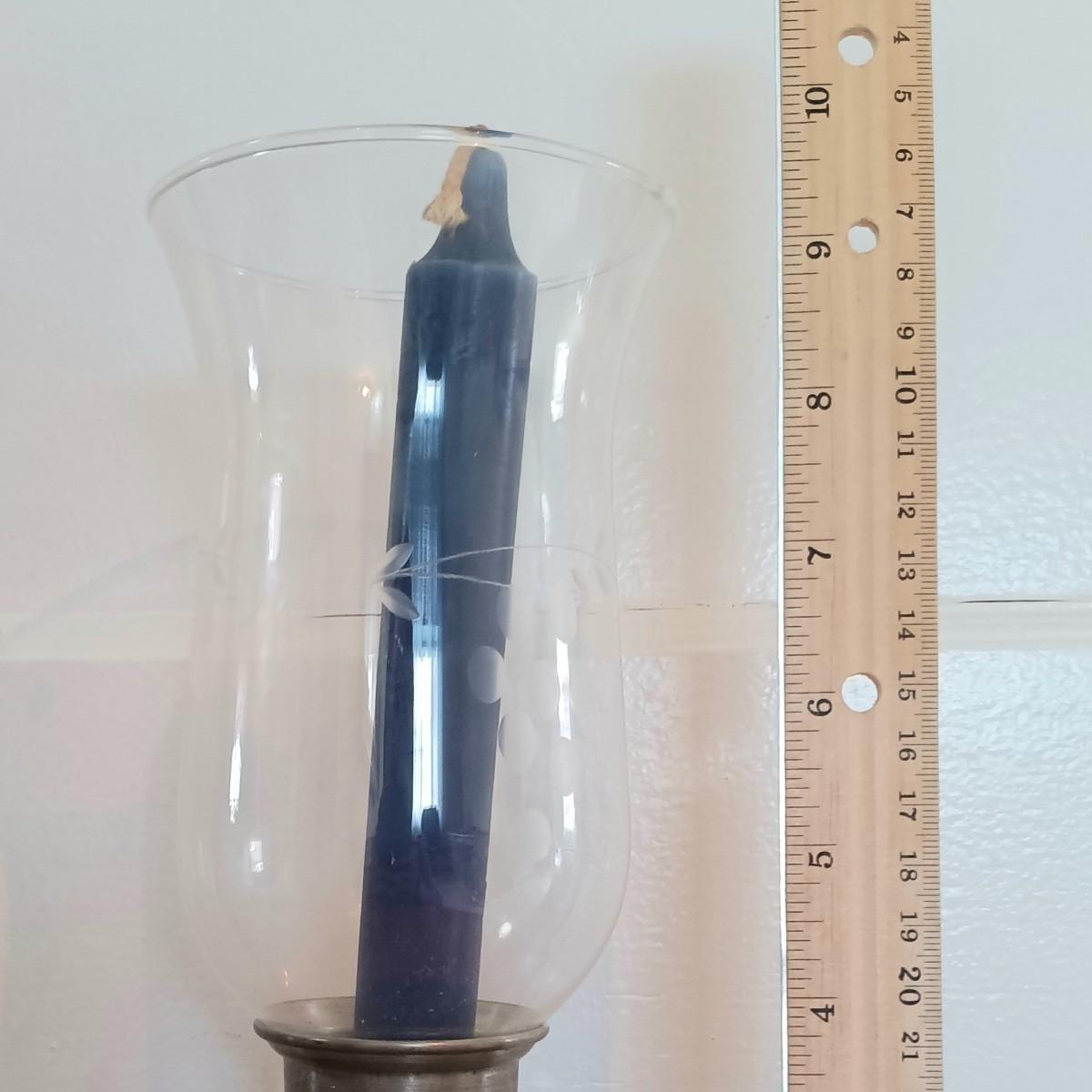 LOT 6U: Round Side Table w/ Pewter Candle Lamp & 3 Framed Prints