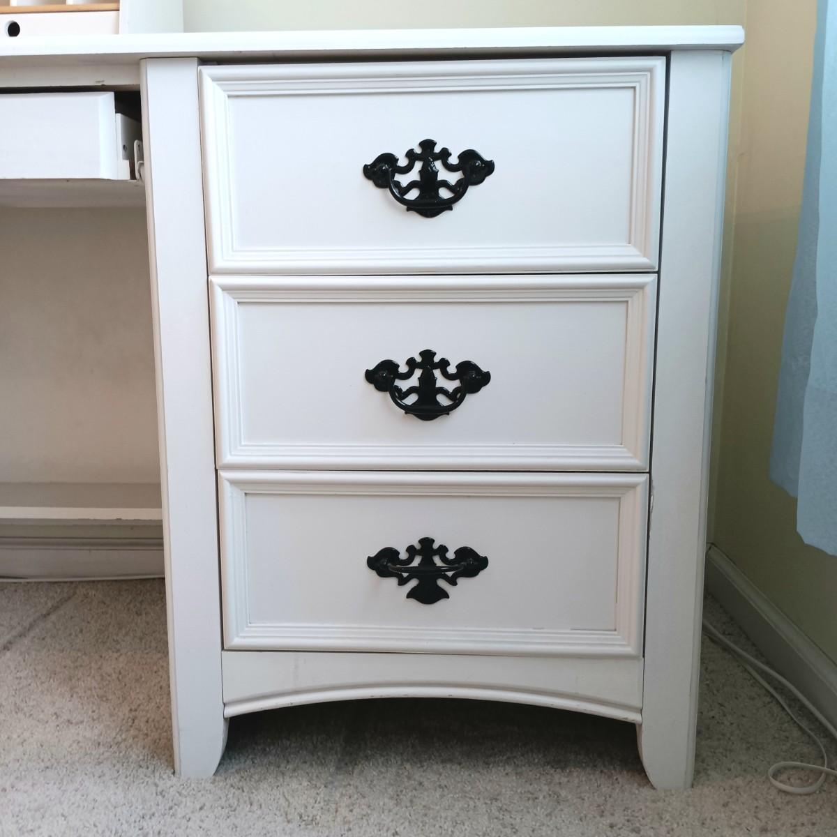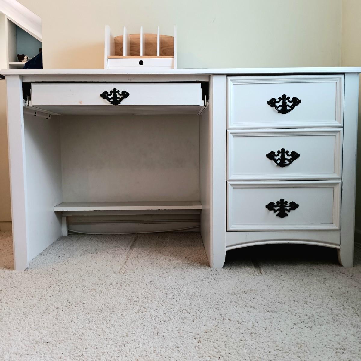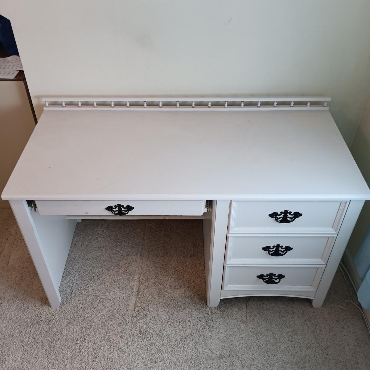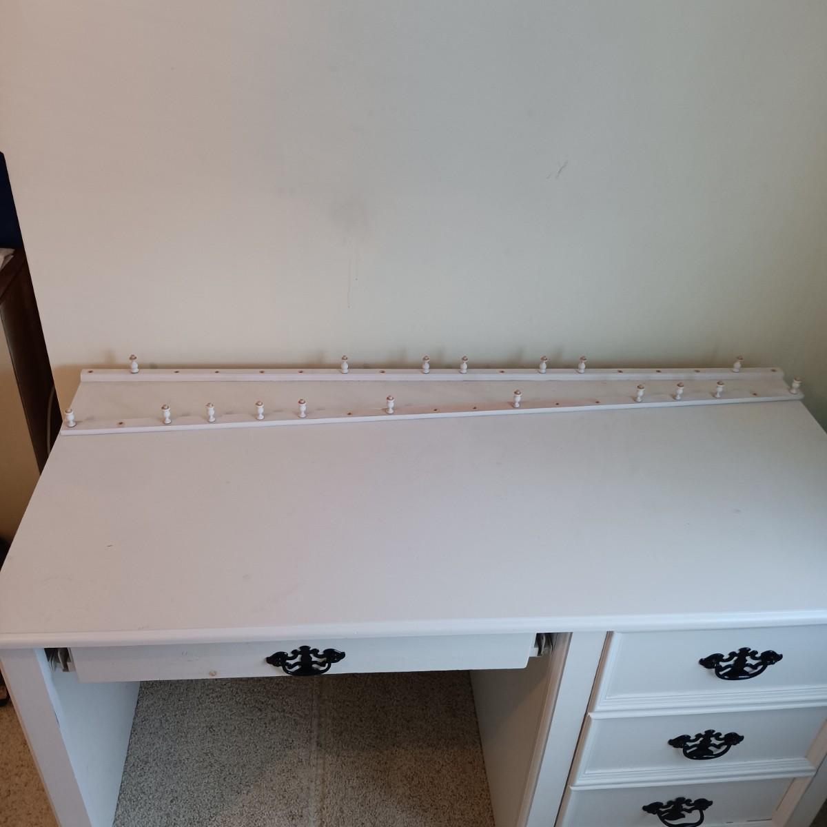 The rail on the back of the desk comes off easily. The wooden pegs have been stored in a drawer for day of pickup.